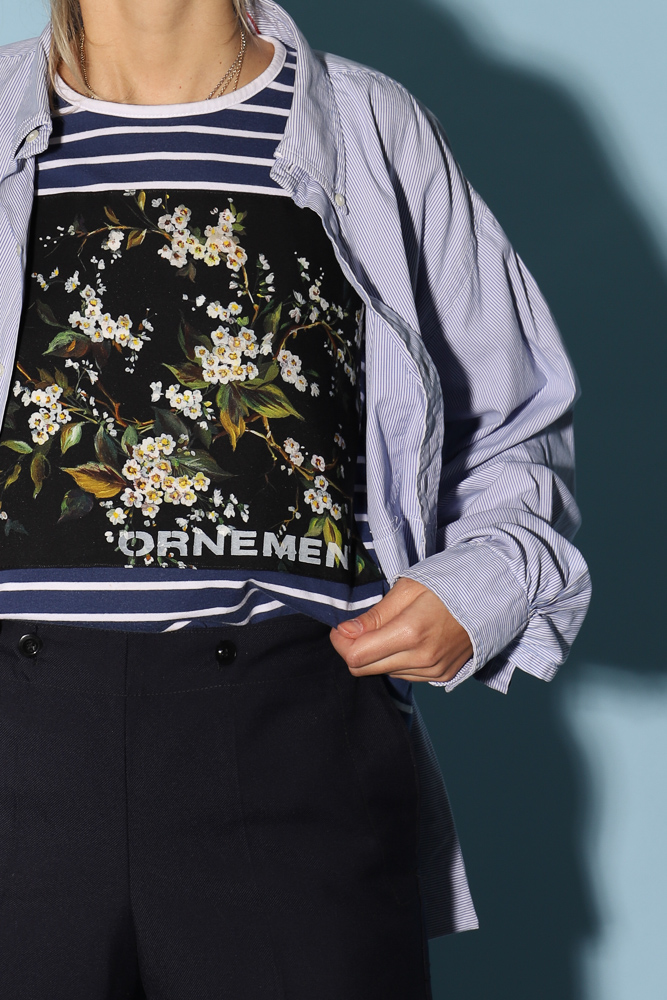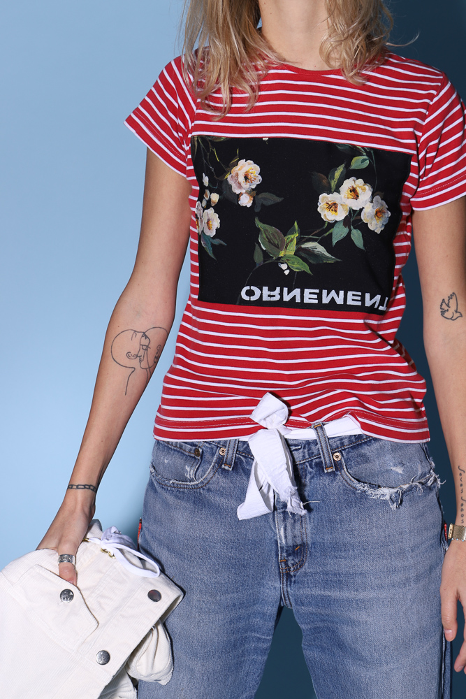 Découvrez aujourd’hui l’univers d’Ornement, marque d’upcycling spécialisée dans la customisation de vêtements vintage. Elle fabrique, dessine, édite et offre une seconde vie à ces vêtements en les réparant, en les customisant et en leur donnant une esthétique plus contemporaine, le tout réalisé dans son atelier parisien. La volonté est ici de sensibiliser les gens à la surconsommation et au recyclage, tout en proposant un nouveau produit.