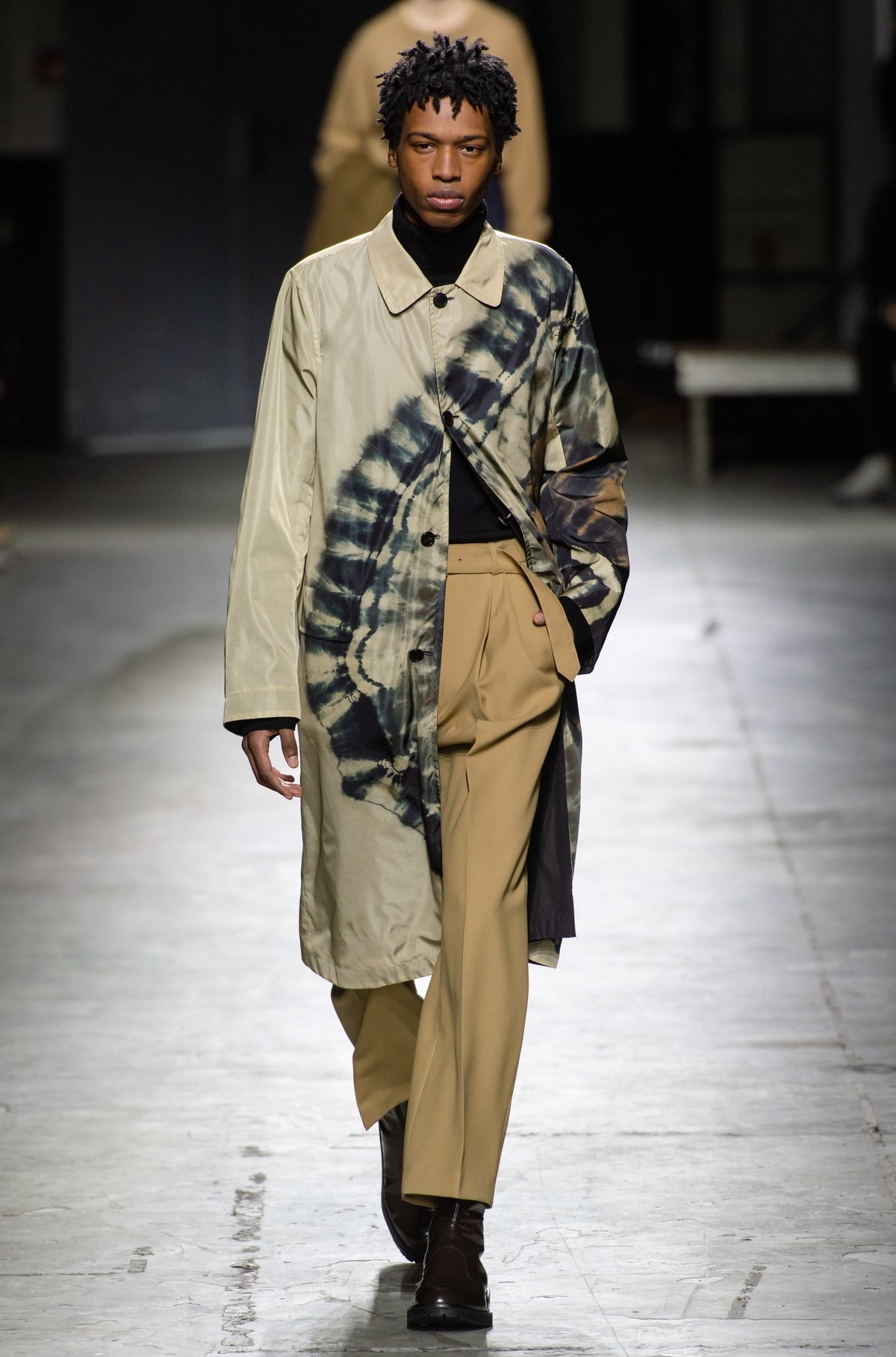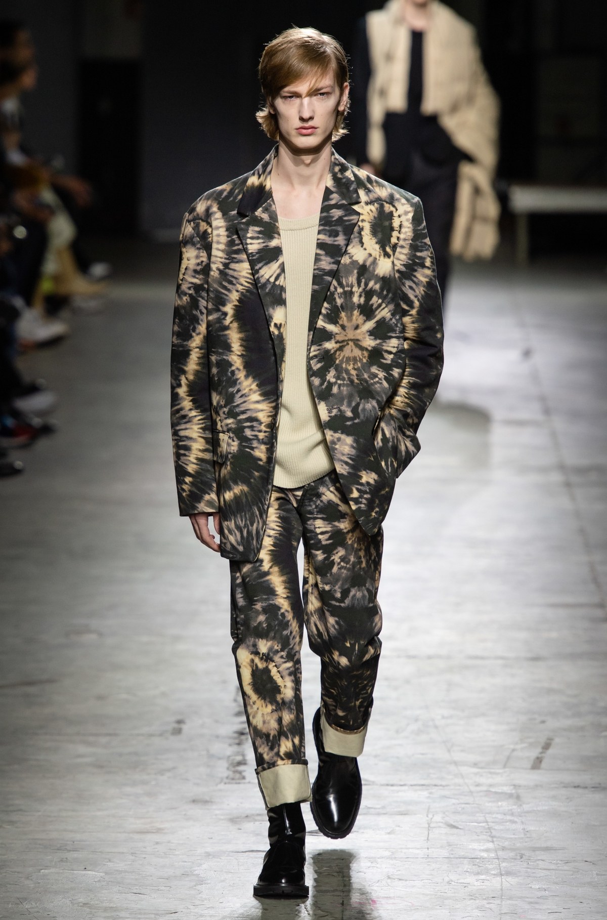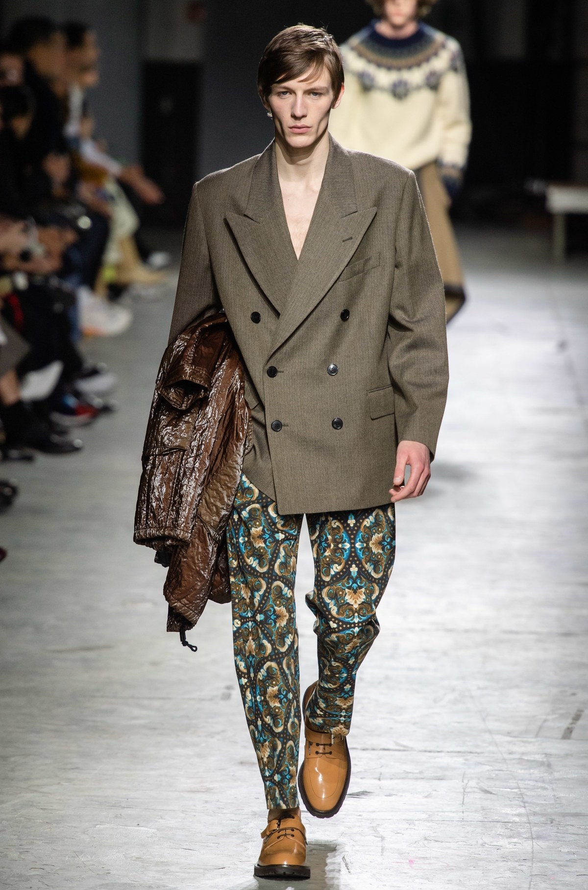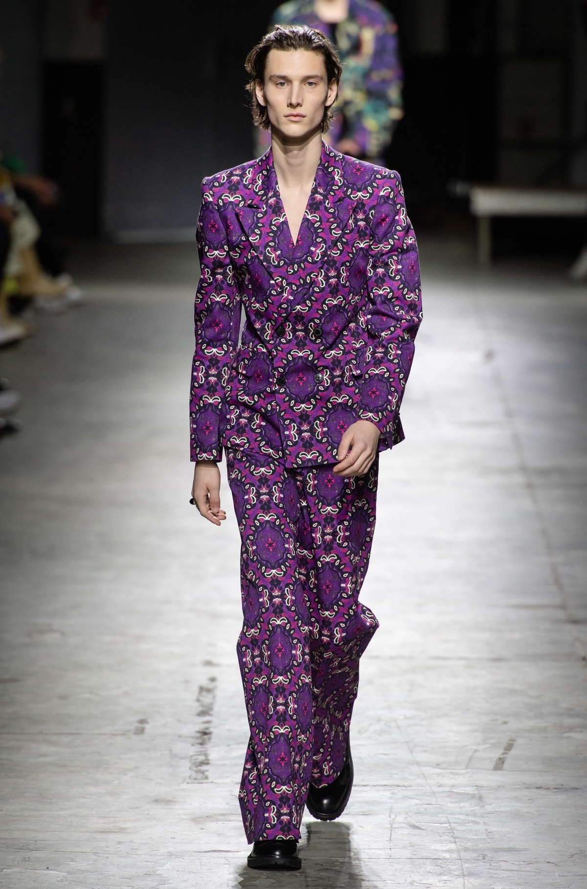 Le designer ne laisse rien au hasard. Notamment avec la bande son du défilé : une accumulation d’interviews de ses idoles, de David Bowie à Yves Saint Laurent en passant par David Hockney. Un choix qui vient soutenir un message fort : celui de s’habiller comme le héros que l’on veut être. Découvrez ci-dessous tous les looks du défilé homme automne-hiver 2019/2020 de Dries Van Noten.