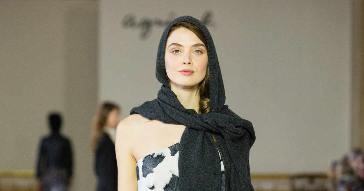 Pour cette collection hivernale, Agnès b. nous propose des silhouettes intemporelles à la douceur incroyable. C’est un hiver aux couleurs légères et aux imprimés étonnants. Les jupes se voient recouvertes d’arbres enneigés, et le motif phare du show s’avère être un rocher quadrillé de neige.