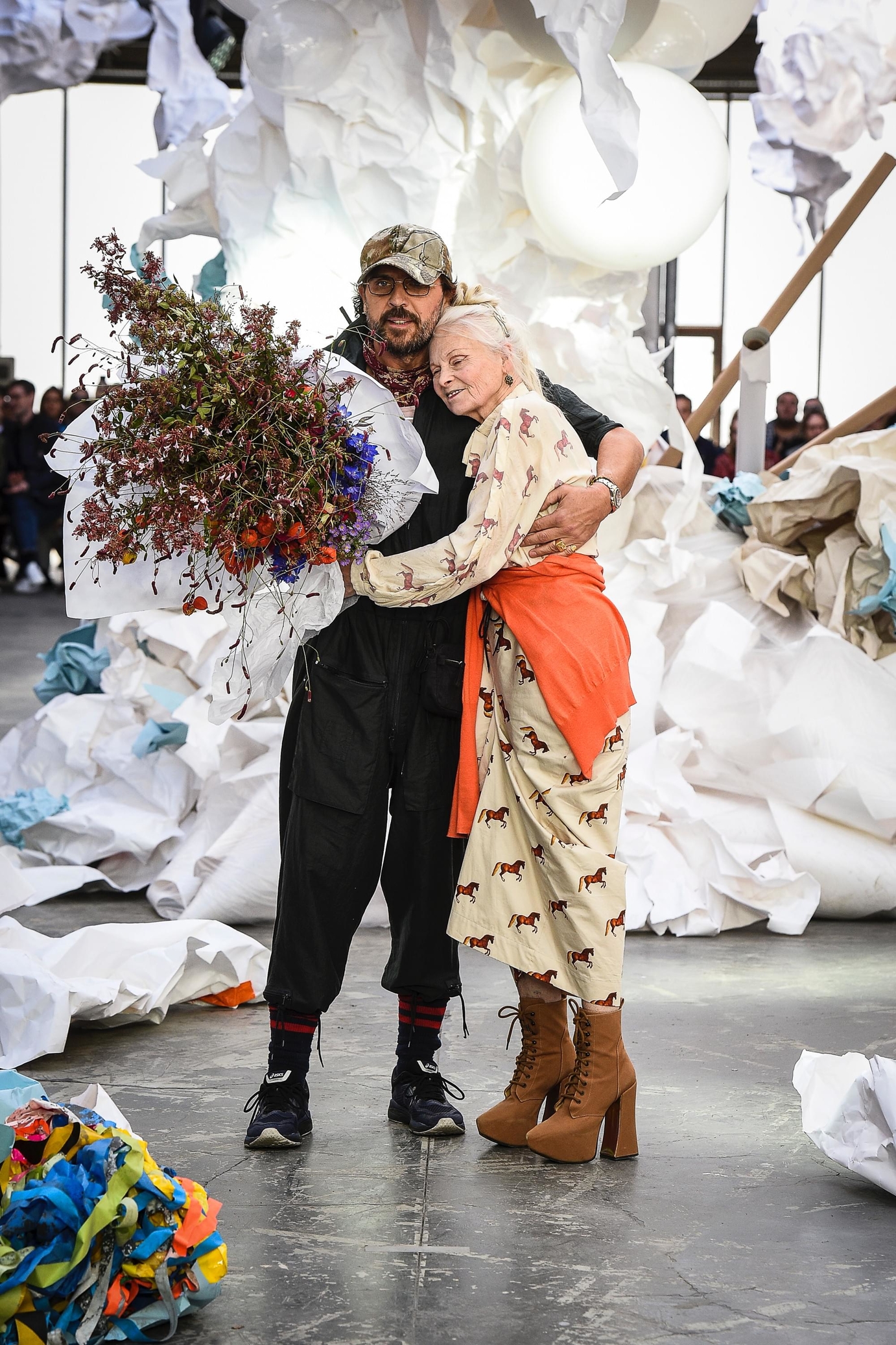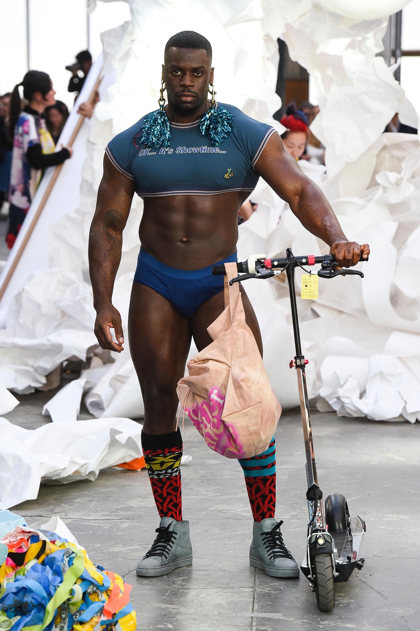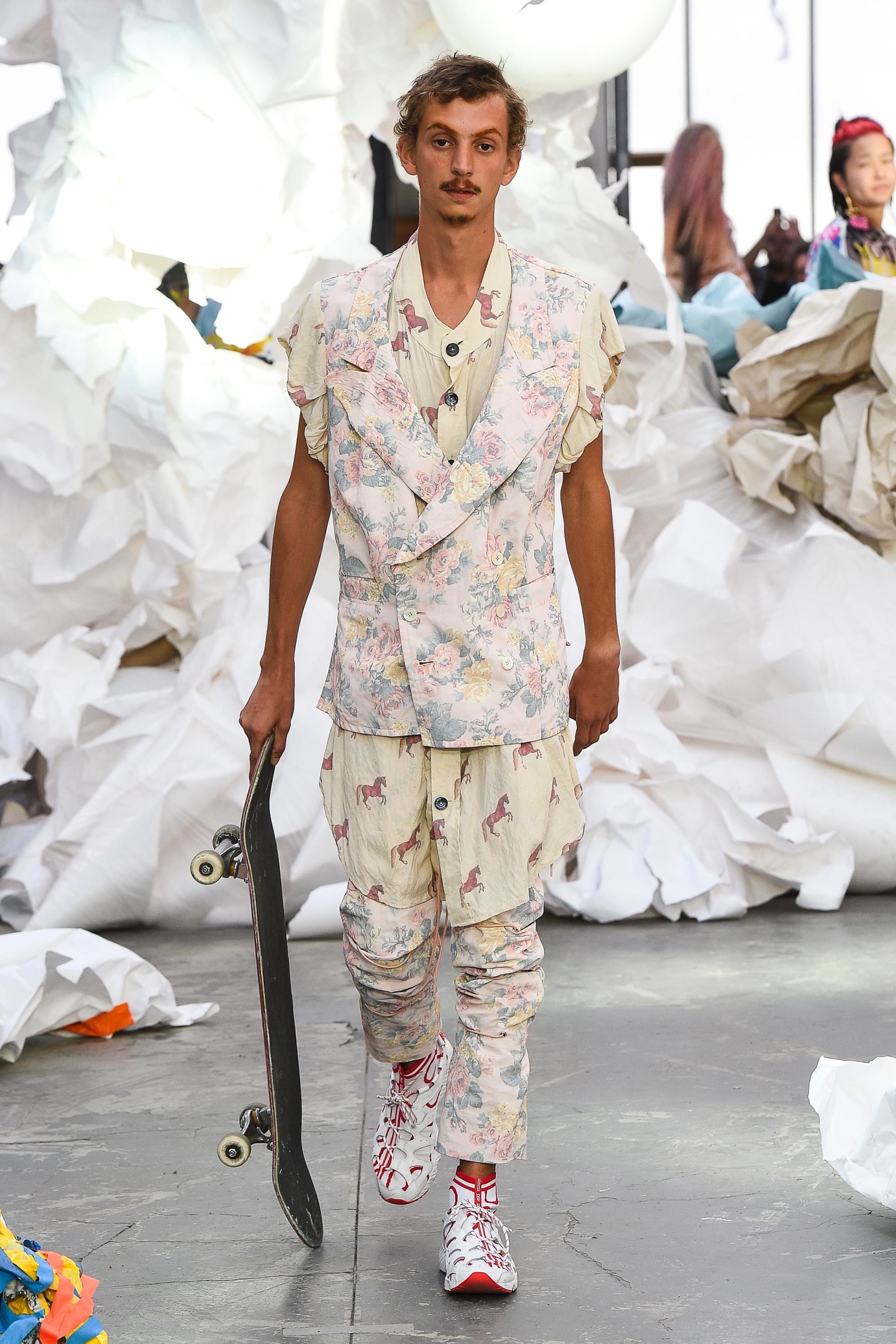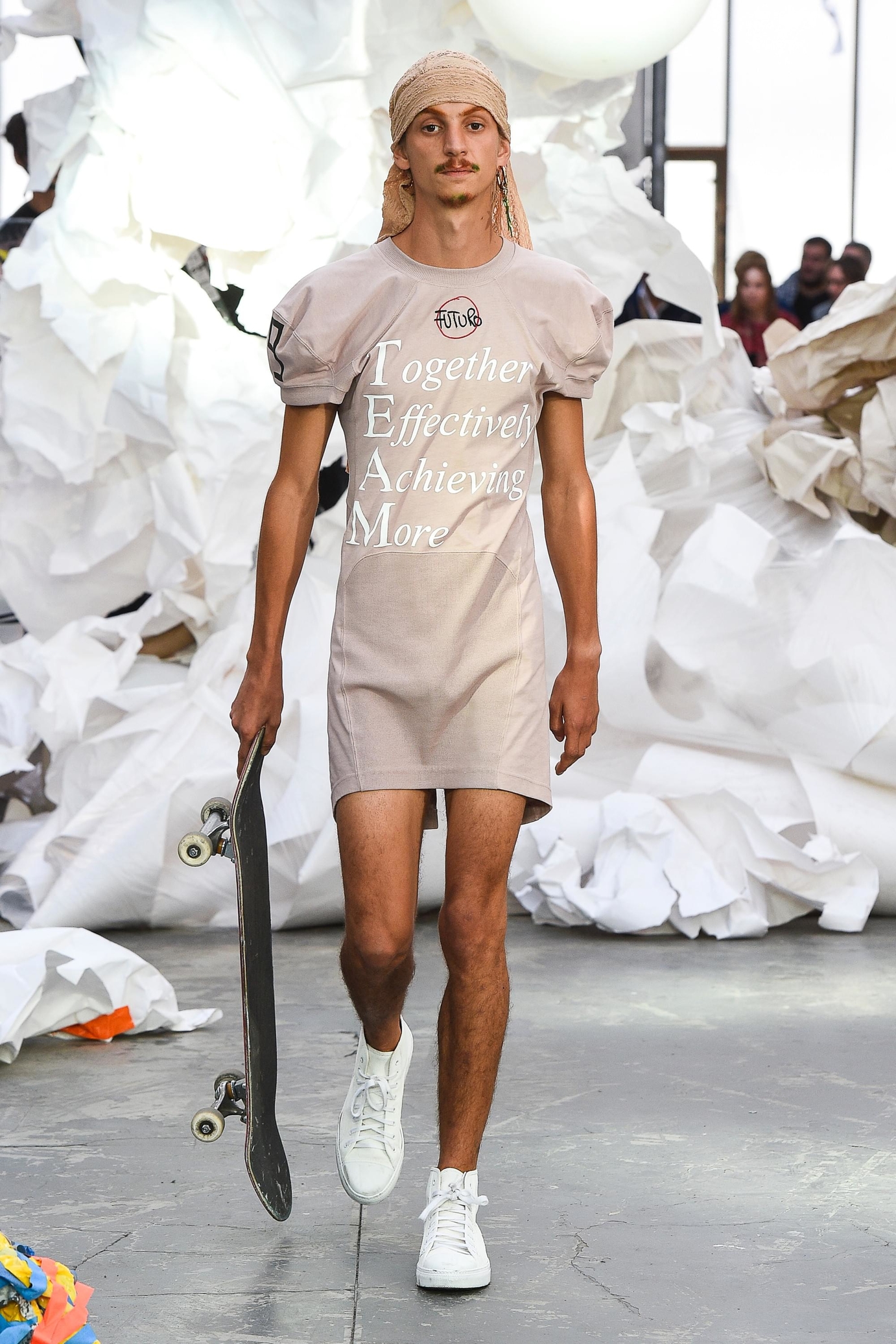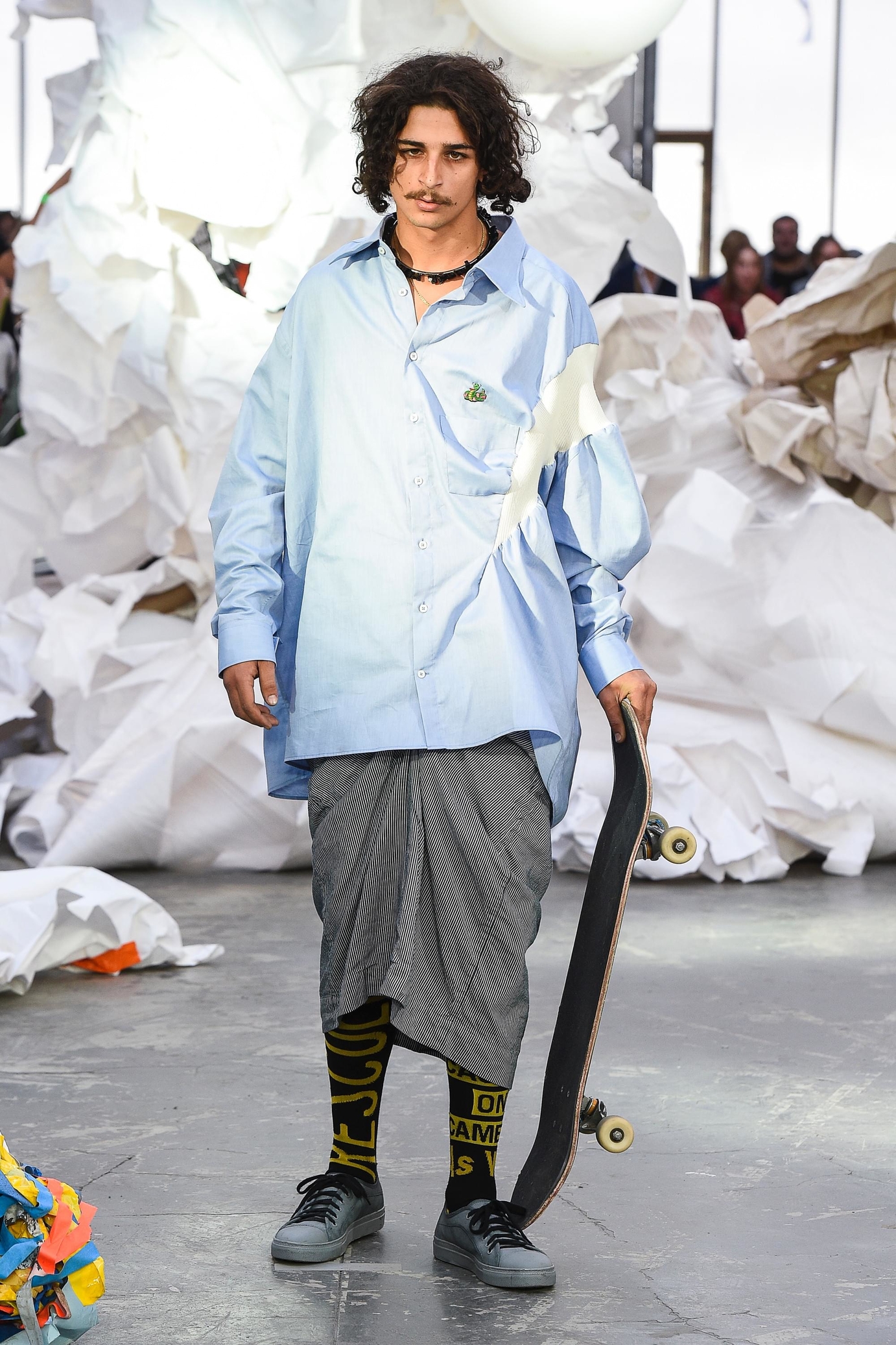 C’est au cœur du garage Amelot, à Paris, que Vivienne Westwood a présenté sa collection printemps-été 2019. Un cadre en parfaite adéquation avec le style de la Maison. Andreas Kronthaler dévoile ici une collection pleine d’humour et de malice. Il nous invite à la rencontre de culturistes en slip, perchés sur des boots disco et trottinettes, et de skateurs en robe, le tout inspiré par les skateuses de Kaboul.