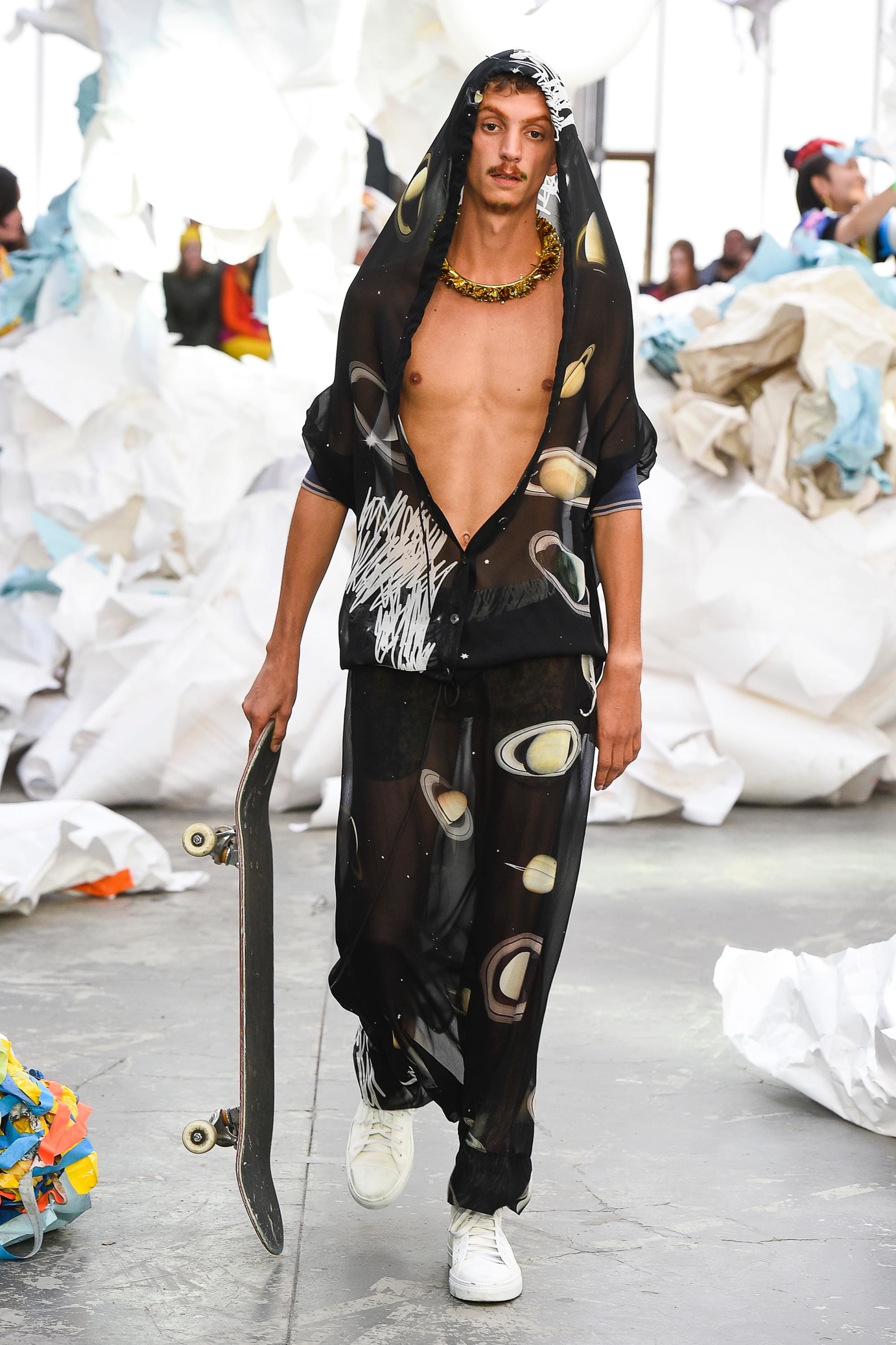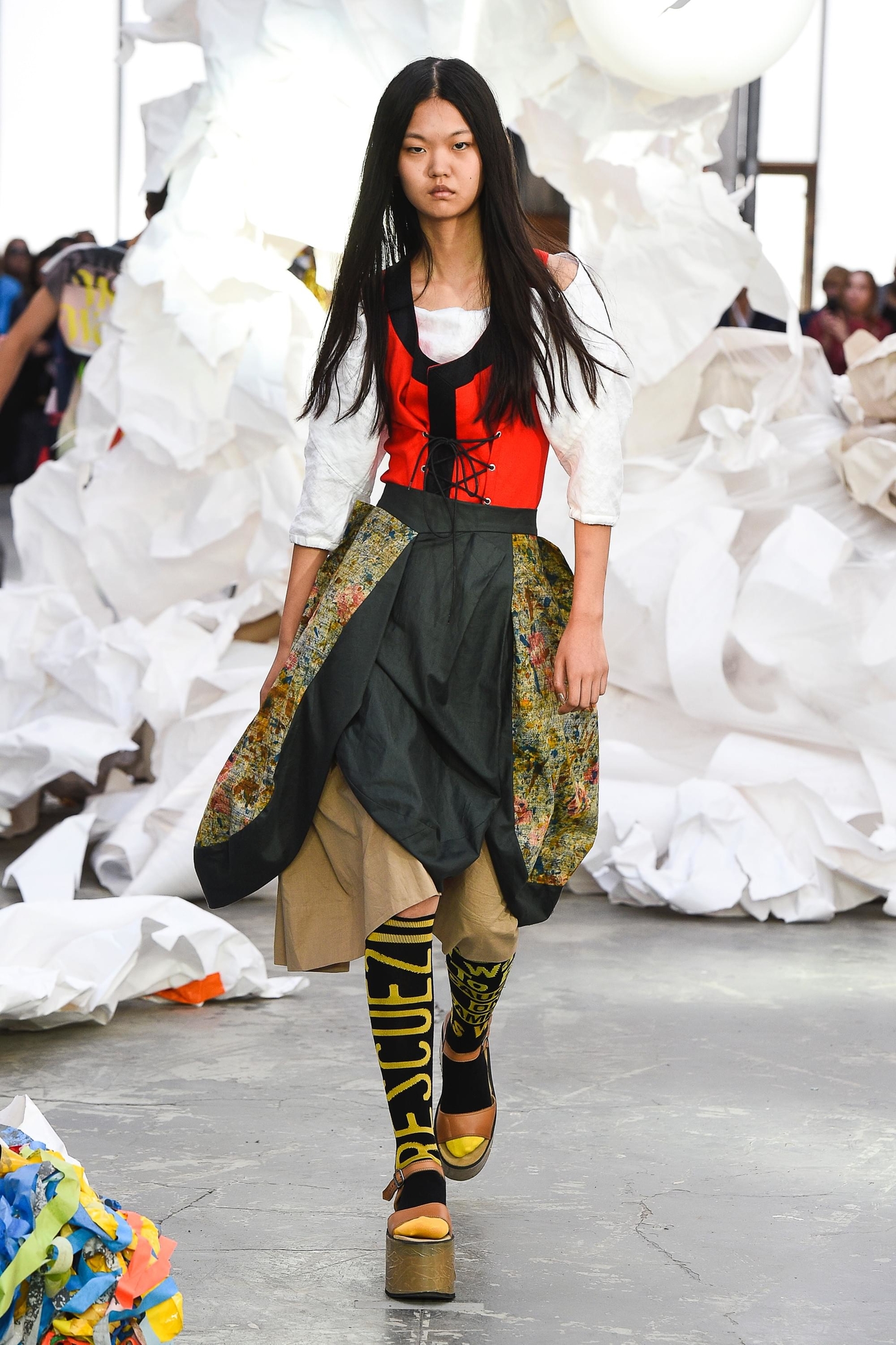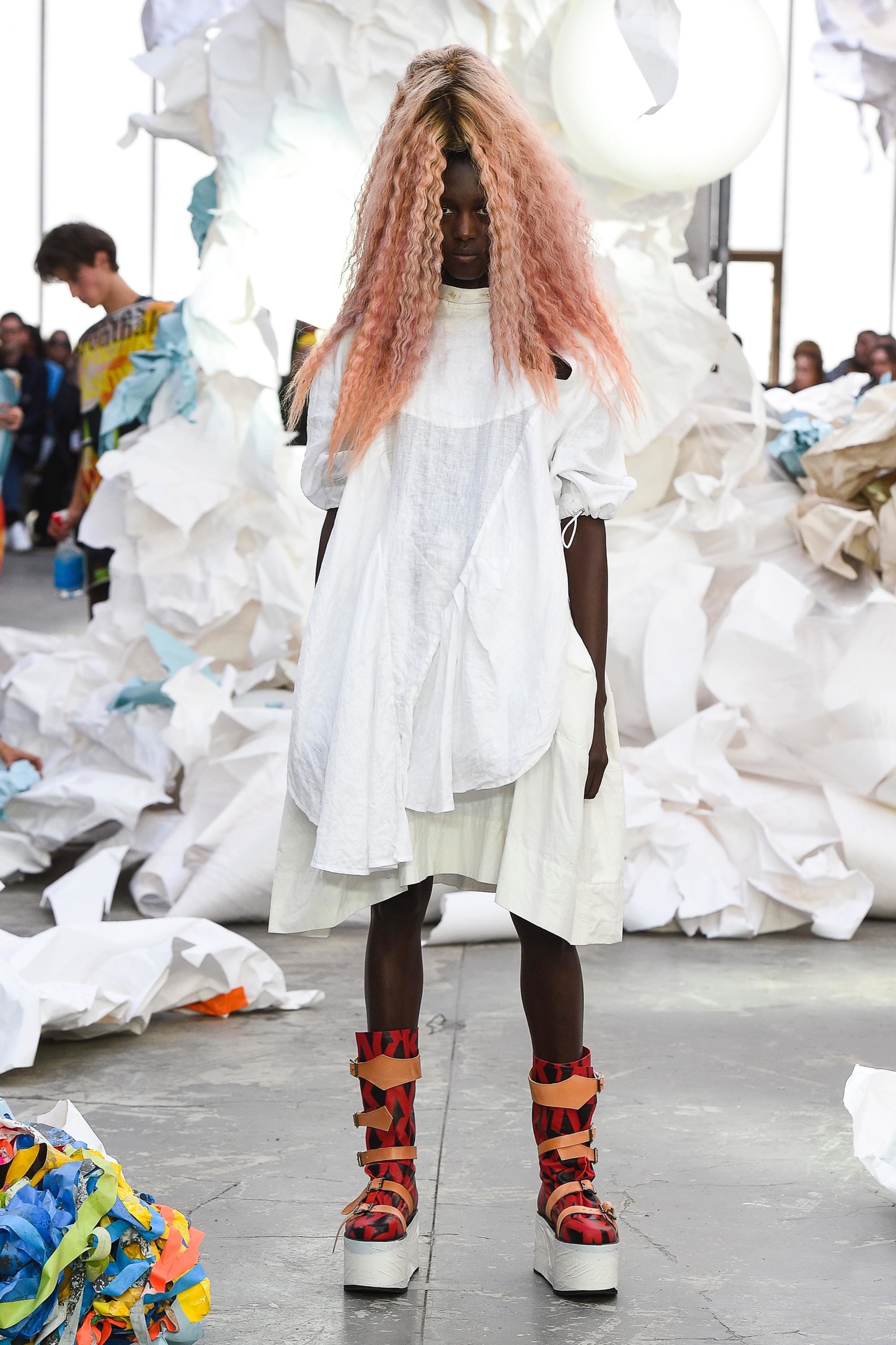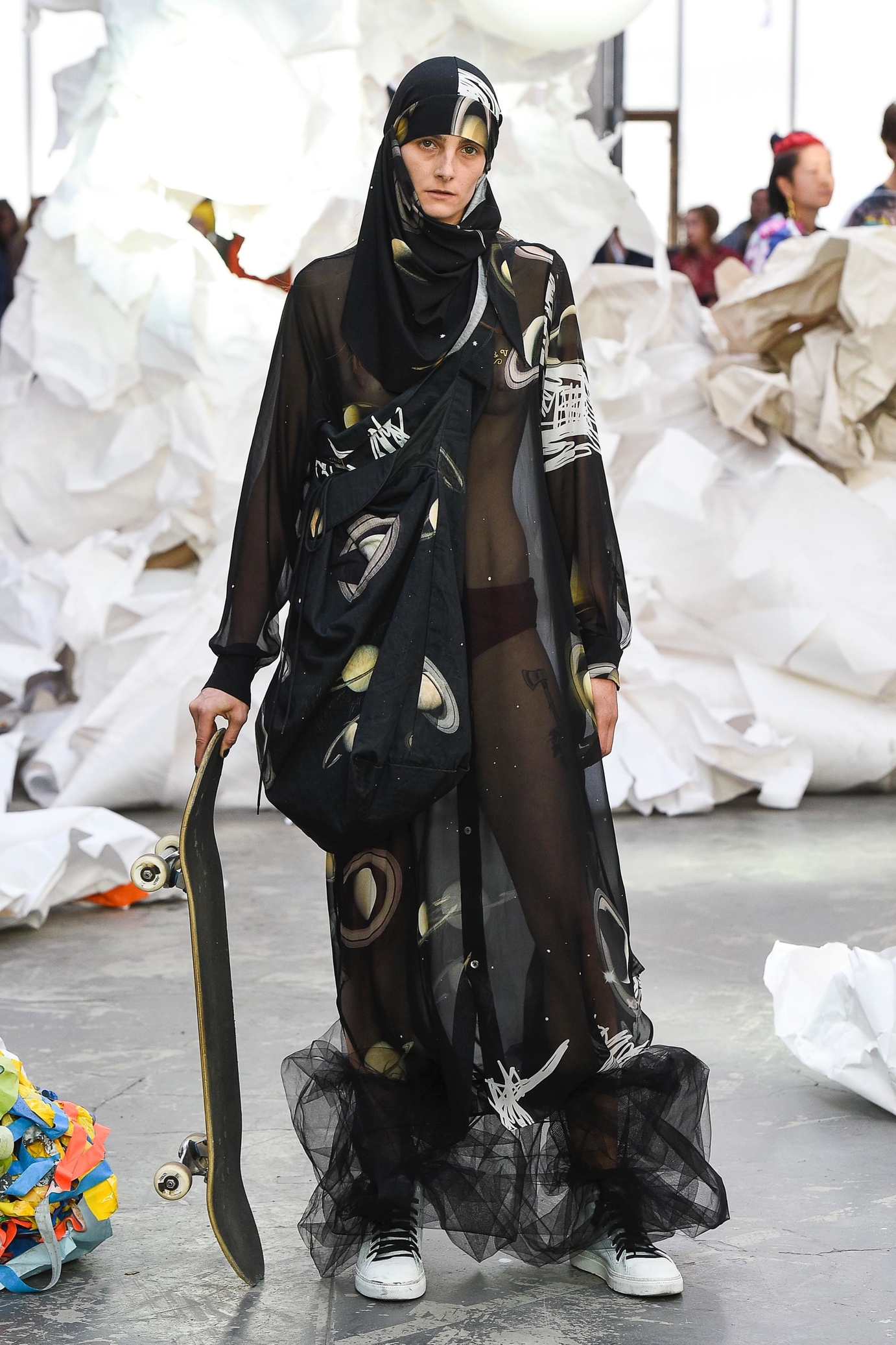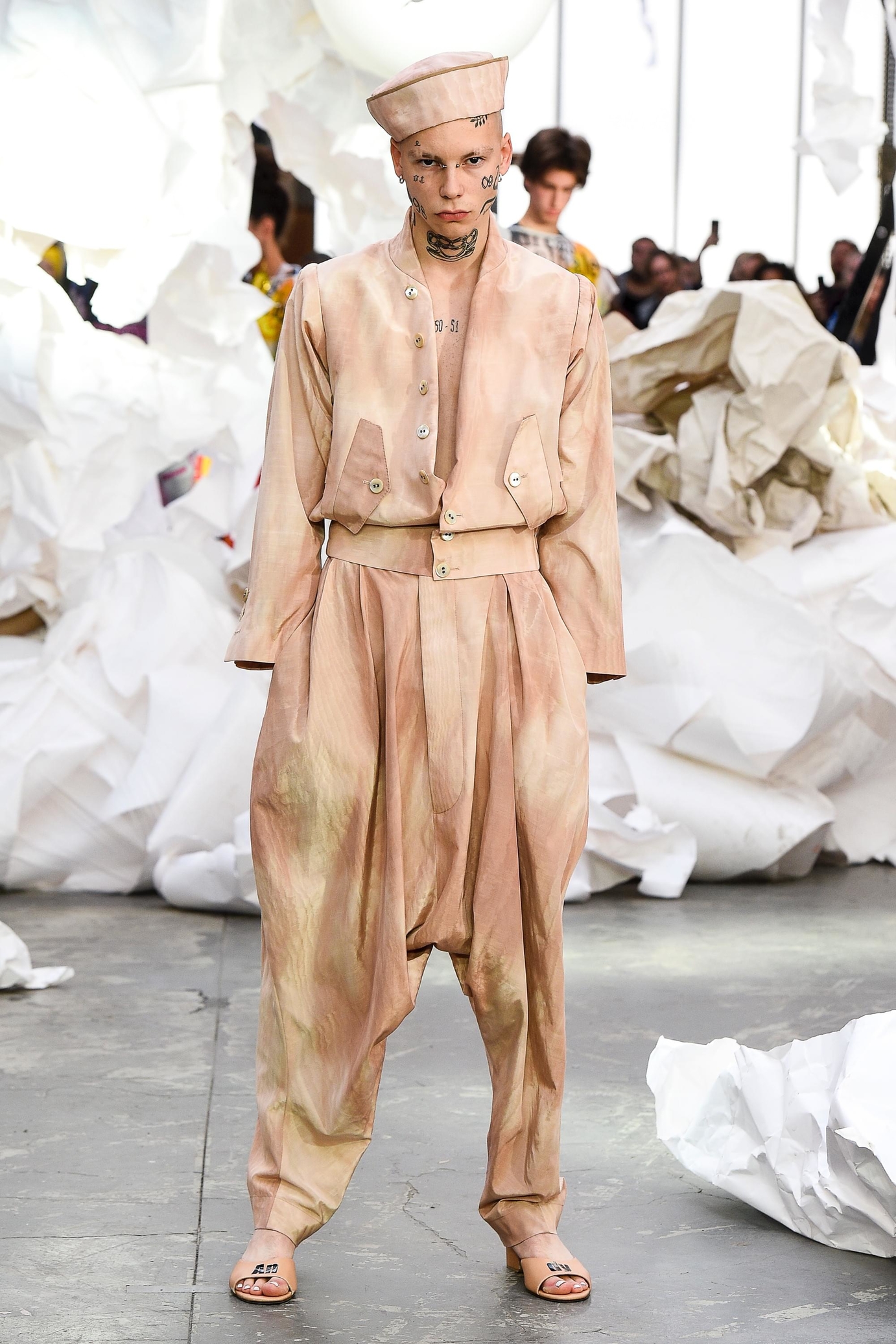 C’est au cœur du garage Amelot, à Paris, que Vivienne Westwood a présenté sa collection printemps-été 2019. Un cadre en parfaite adéquation avec le style de la Maison. Andreas Kronthaler dévoile ici une collection pleine d’humour et de malice. Il nous invite à la rencontre de culturistes en slip, perchés sur des boots disco et trottinettes, et de skateurs en robe, le tout inspiré par les skateuses de Kaboul.