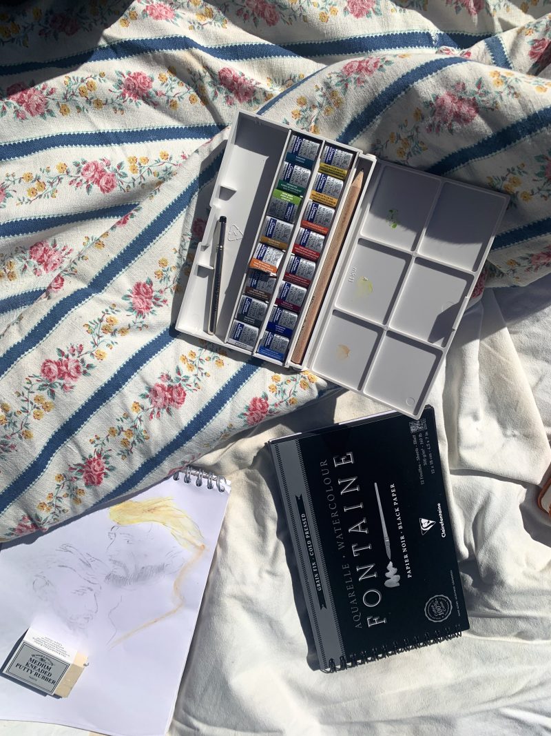‘Je tente aussi de nouvelles activités. Une amie peintre (Cyrielle Gulacsy) m’a envoyé une petite palette pour faire de l’aquarelle. Elle espérait que j’ai un don, un échec total 😉 Alors je me suis mise à la cuisine. A part la mousse au chocolat, je ne suis pas vraiment douée.’