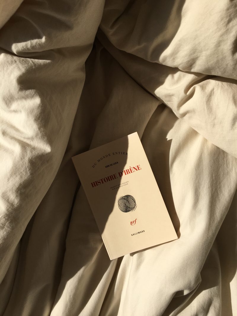 ‘Je suis en train de lire ‘Histoire d’Irène‘ de l’auteur italien Erri De Luca, une histoire qui a lieu en bord de mer. Très poétique, ça fait voyager l’esprit et ramène à l’essentiel de la vie. J’essaie que mes lectures soient courtes pour pouvoir voyager d’un coin à un autre de mon esprit vu que je ne peux pas le faire physiquement.’
