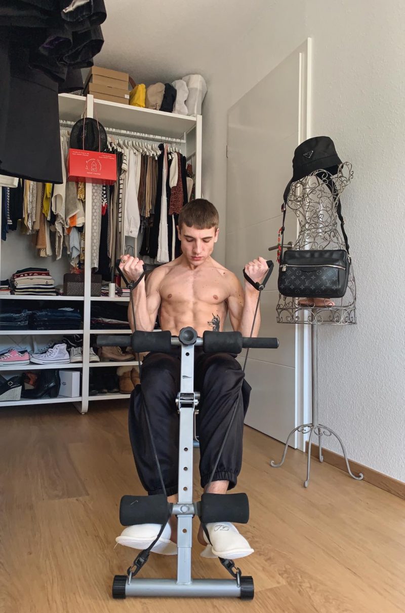 Ses journées commencent généralement vers 10H00. ‘On a pas tous les jours la chance de pouvoir profiter de la matinée pour dormir‘. Petit déjeuner de rigueur, et il alterne ensuite entre des séances de ménage et de sport. Il y passe au moins deux heures par jour. Une séance se termine toujours par un smoothie. ‘Il est important de faire toujours le plein de vitamines‘.