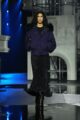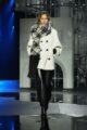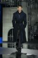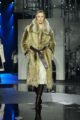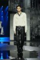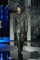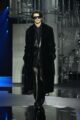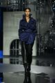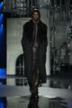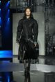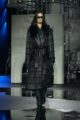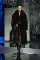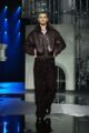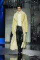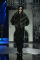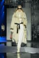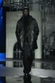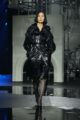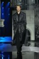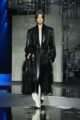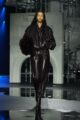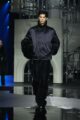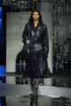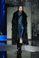 Sur le podium, le trench — pilier de l’ADN Burberry — ouvrait le bal dans une version gris pâle à volants, avant de se décliner en bleu nuit, aux proportions exagérées ou raccourcies. Combinaisons en cuir utilitaires, vestes de moto matelassées et smokings vert olive dialoguaient avec des manteaux duveteux bordés de fourrure et des bombers bordeaux profonds, portés notamment par Rosie Huntington-Whiteley et Romeo Beckham.