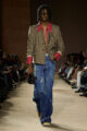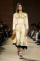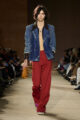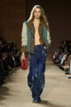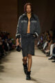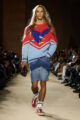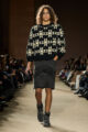 Le vestiaire oscille entre pièces du soir sophistiquées, robes cintrées aux épaules marquées, ornées d’appliqués scintillants et essentiels revisités : jerseys vintage retravaillés, denim recyclé, T-shirts raccourcis à rayures varsity. L’outerwear s’impose comme colonne vertébrale de la saison, notamment à travers les varsity jackets, proposées en cuir, en laine et, pour la première fois, en version intégralement shearling.