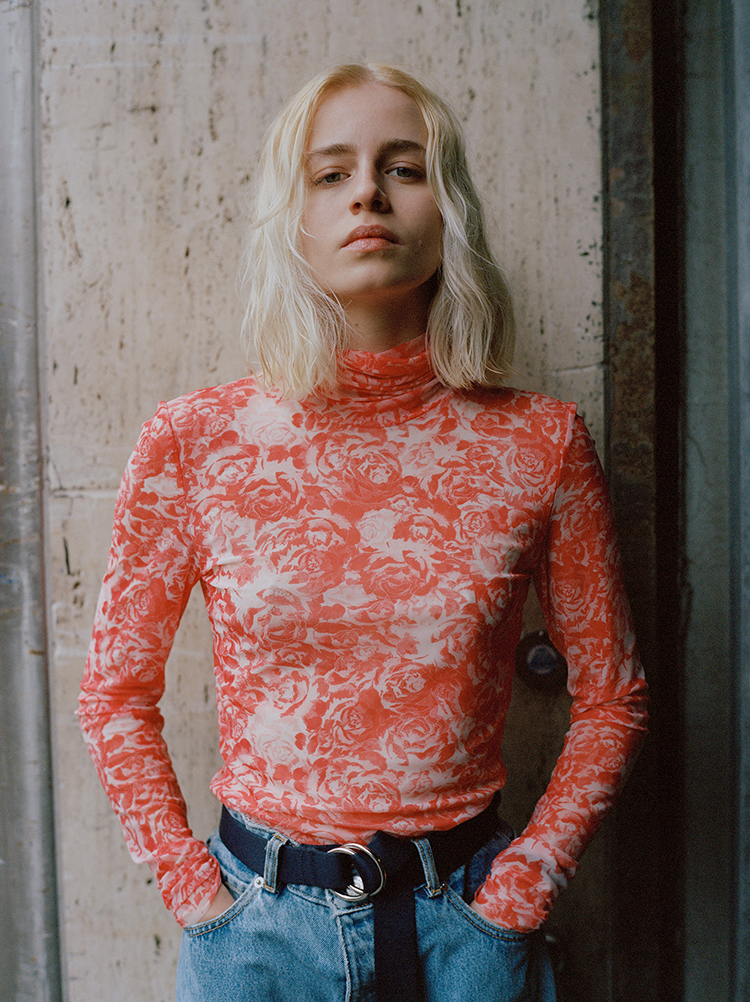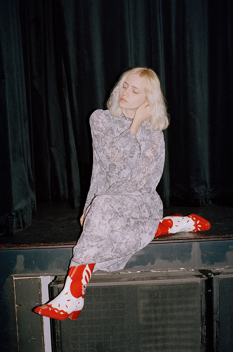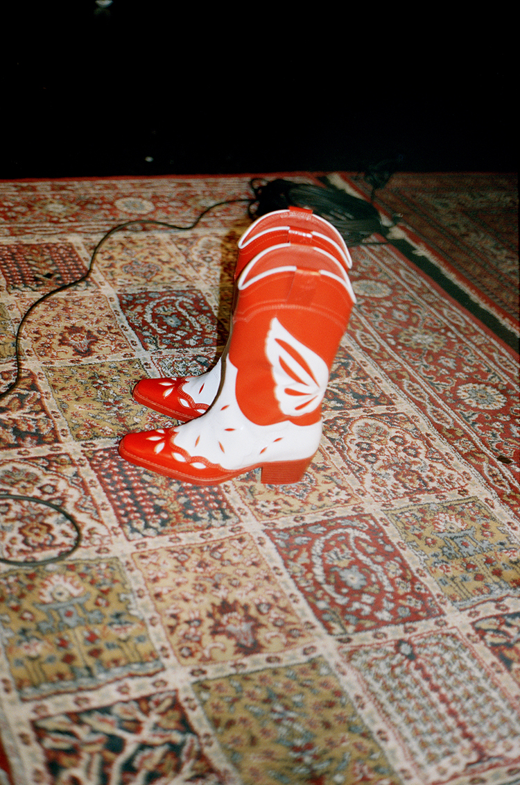 Baptisée ‘Cosmic World‘, sa dernière collection comprend 14 pièces dont des jupes en résille à motifs floraux, des tops à pois, des robes, des pulls ou encore des bottes de cowboy en cuir rouge. On adore !