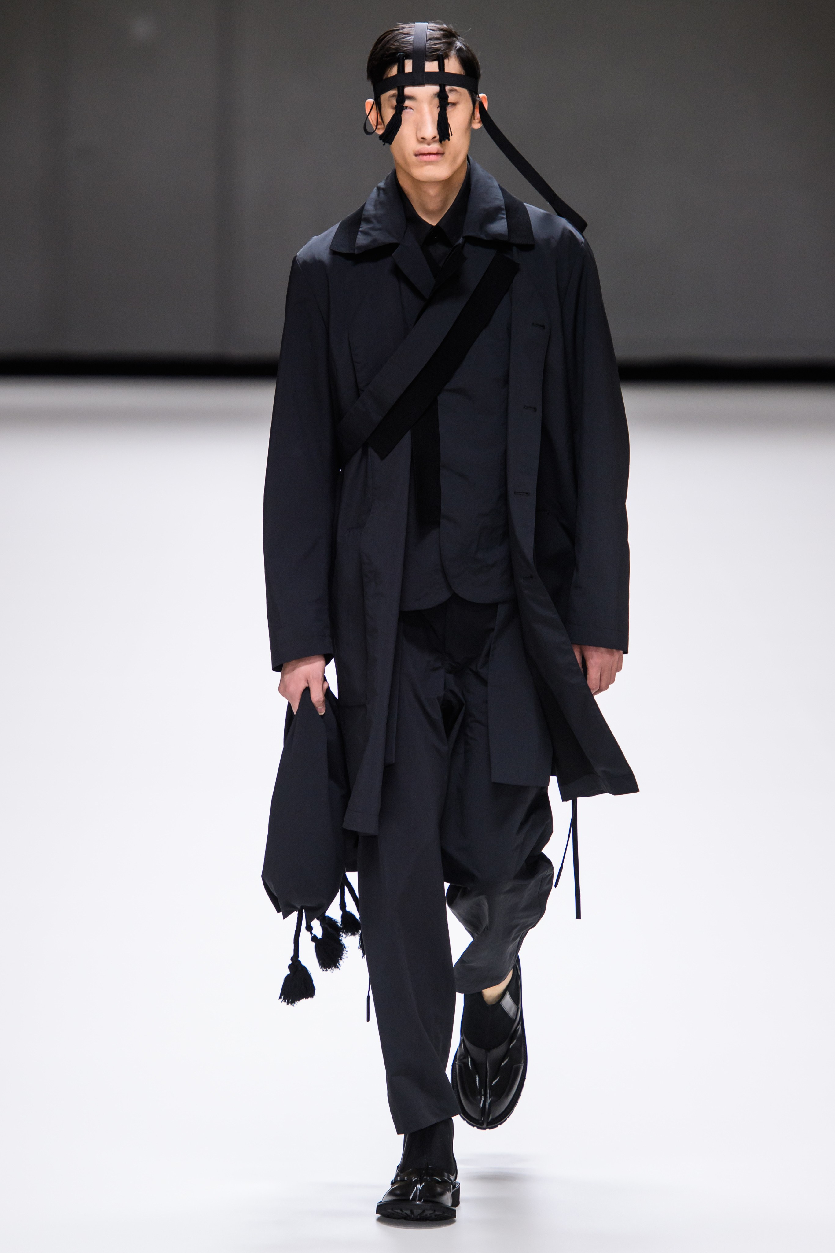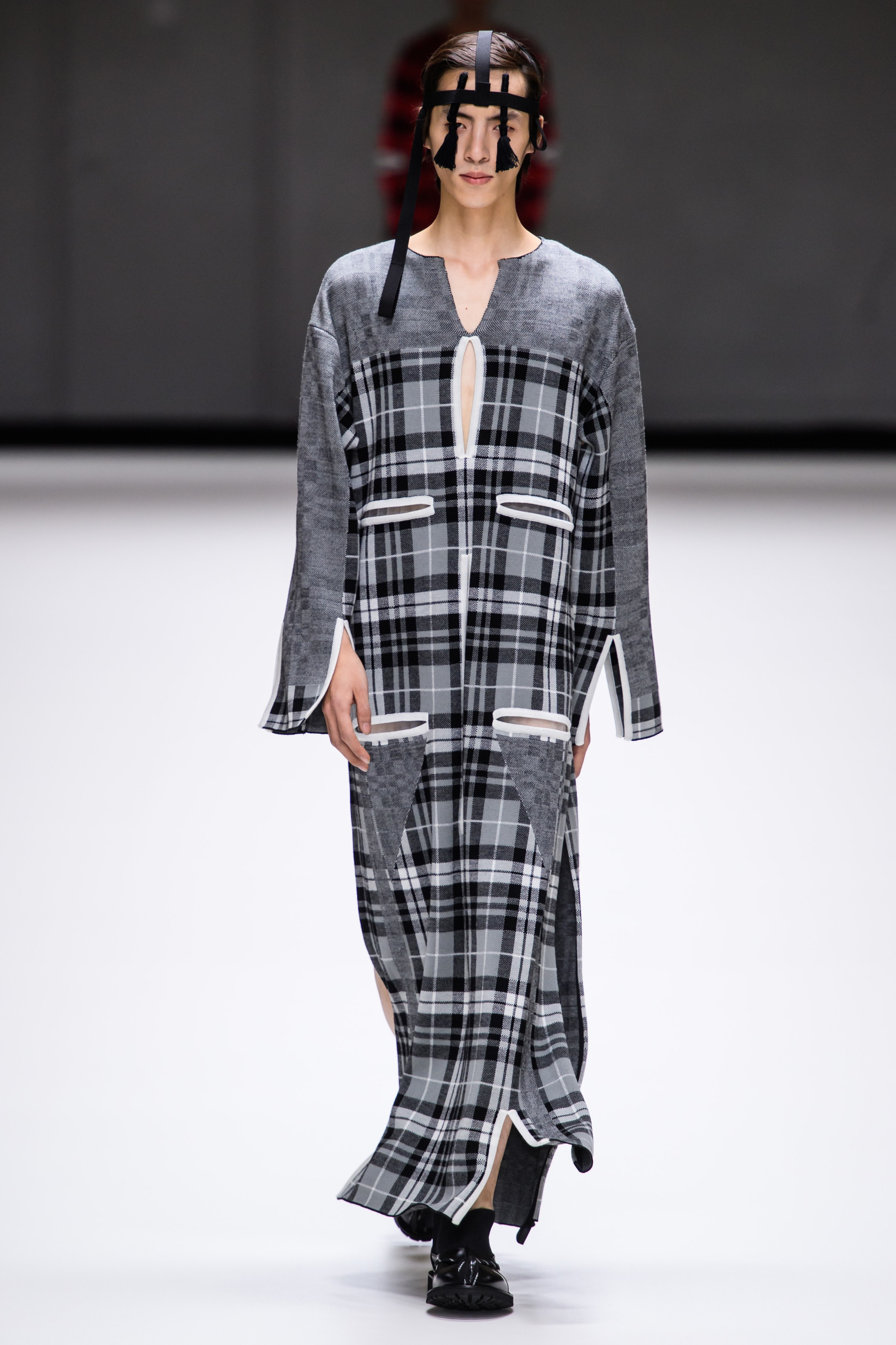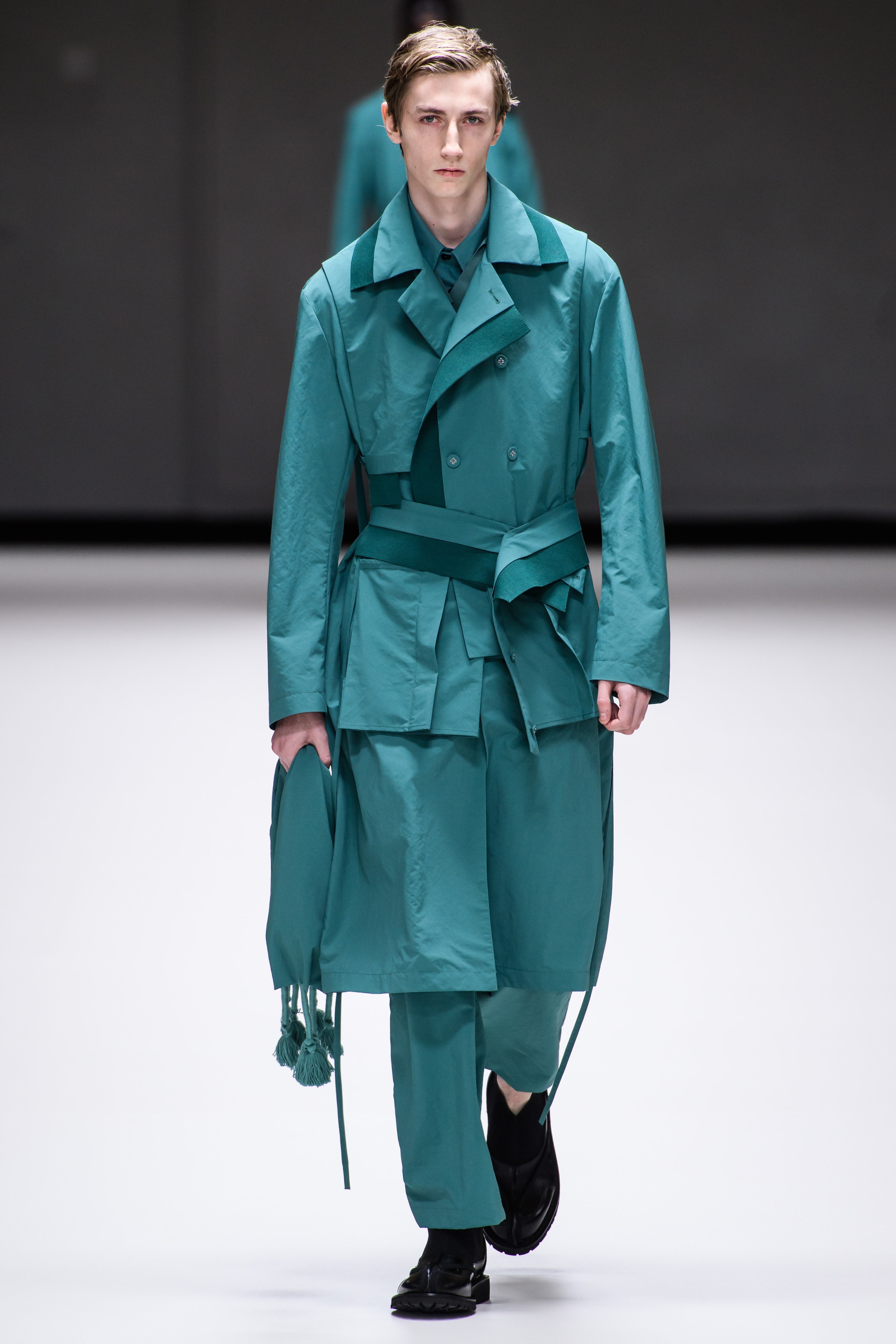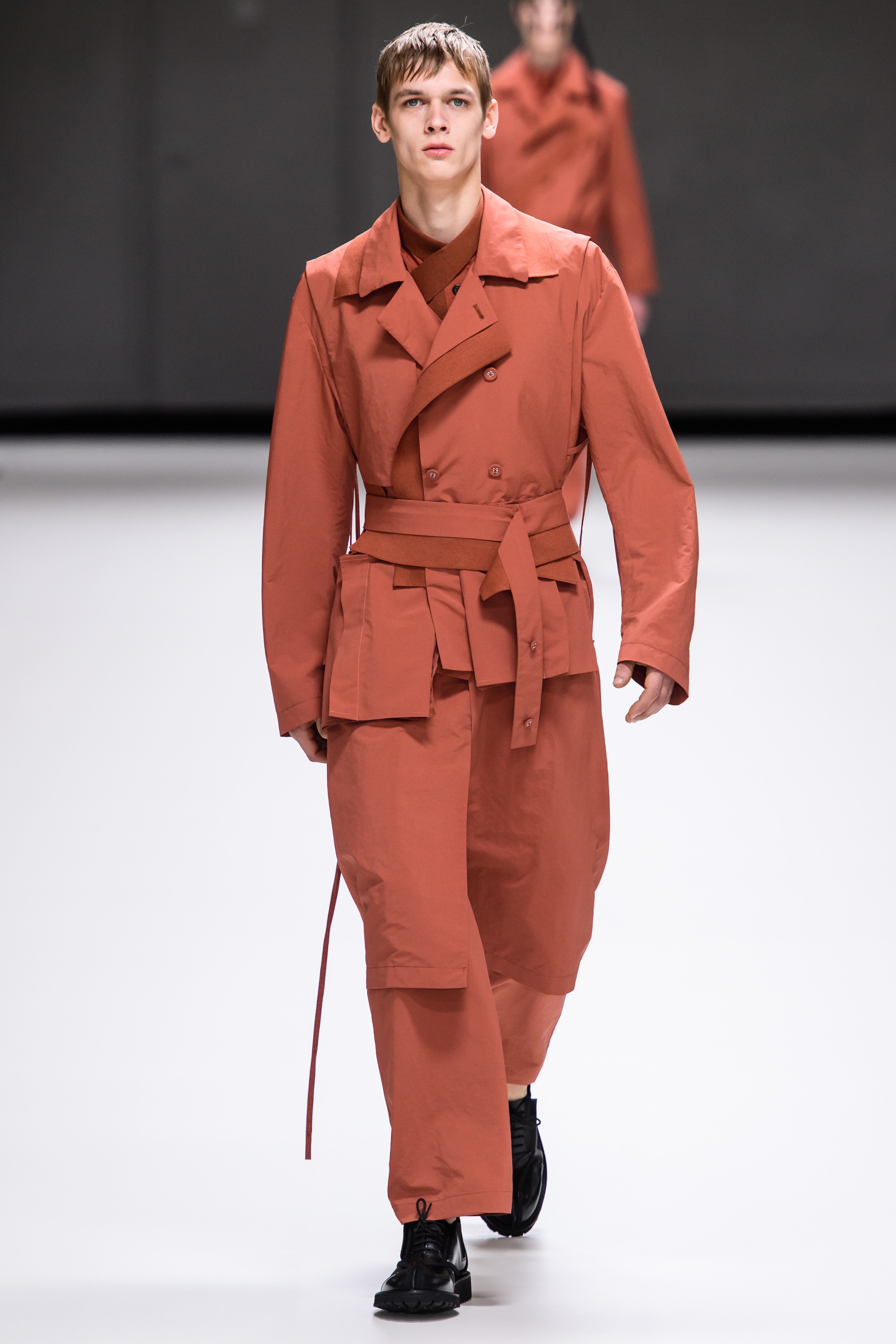 Ce défilé met en perspective la fragilité et la force de l’Homme dans notre monde moderne à travers des uniformes réinterprétés et colorés ; certains en plastique à l’allure ultra-technique, d’autres rappelant des tenues médiévales. Le designer laisse place uniquement à la relation entre l’Homme et le vêtement avec une scénographie simple et dénuée de spectacle.