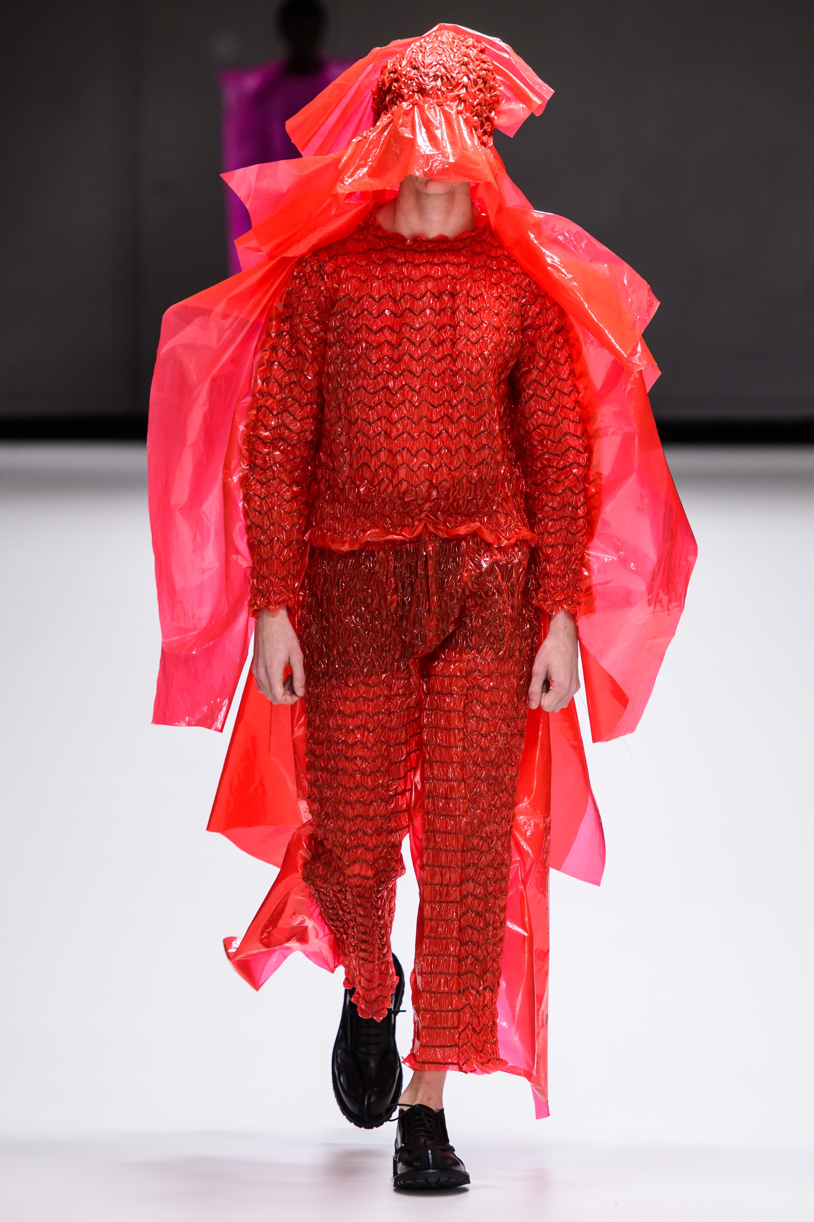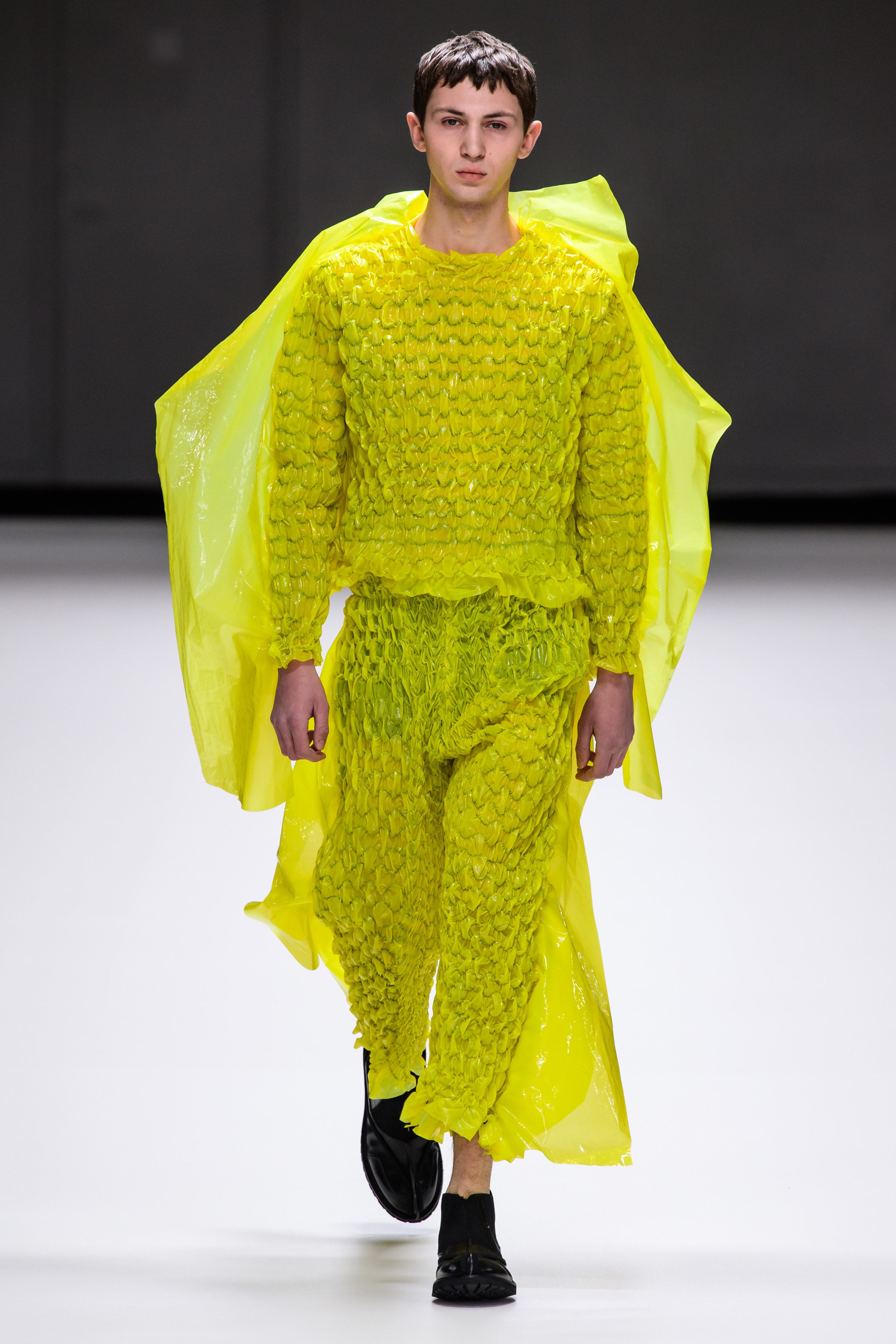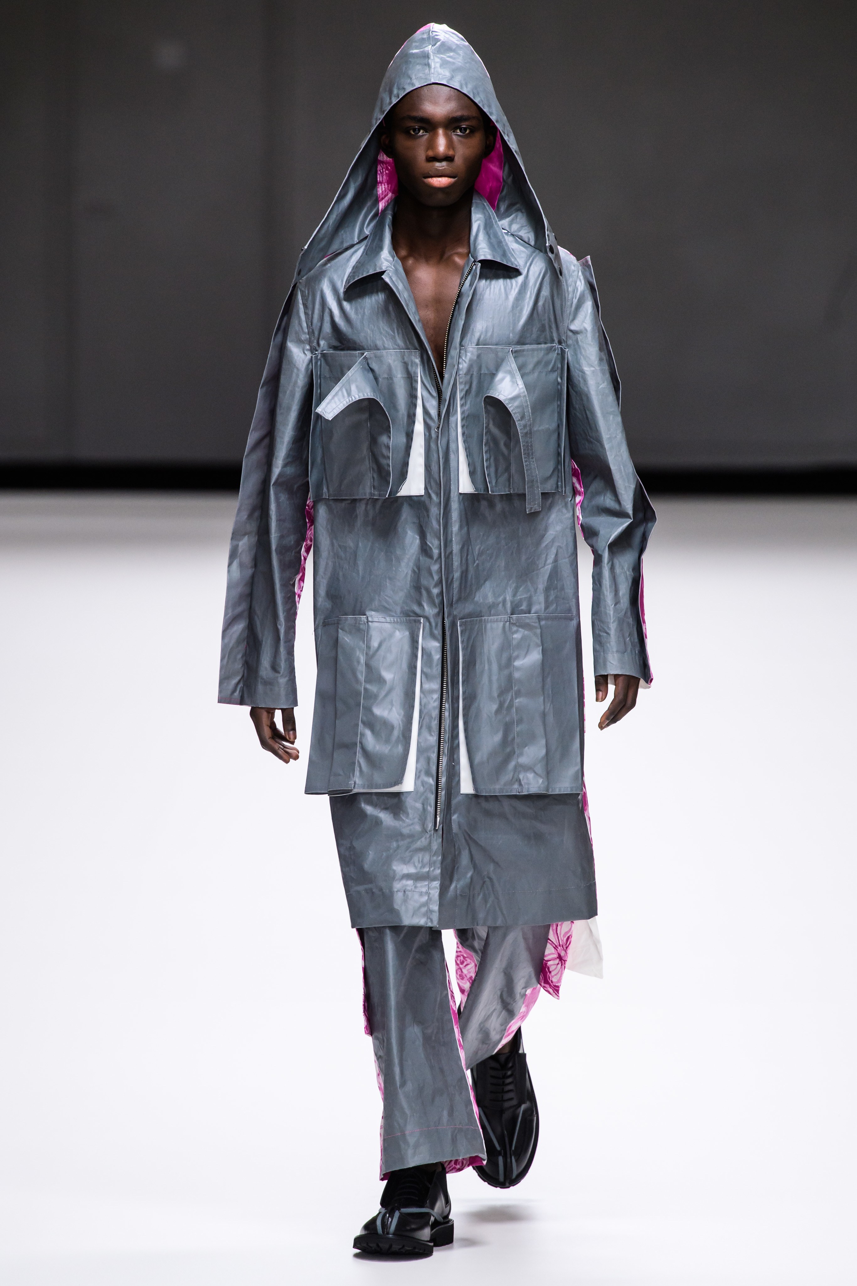 Le créateur s’amuse du fait de renverser les choses et de les transformer. Il ne se questionne pas sur l’impact du plastique mais plutôt sur sa transformation en vêtement statutaire. Un défilé complet qui nous propose à la fois des silhouettes à l’aspect casual pour arpenter les rues, ainsi qu’une vision conceptuelle chargée de sens. Craig Green s’affirme saison après saison comme l’un des designers britanniques les plus influents de sa génération.