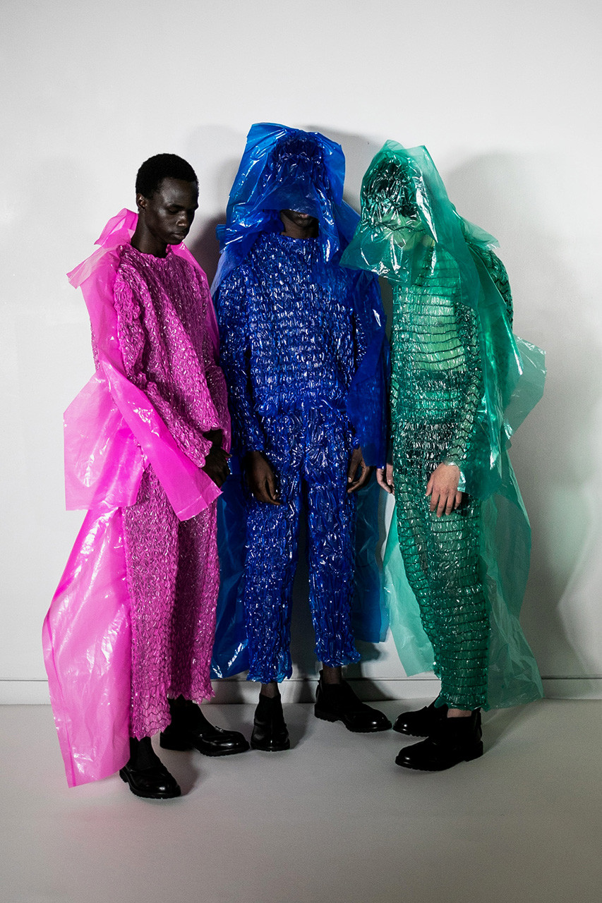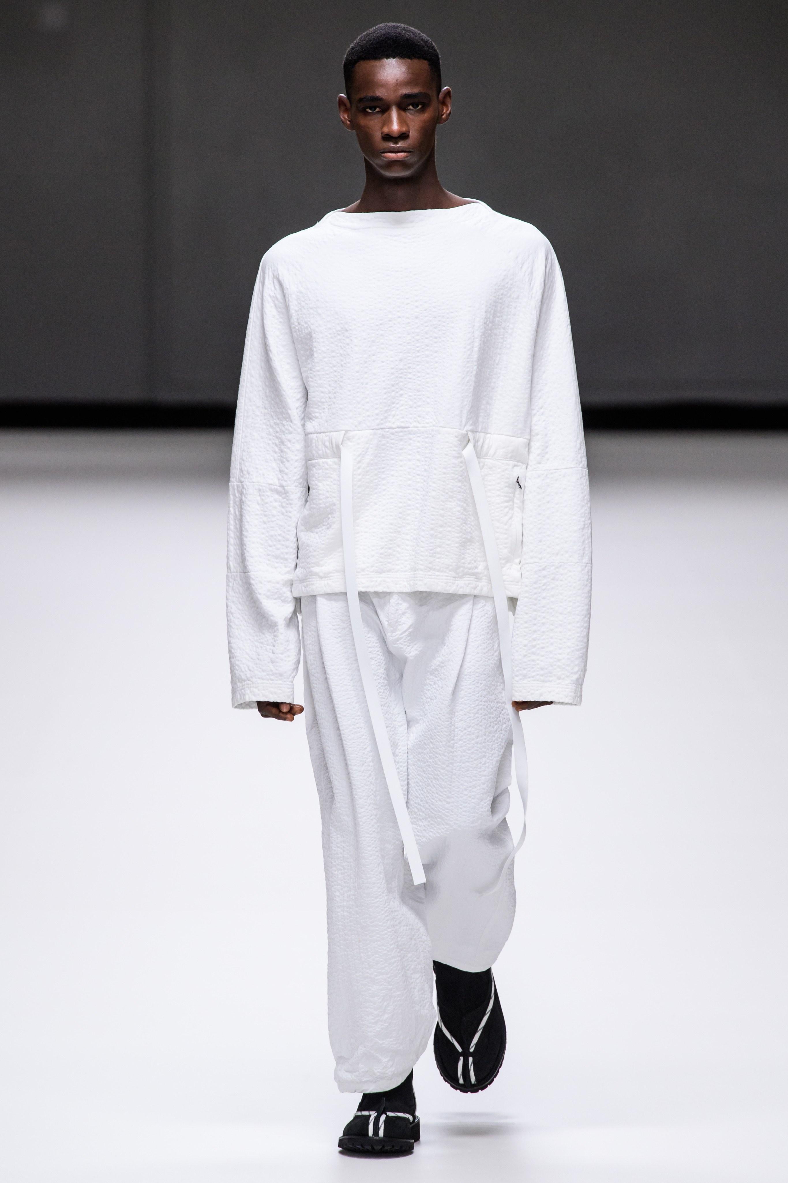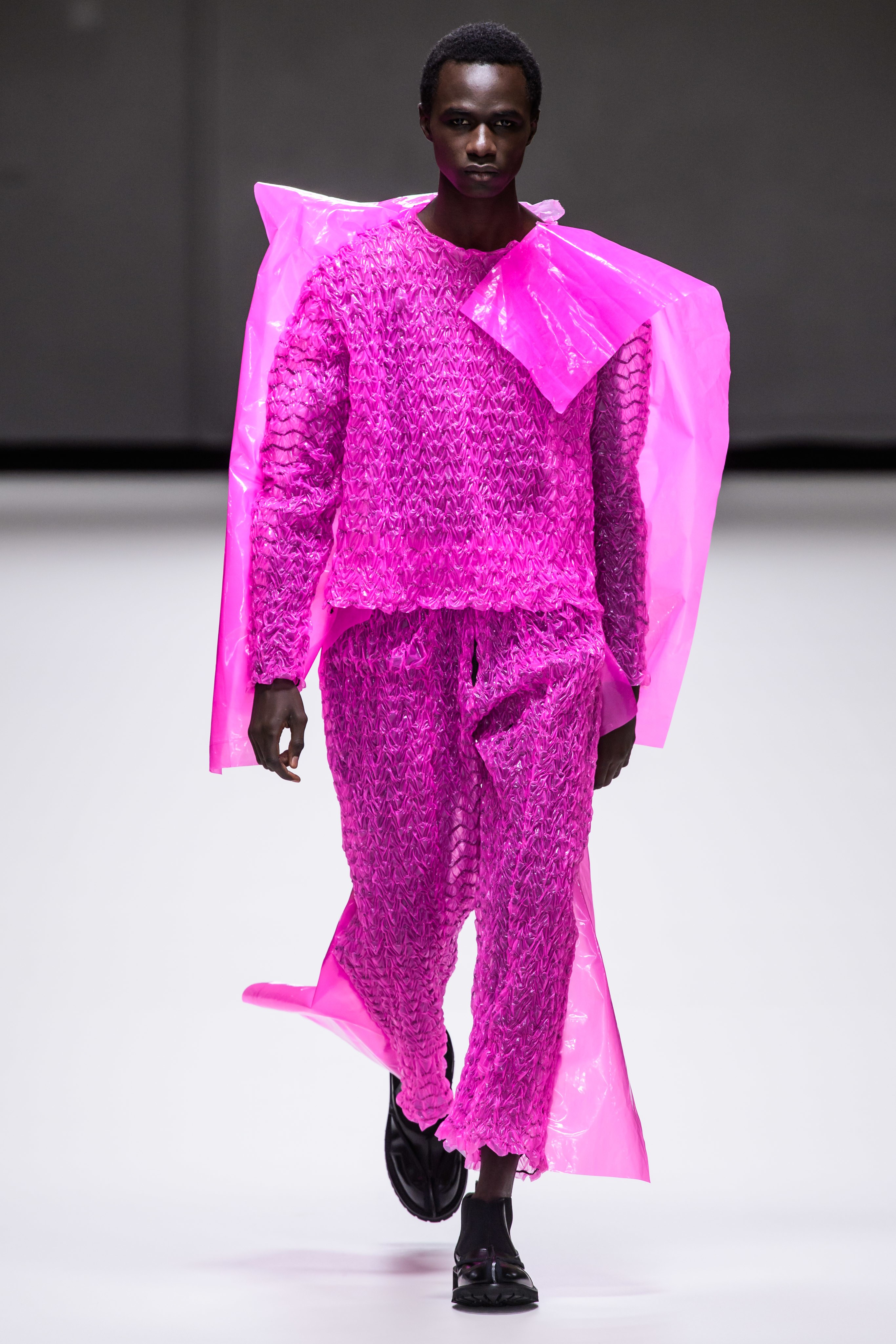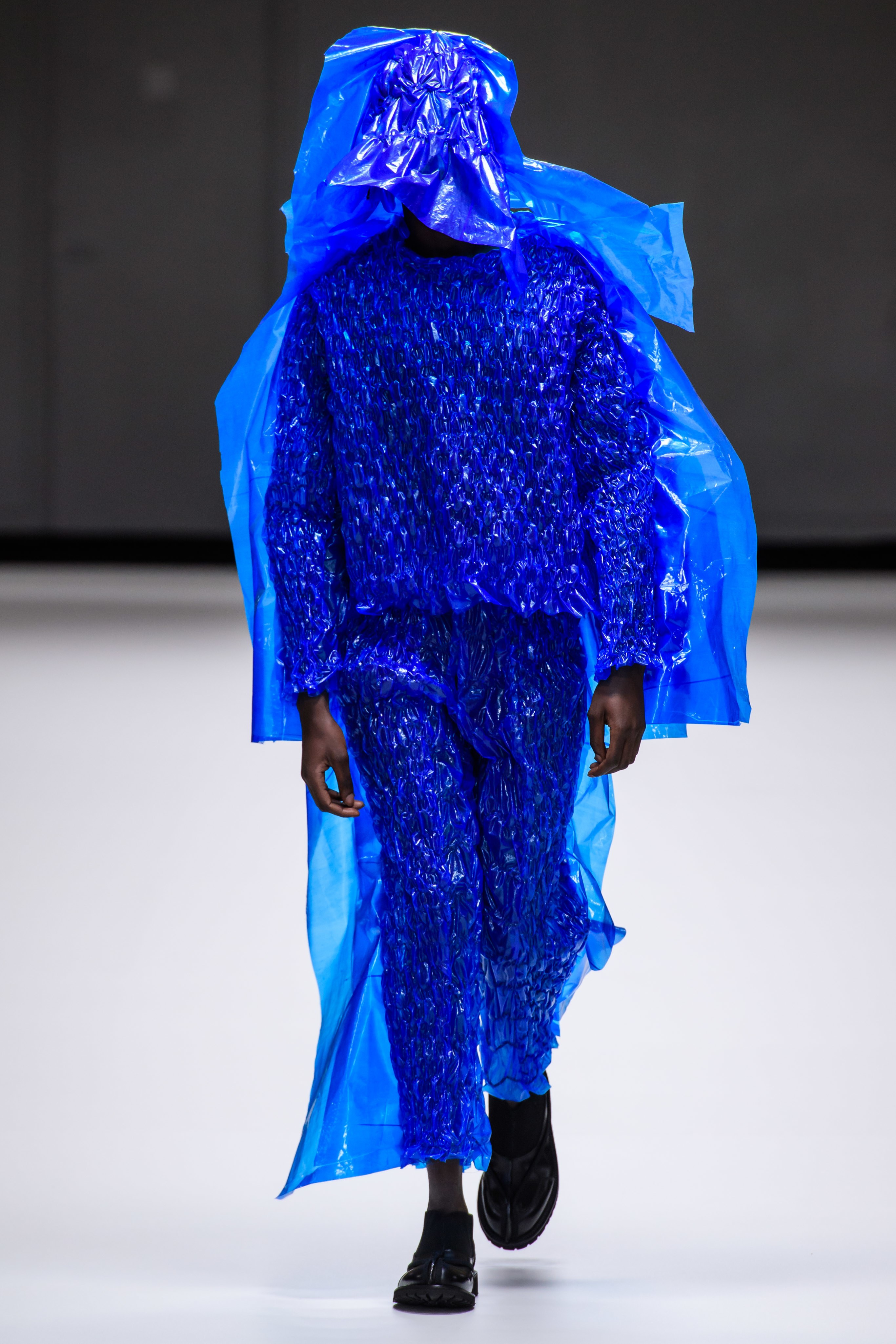 Le créateur s’amuse du fait de renverser les choses et de les transformer. Il ne se questionne pas sur l’impact du plastique mais plutôt sur sa transformation en vêtement statutaire. Un défilé complet qui nous propose à la fois des silhouettes à l’aspect casual pour arpenter les rues, ainsi qu’une vision conceptuelle chargée de sens. Craig Green s’affirme saison après saison comme l’un des designers britanniques les plus influents de sa génération.