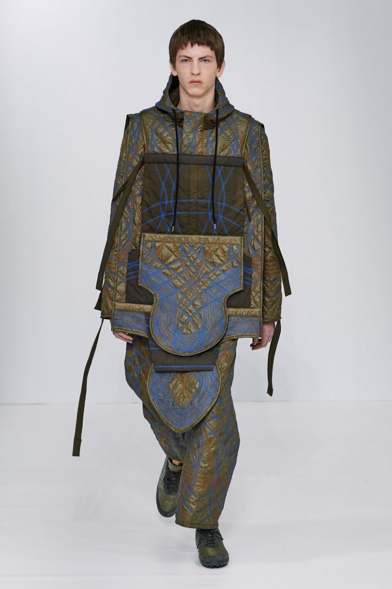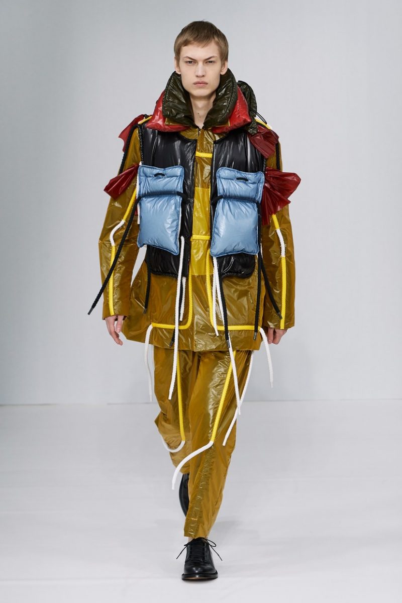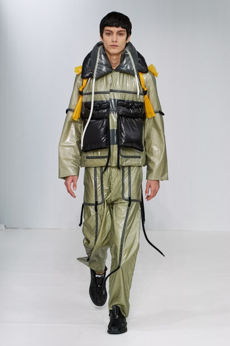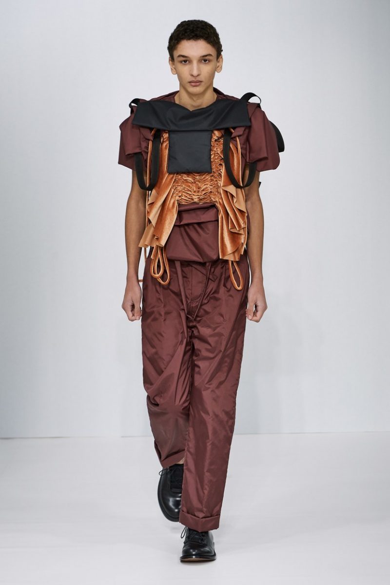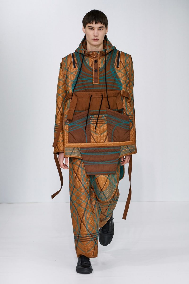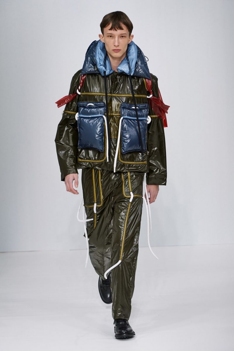 Inspirées des uniformes de travail, les silhouettes de Craig Green sont plus qu’ingénieuses : cordons, sangles, suspensions, rembourrages et superpositions sont au programme de cette nouvelle collection.