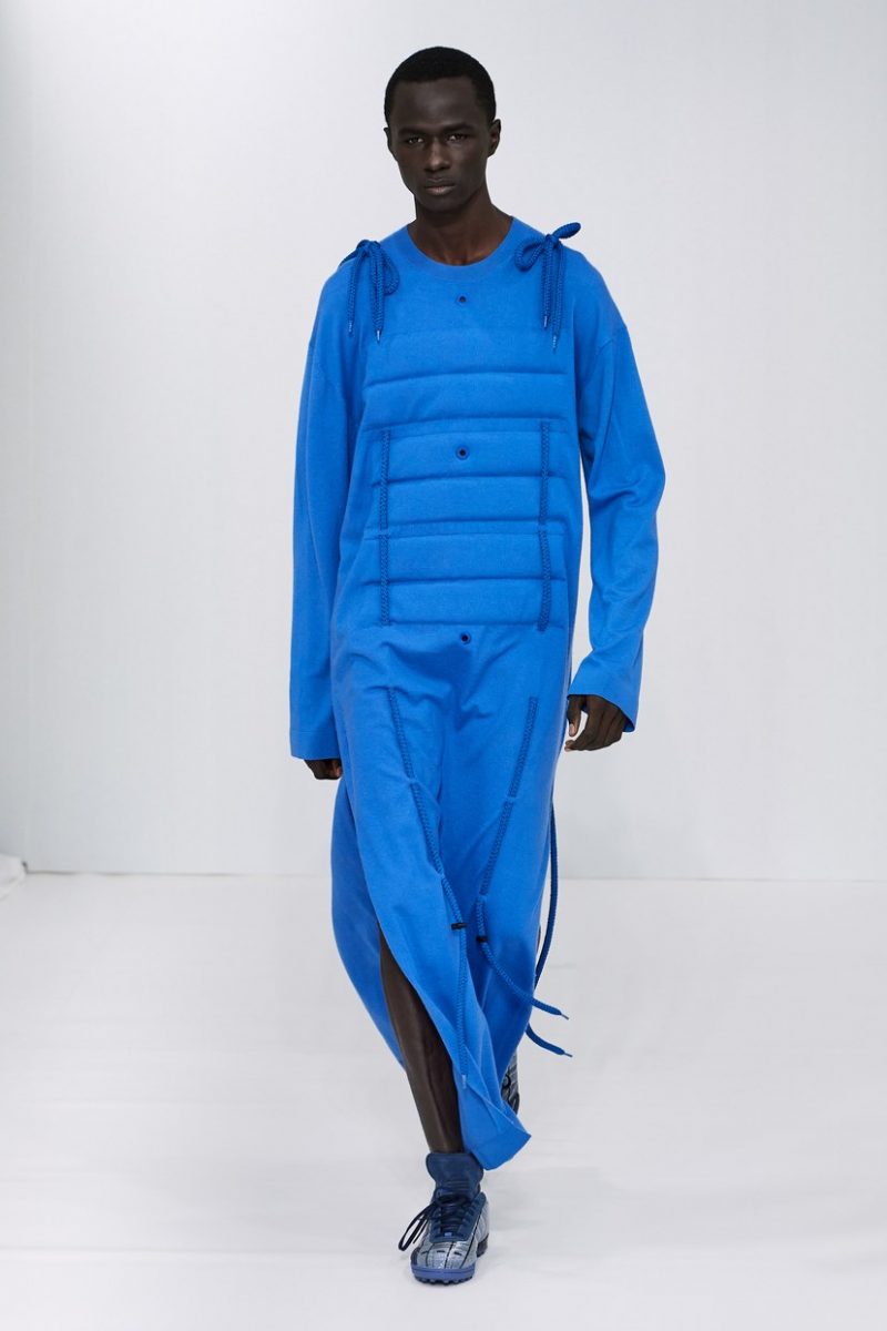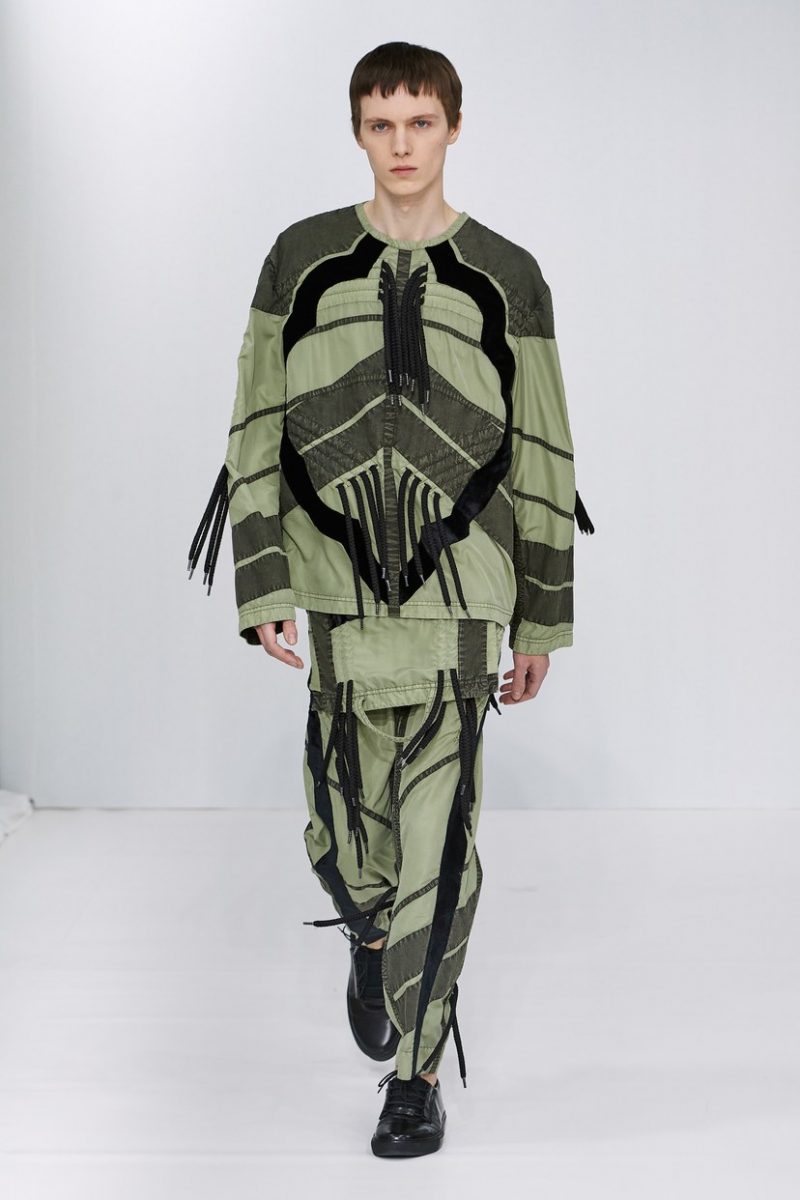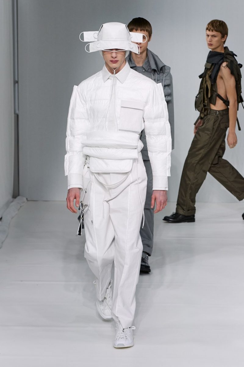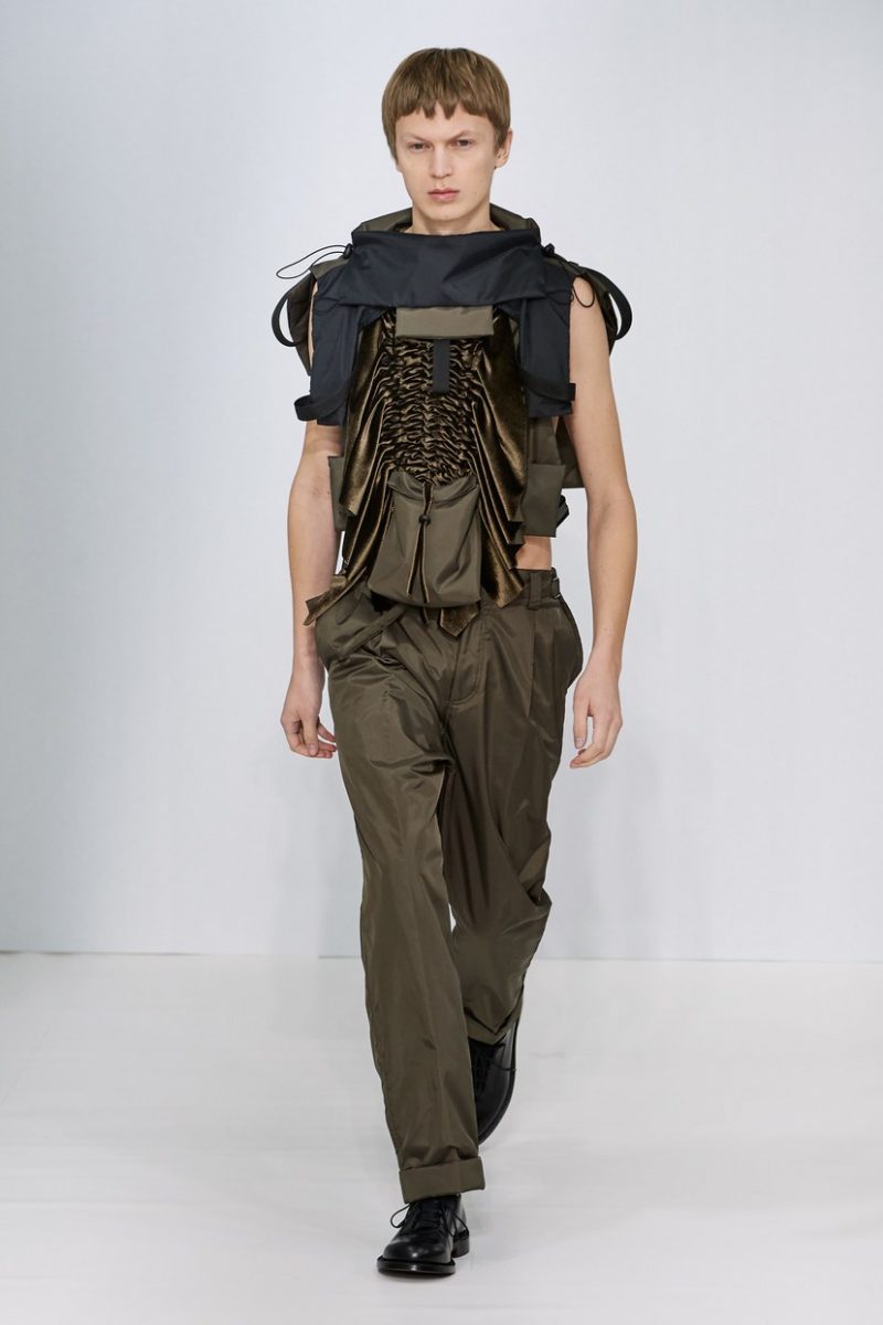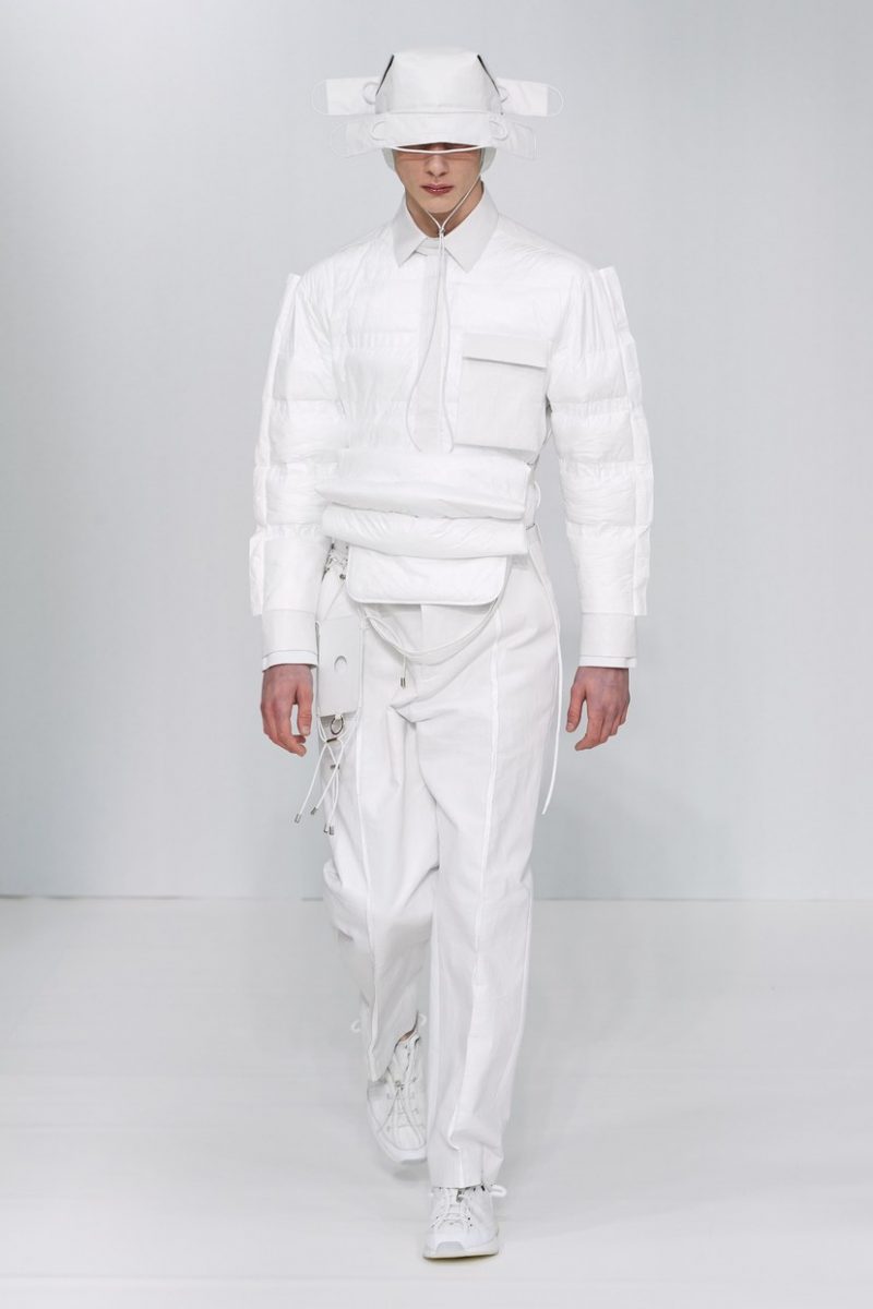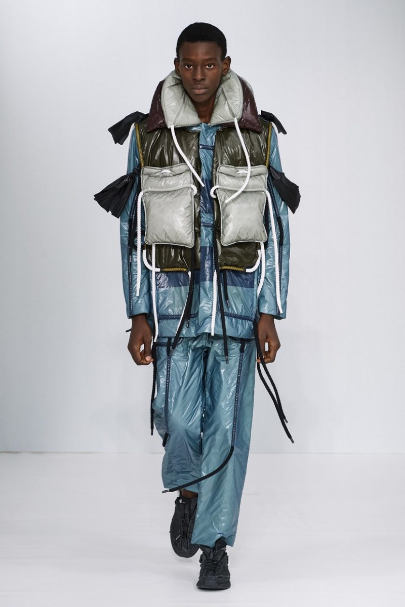 Inspirées des uniformes de travail, les silhouettes de Craig Green sont plus qu’ingénieuses : cordons, sangles, suspensions, rembourrages et superpositions sont au programme de cette nouvelle collection.