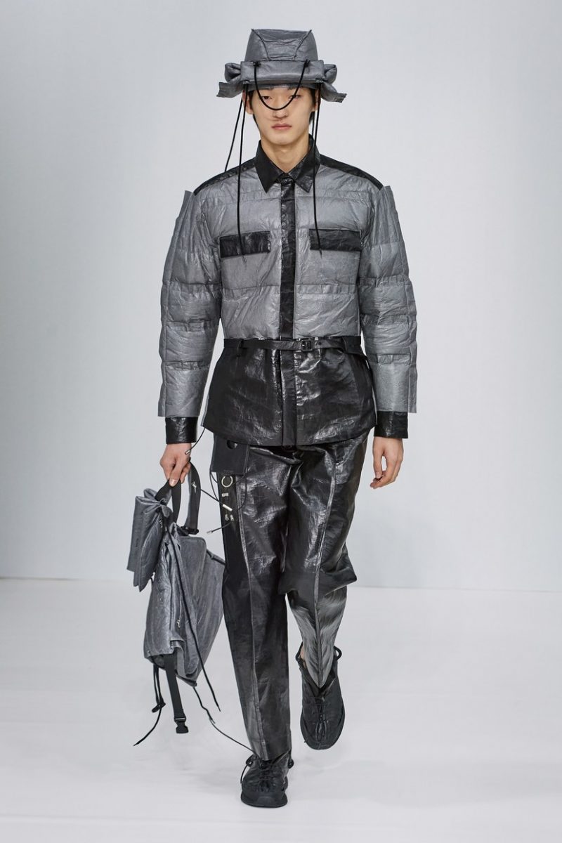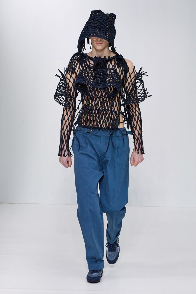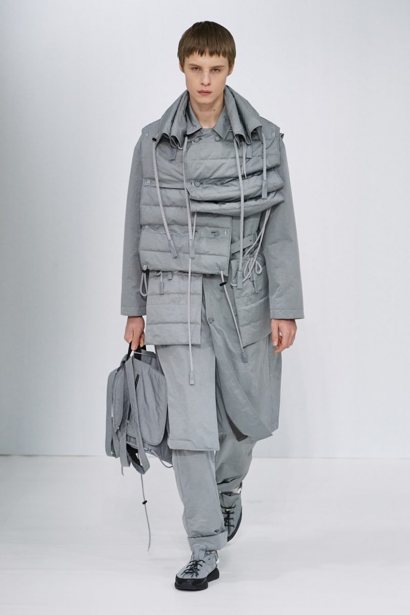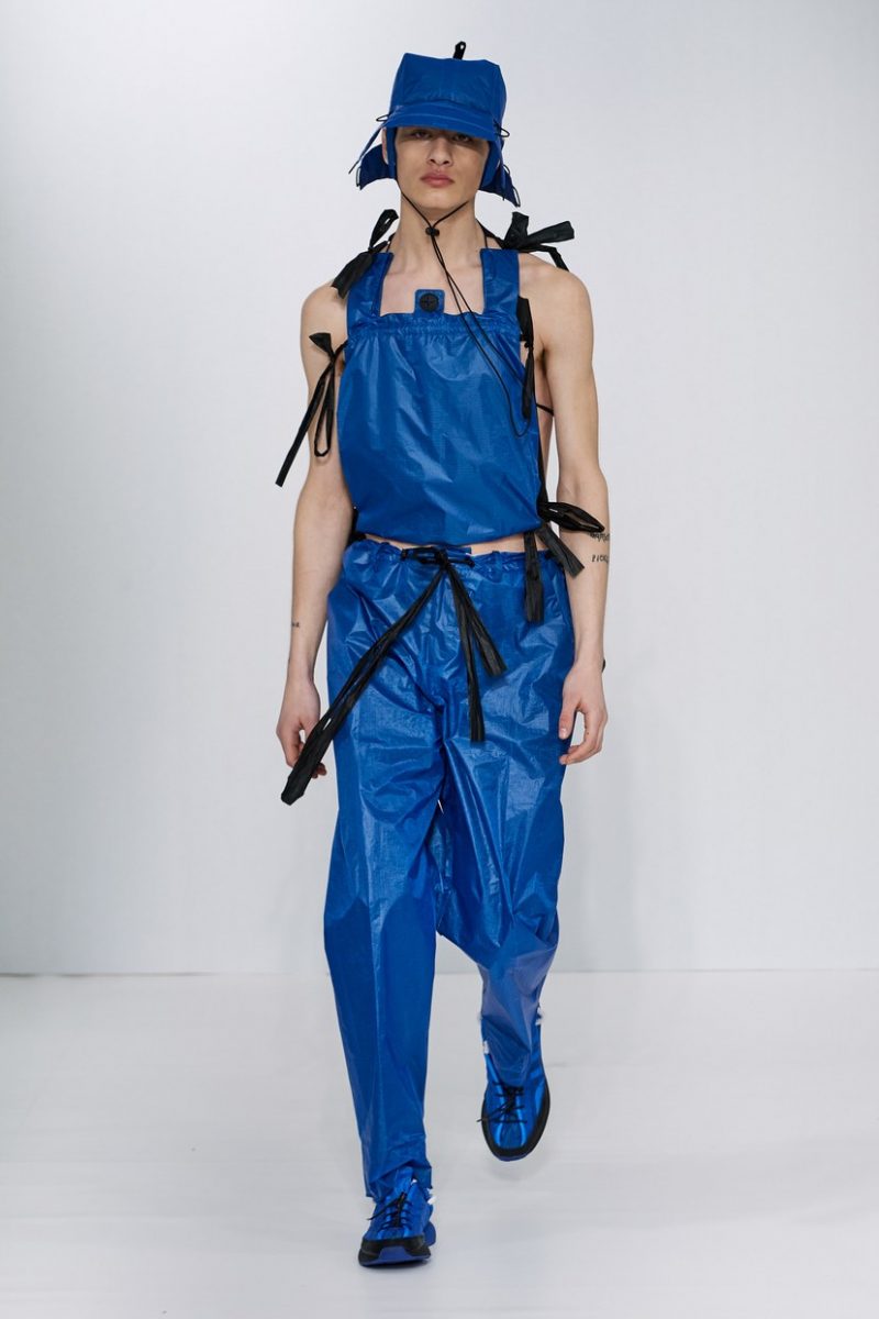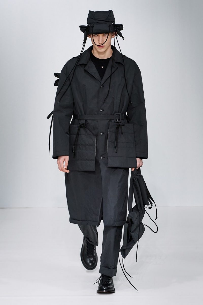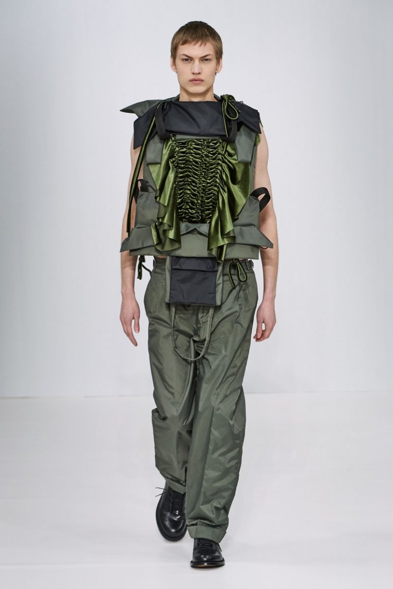 Inspirées des uniformes de travail, les silhouettes de Craig Green sont plus qu’ingénieuses : cordons, sangles, suspensions, rembourrages et superpositions sont au programme de cette nouvelle collection.