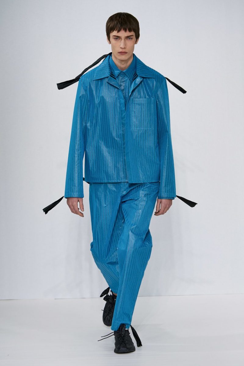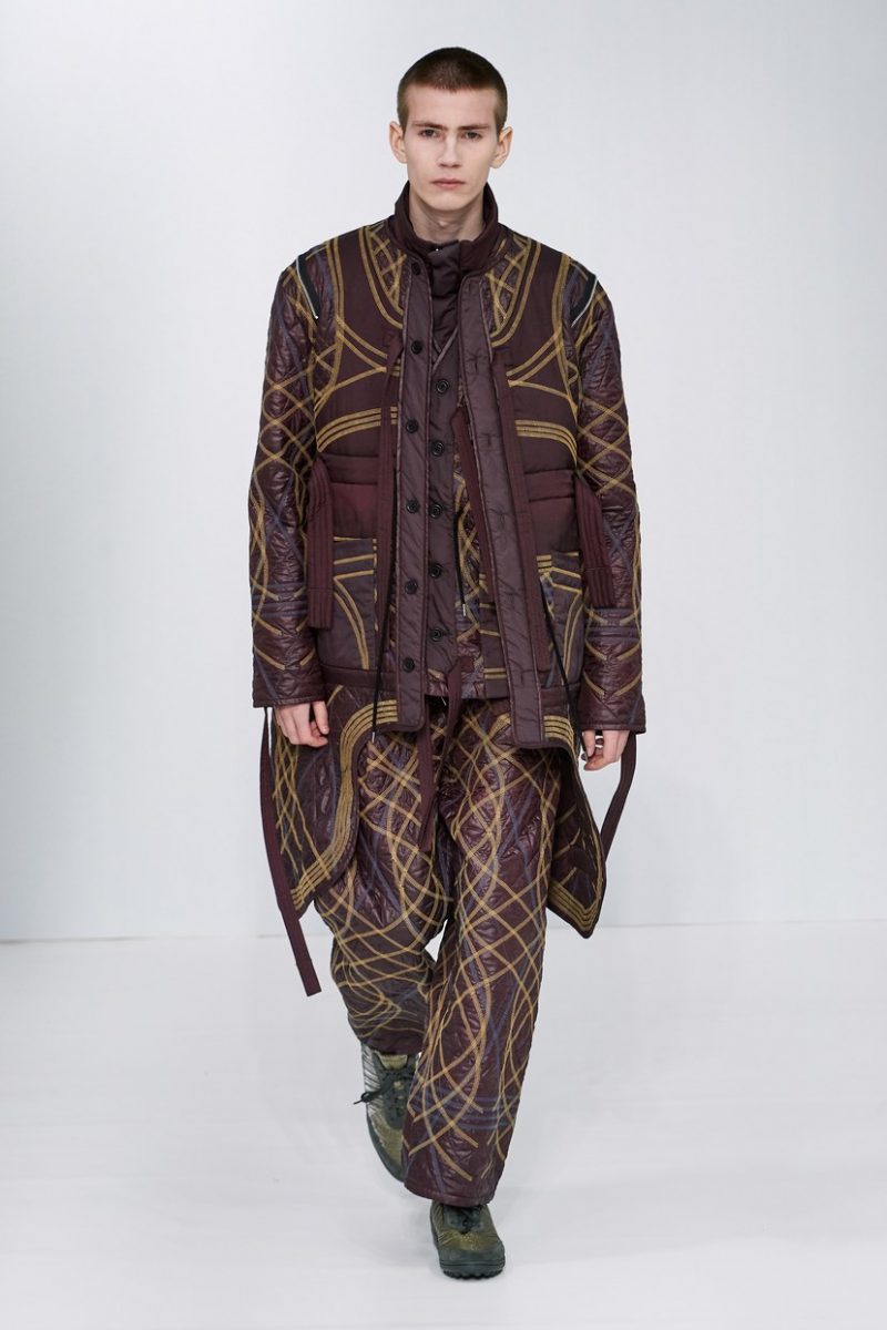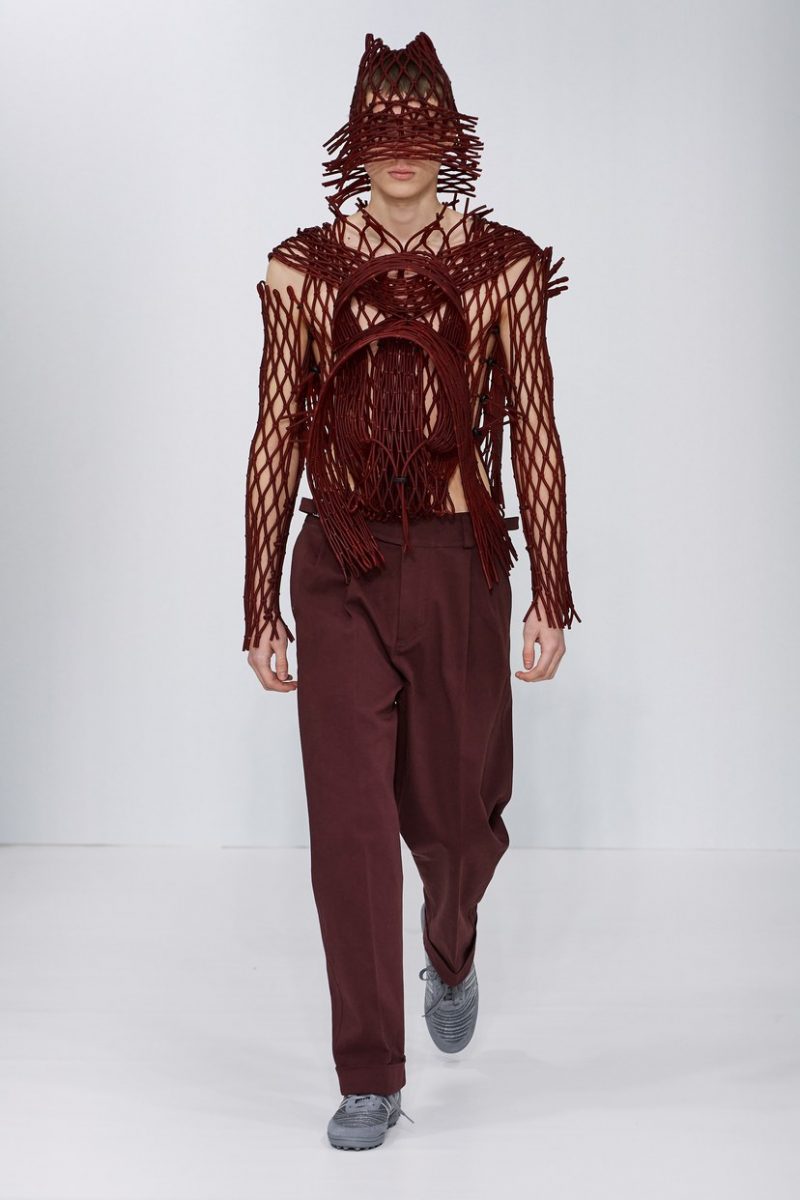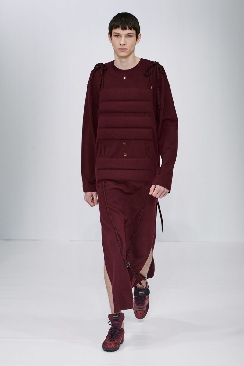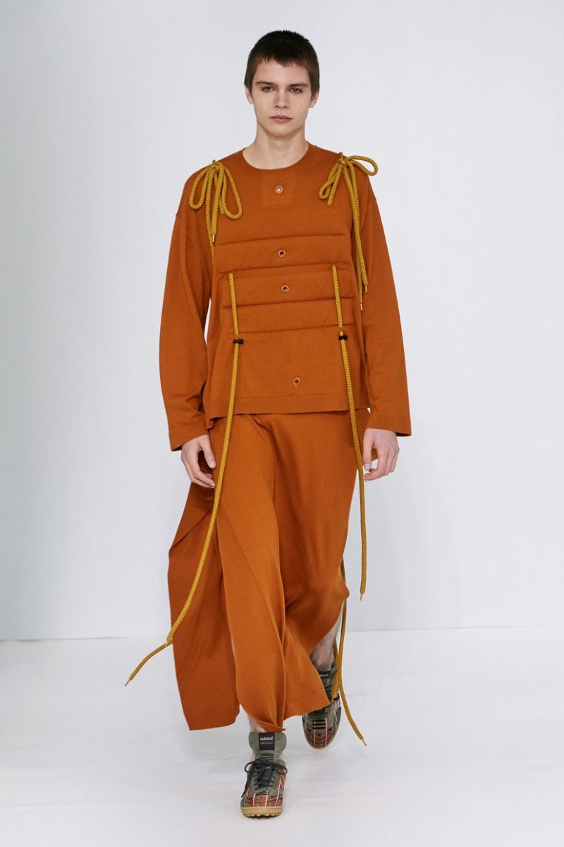 Inspirées des uniformes de travail, les silhouettes de Craig Green sont plus qu’ingénieuses : cordons, sangles, suspensions, rembourrages et superpositions sont au programme de cette nouvelle collection.
