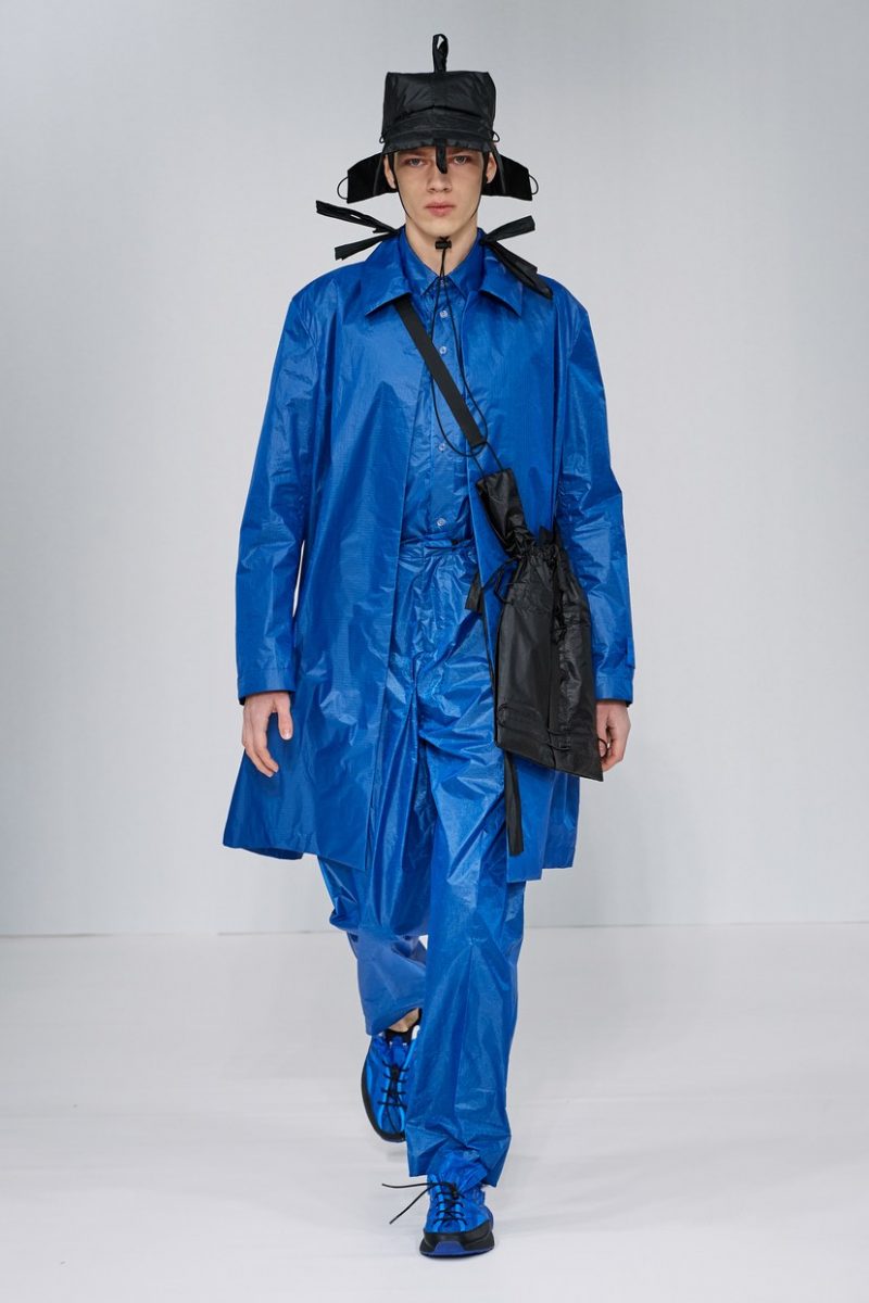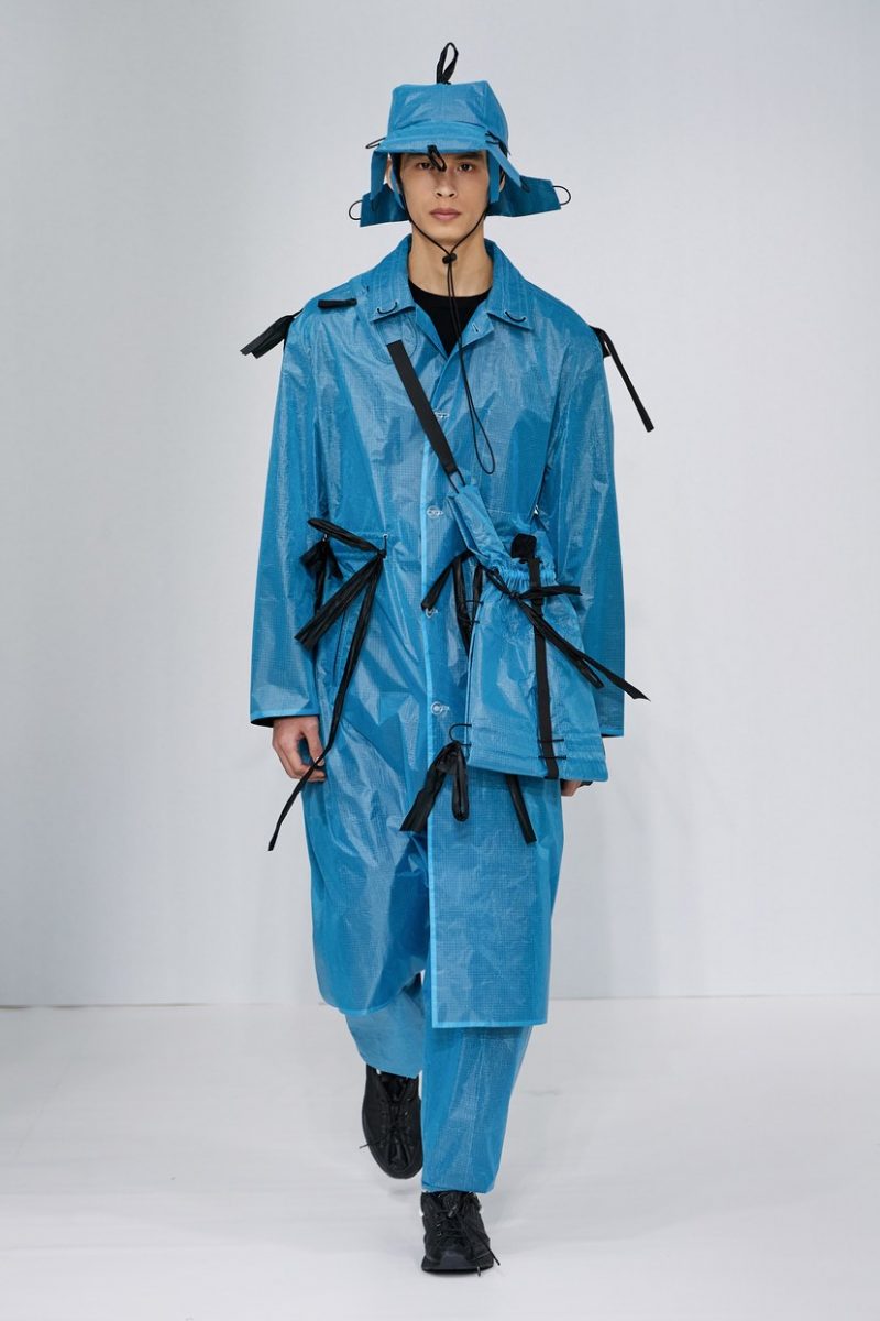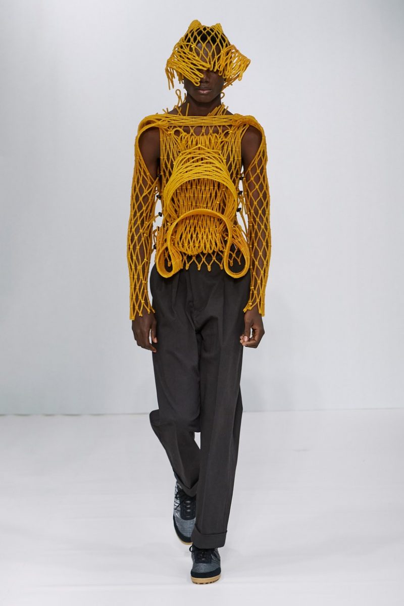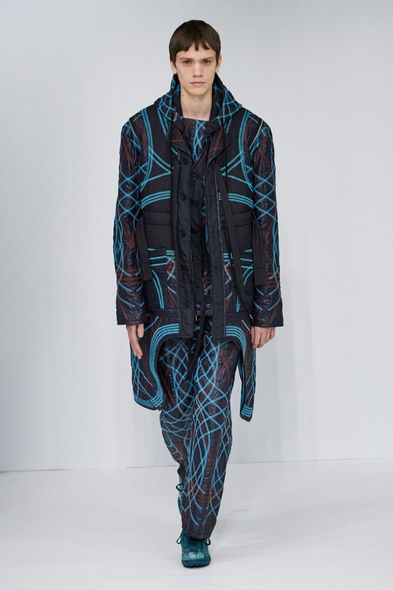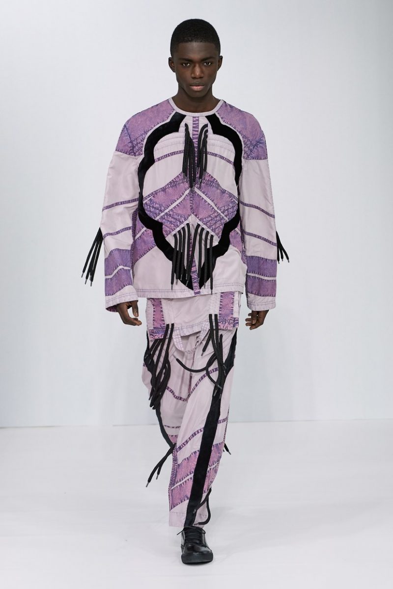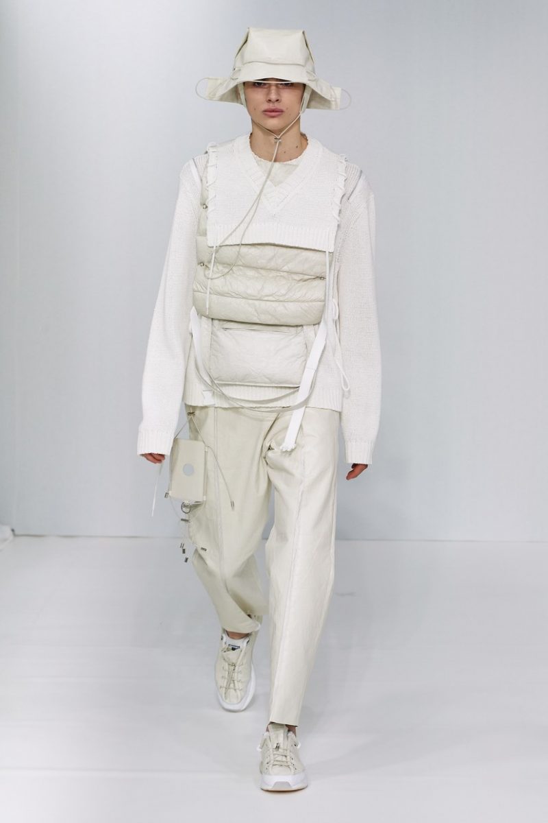 Inspirées des uniformes de travail, les silhouettes de Craig Green sont plus qu’ingénieuses : cordons, sangles, suspensions, rembourrages et superpositions sont au programme de cette nouvelle collection.