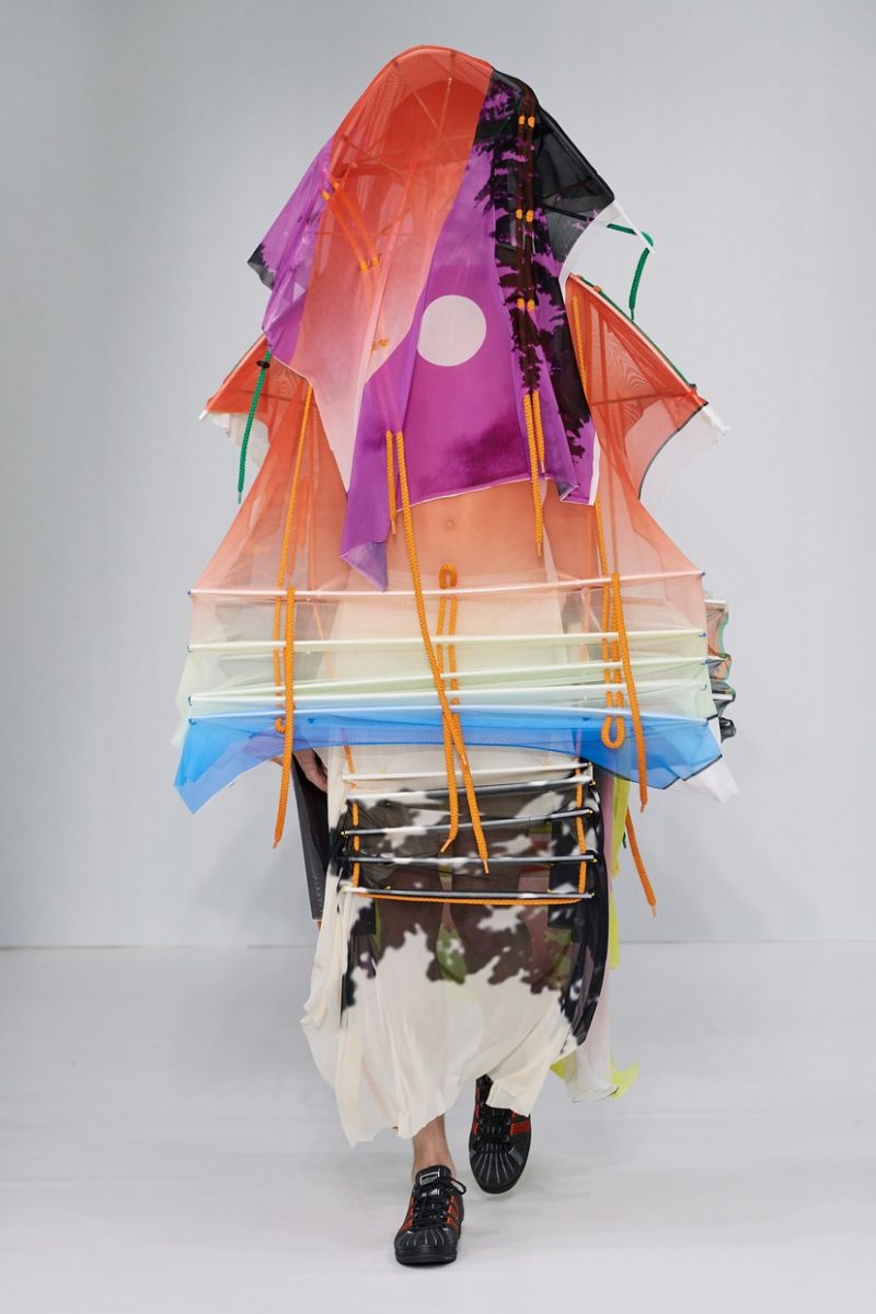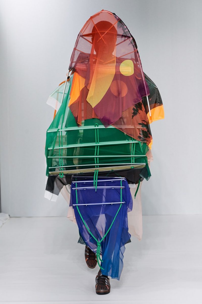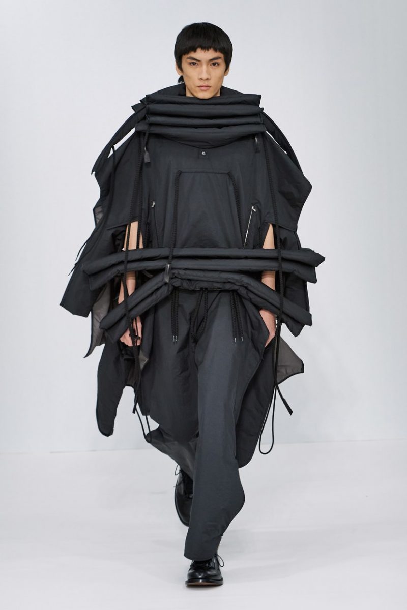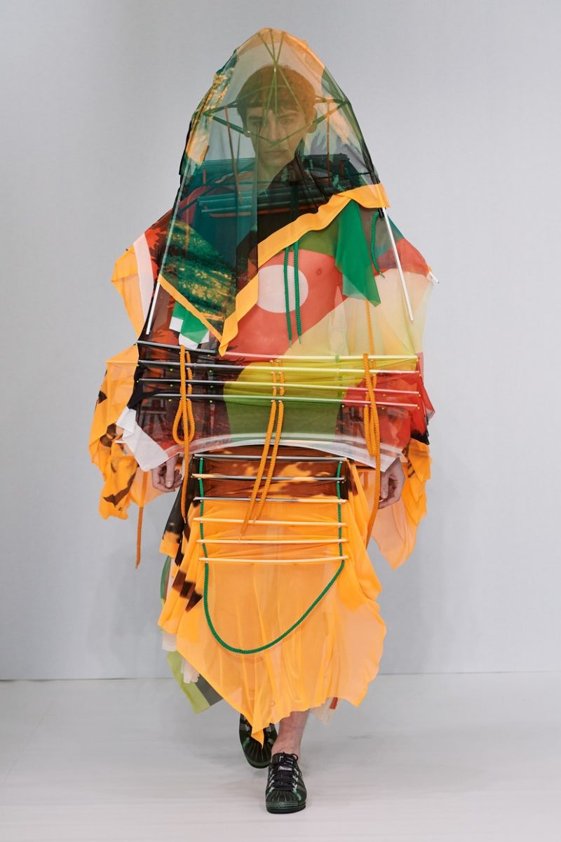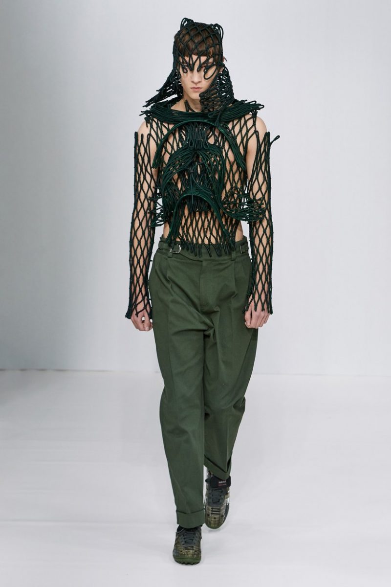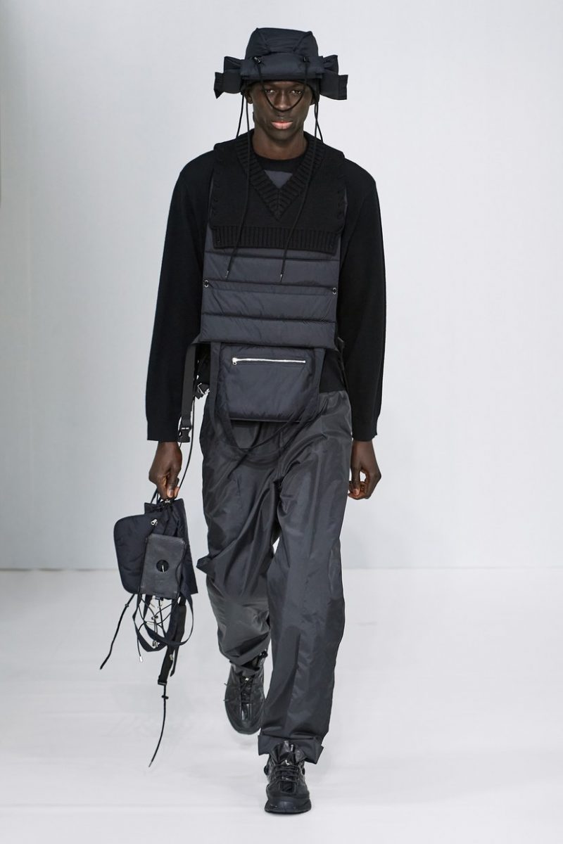 Inspirées des uniformes de travail, les silhouettes de Craig Green sont plus qu’ingénieuses : cordons, sangles, suspensions, rembourrages et superpositions sont au programme de cette nouvelle collection.