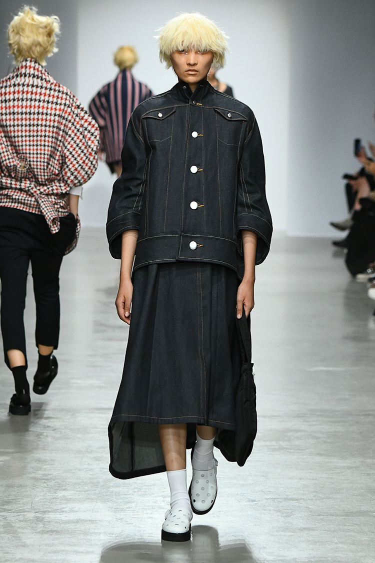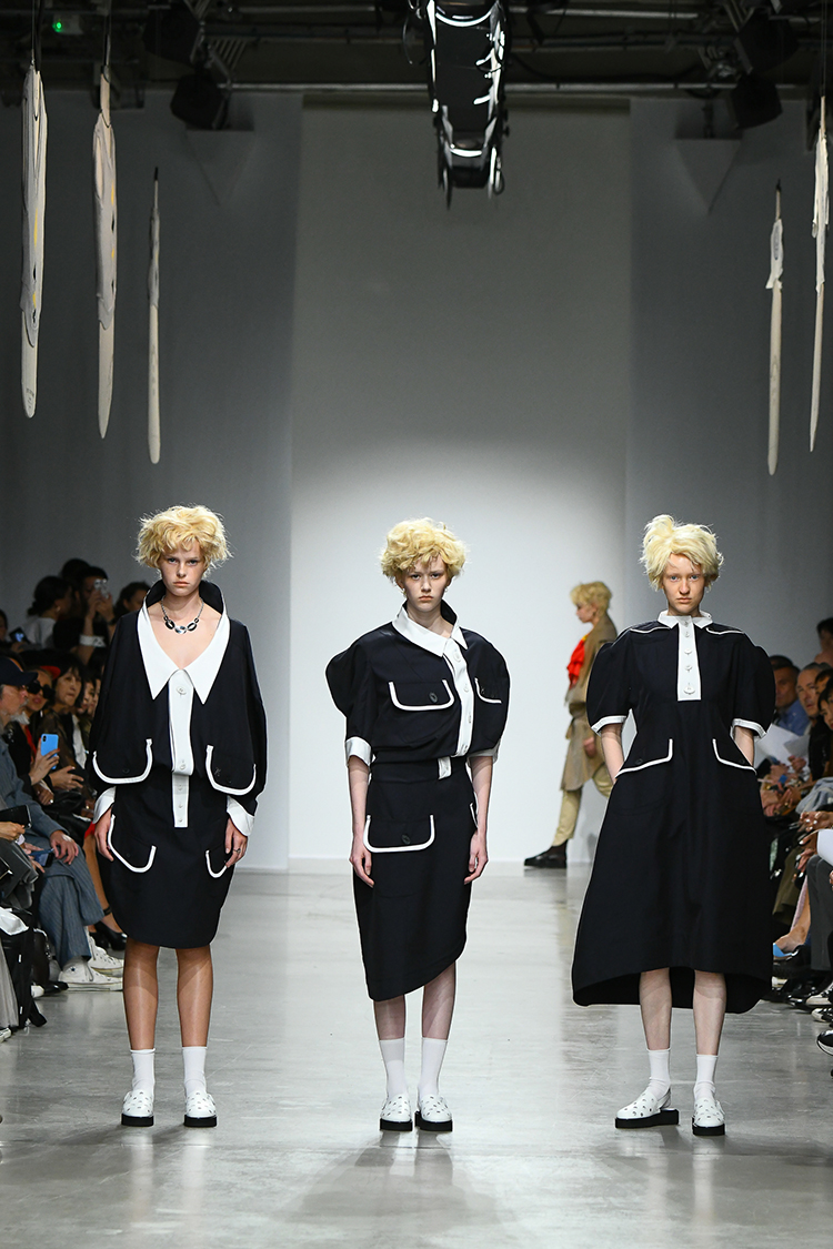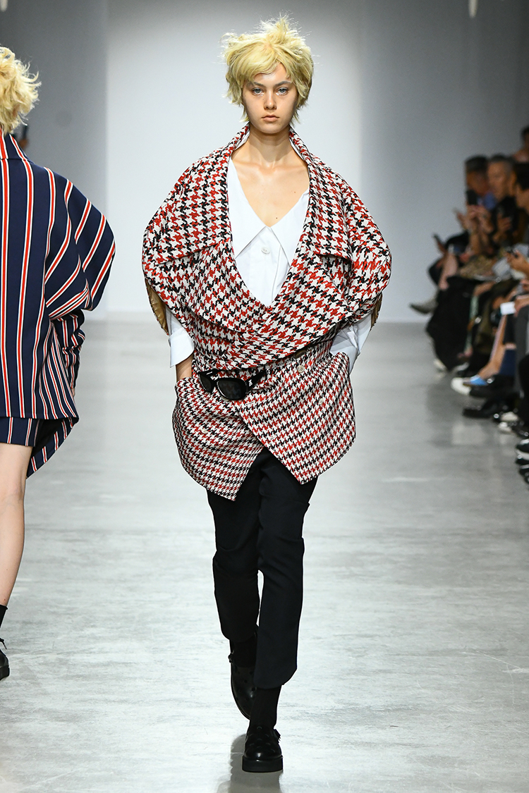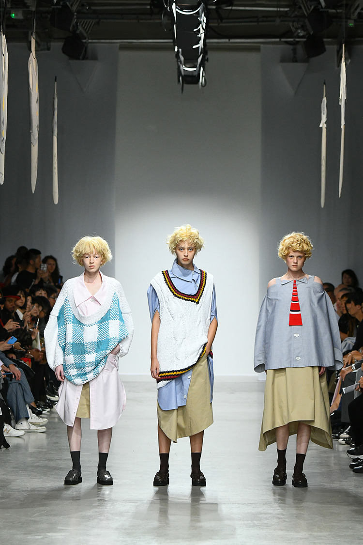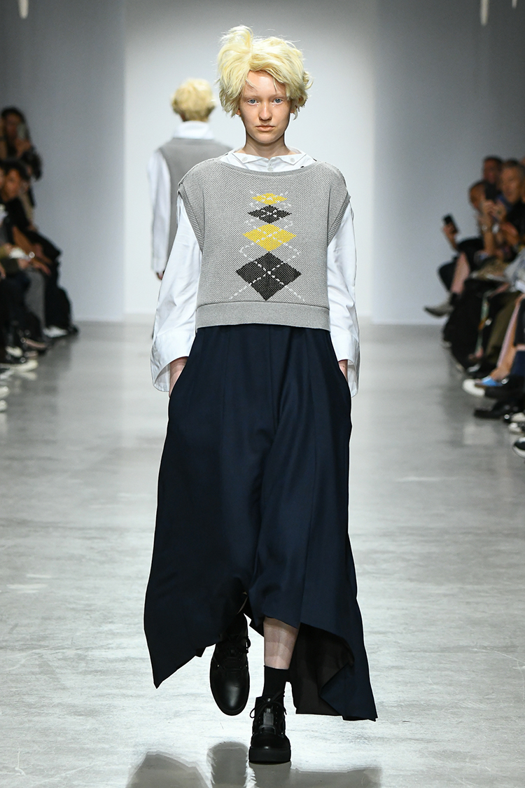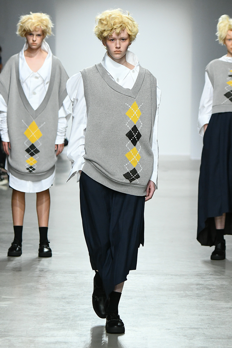 Le défilé se démarque par sa chorégraphie particulière. Les mannequins défilent trois par trois, reproduisant à chaque passage un angle visuel différent comme si l’on pouvait voir le show d’en haut, d’en bas ou de côté. Kunihiko s’amuse avec nos perceptions, aussi bien dans la mise en scène que dans les vêtements ; pièces asymétriques, tricots en losange, coupes oversize et autres ourlets raccourcis soulignent la notion de perspective visuelle.