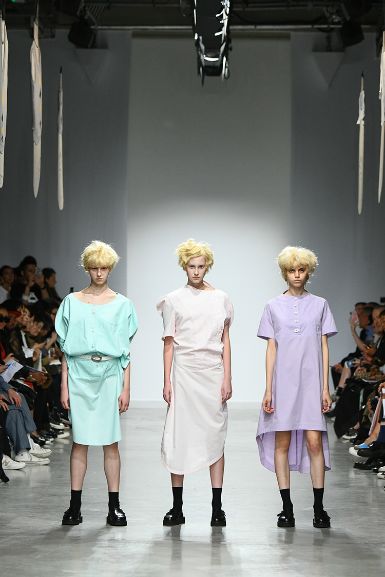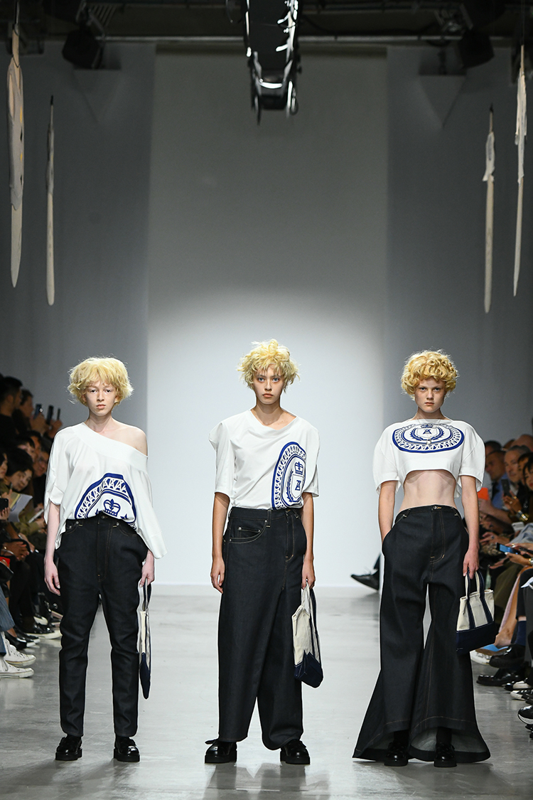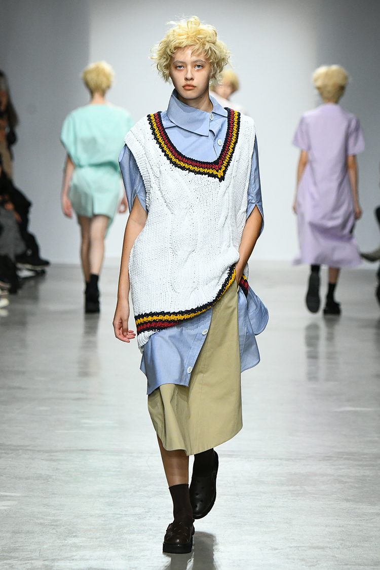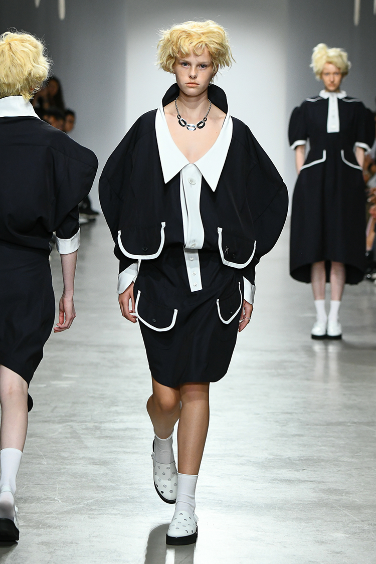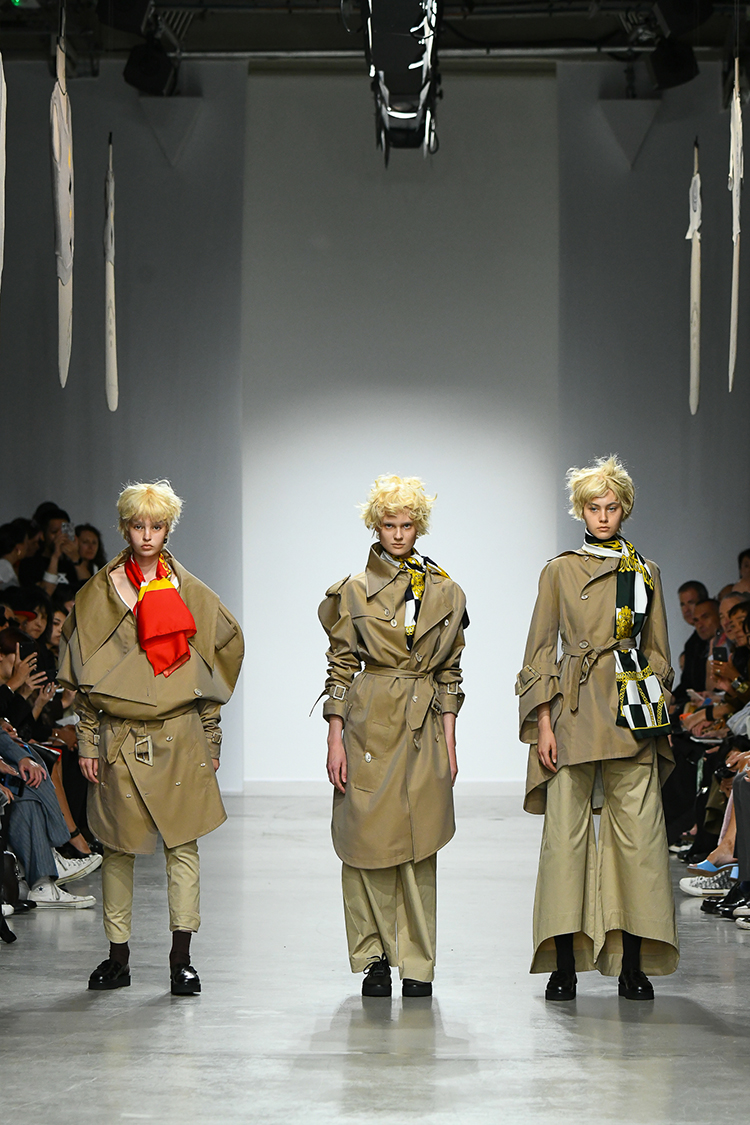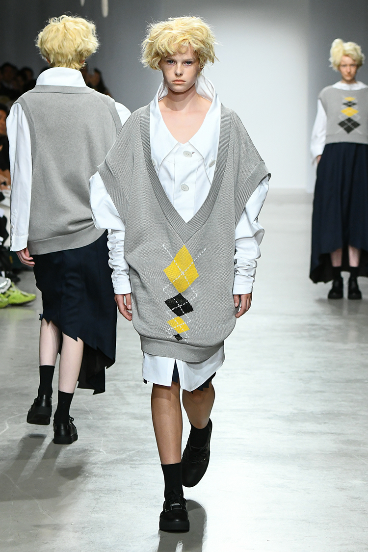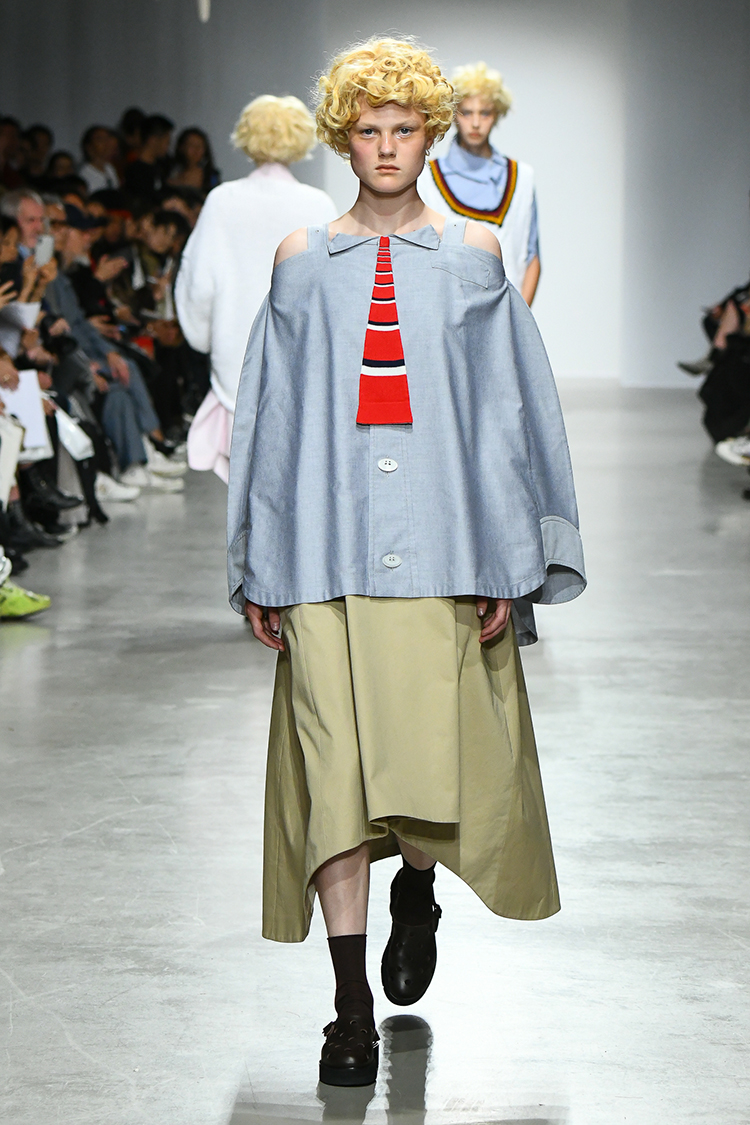Le défilé se démarque par sa chorégraphie particulière. Les mannequins défilent trois par trois, reproduisant à chaque passage un angle visuel différent comme si l’on pouvait voir le show d’en haut, d’en bas ou de côté. Kunihiko s’amuse avec nos perceptions, aussi bien dans la mise en scène que dans les vêtements ; pièces asymétriques, tricots en losange, coupes oversize et autres ourlets raccourcis soulignent la notion de perspective visuelle.