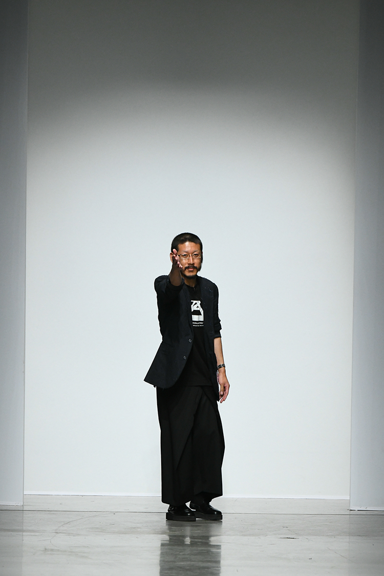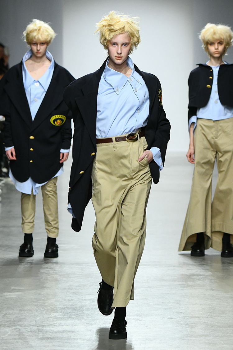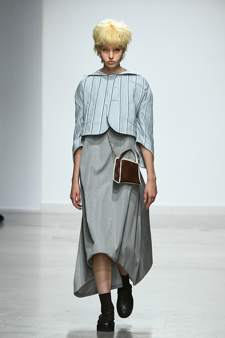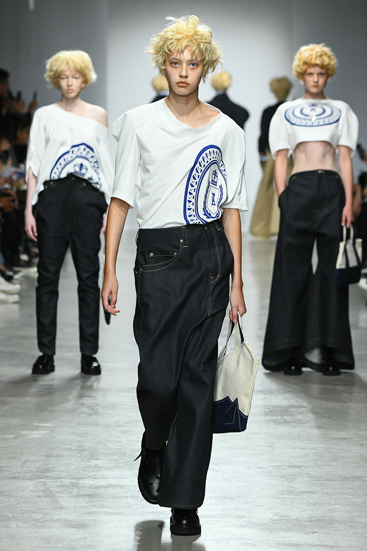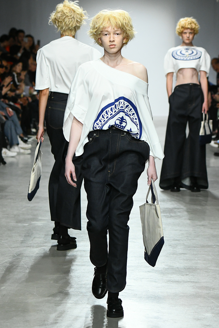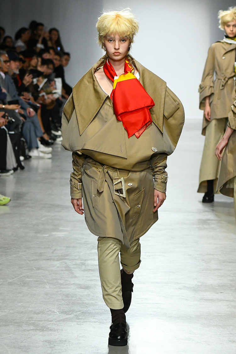 Le défilé se démarque par sa chorégraphie particulière. Les mannequins défilent trois par trois, reproduisant à chaque passage un angle visuel différent comme si l’on pouvait voir le show d’en haut, d’en bas ou de côté. Kunihiko s’amuse avec nos perceptions, aussi bien dans la mise en scène que dans les vêtements ; pièces asymétriques, tricots en losange, coupes oversize et autres ourlets raccourcis soulignent la notion de perspective visuelle.