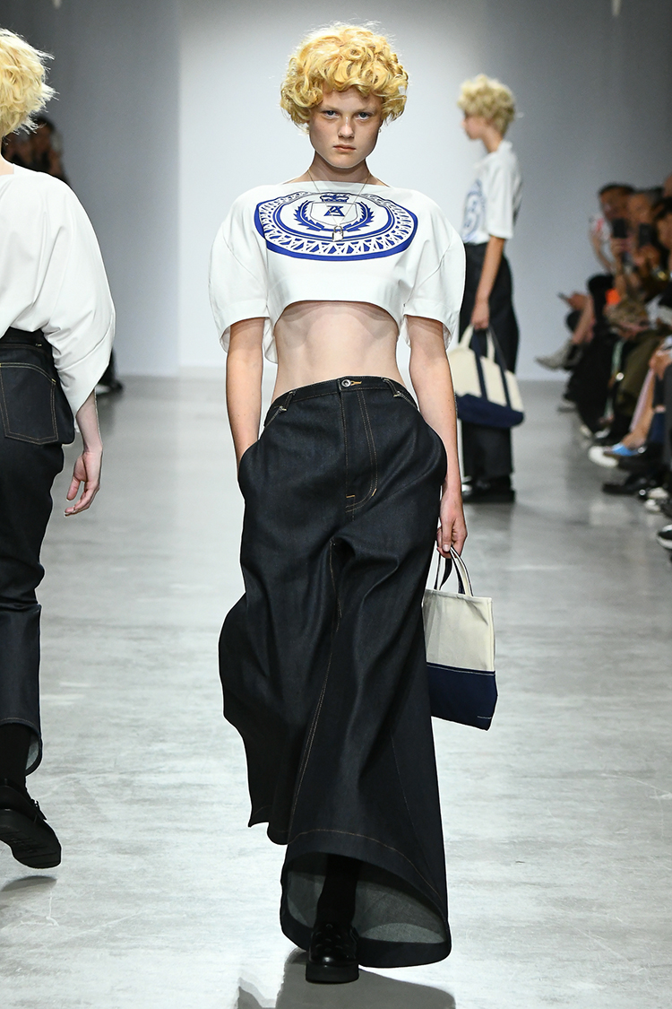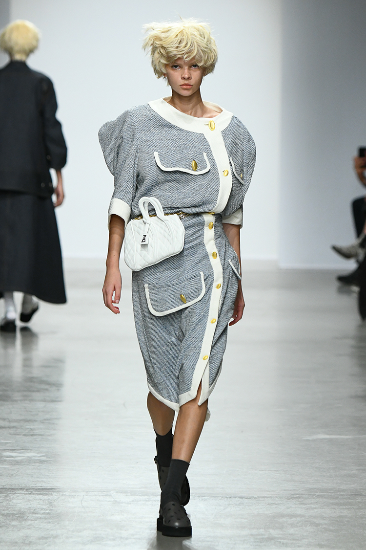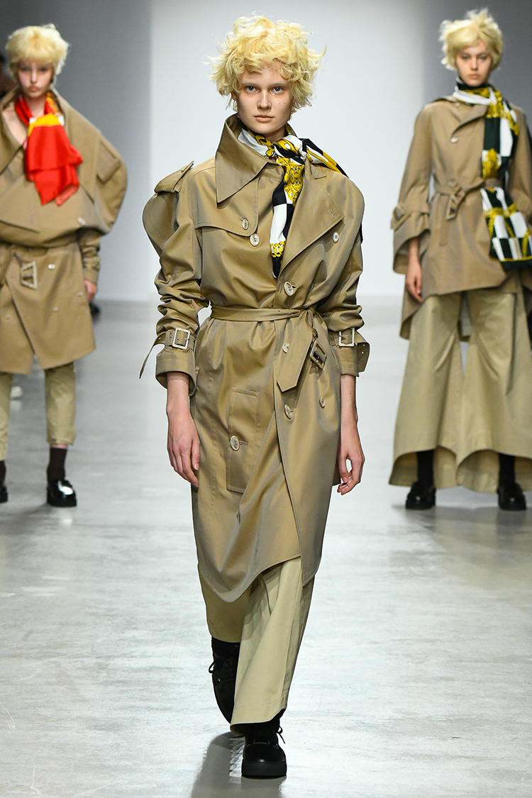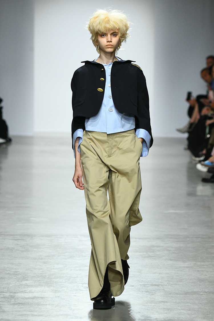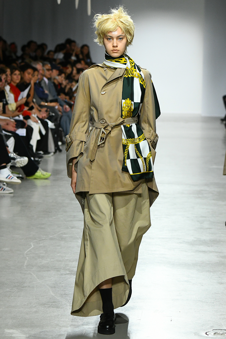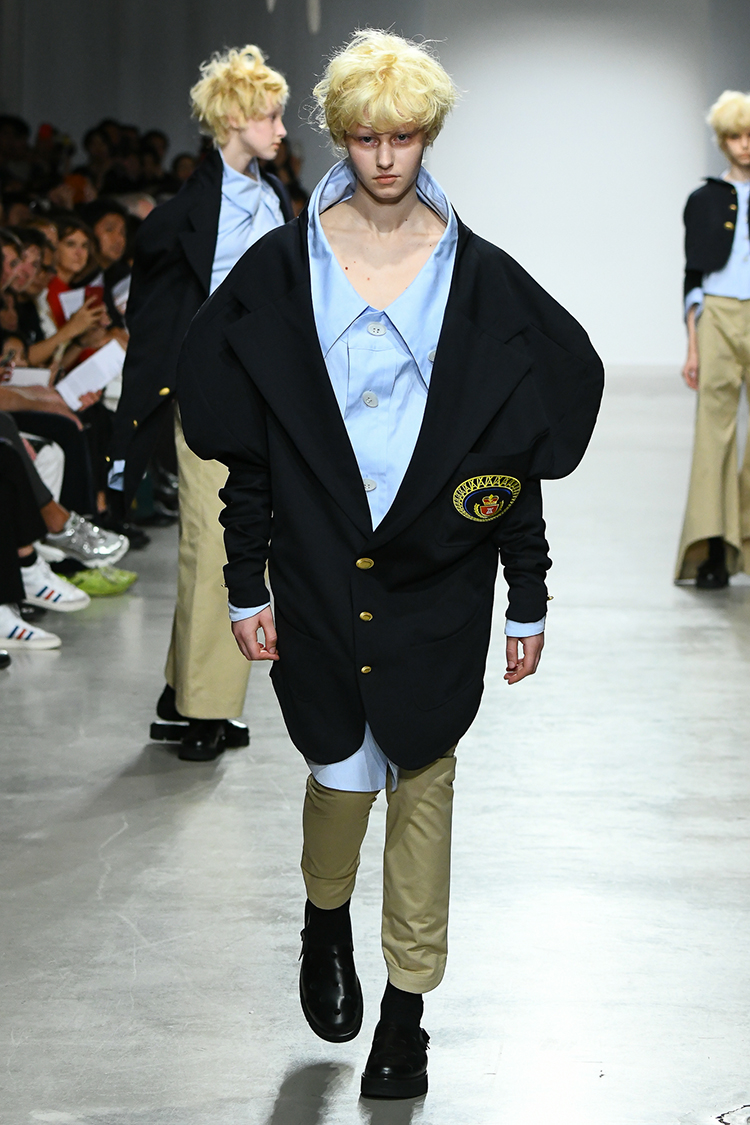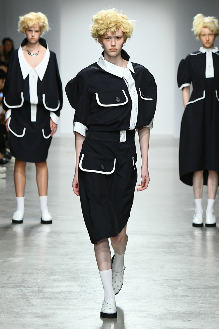 Le défilé se démarque par sa chorégraphie particulière. Les mannequins défilent trois par trois, reproduisant à chaque passage un angle visuel différent comme si l’on pouvait voir le show d’en haut, d’en bas ou de côté. Kunihiko s’amuse avec nos perceptions, aussi bien dans la mise en scène que dans les vêtements ; pièces asymétriques, tricots en losange, coupes oversize et autres ourlets raccourcis soulignent la notion de perspective visuelle.