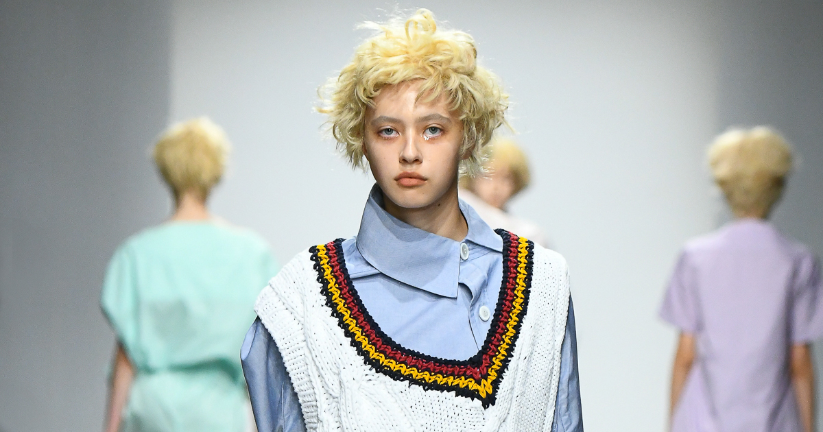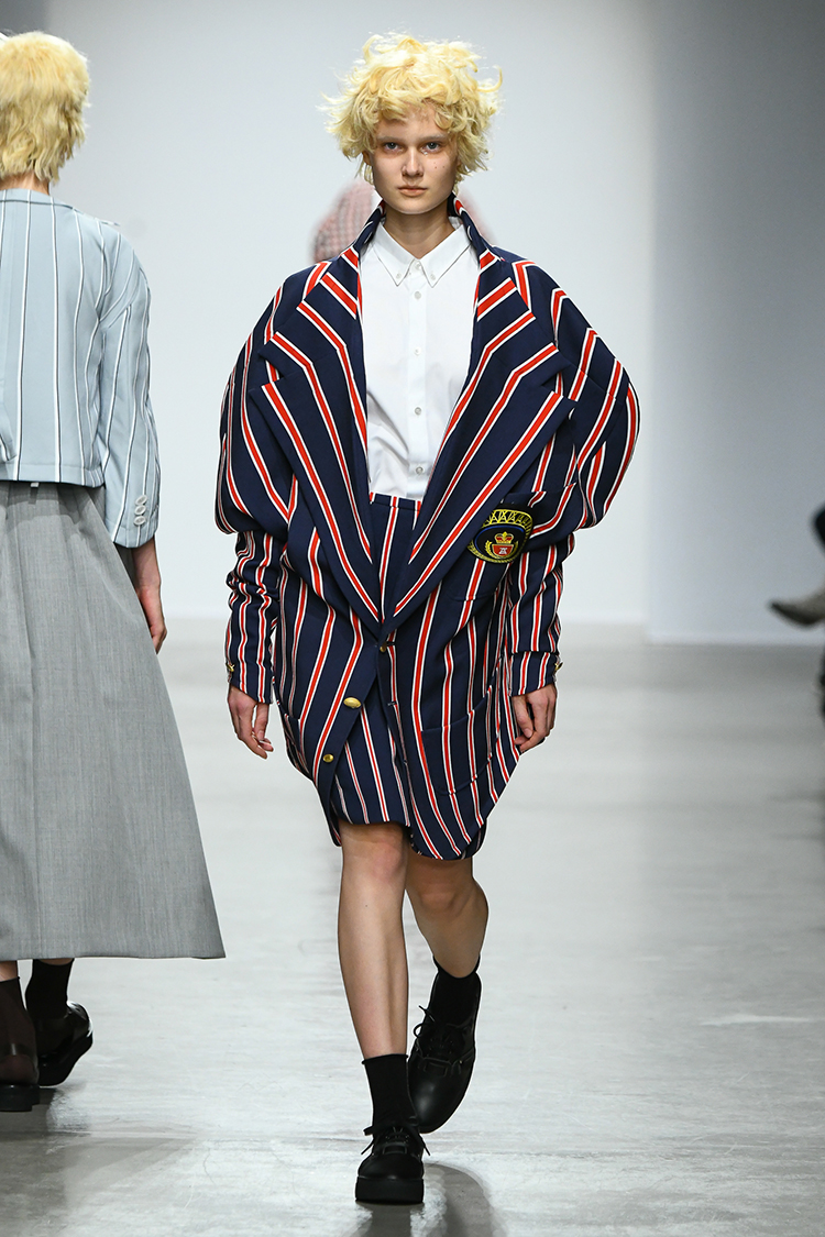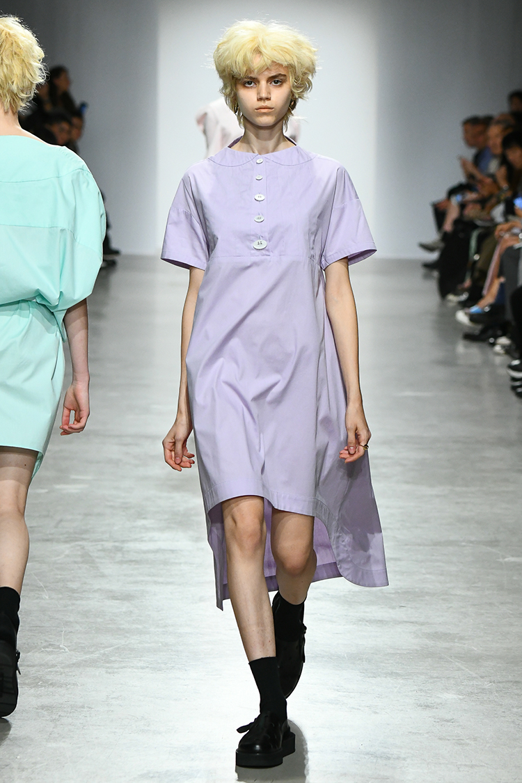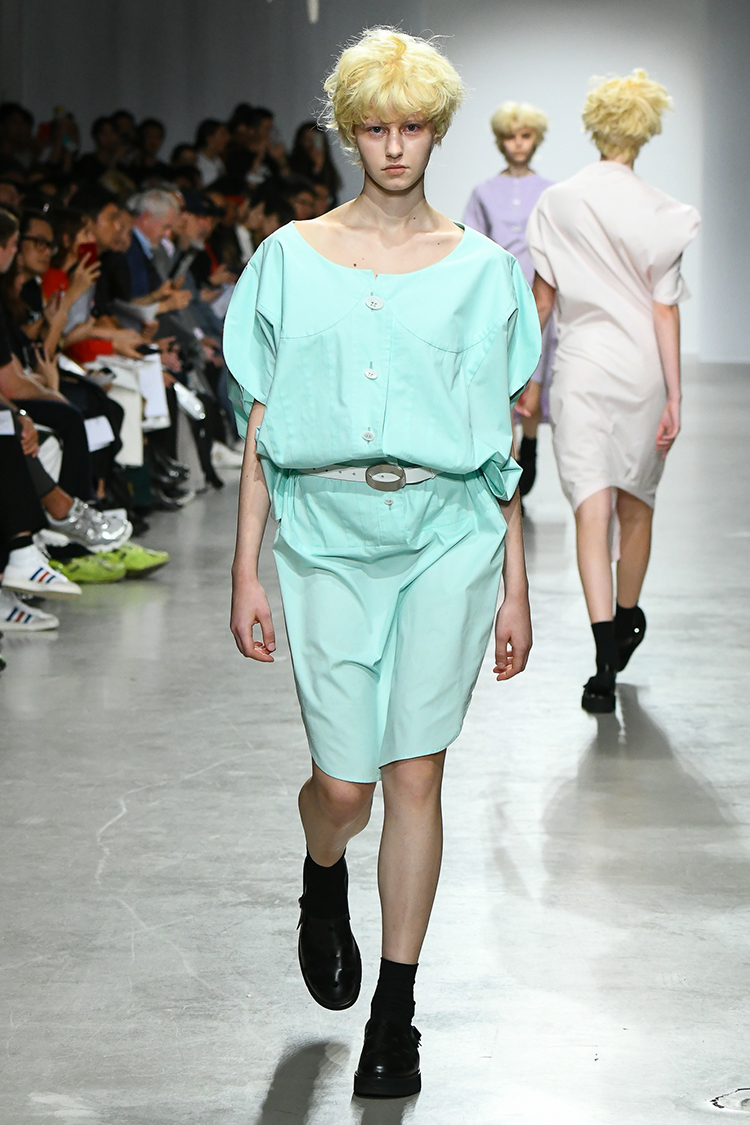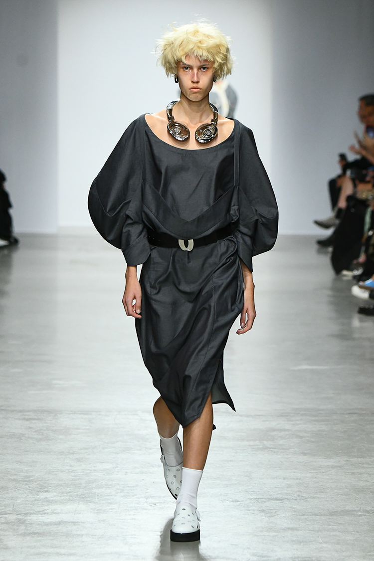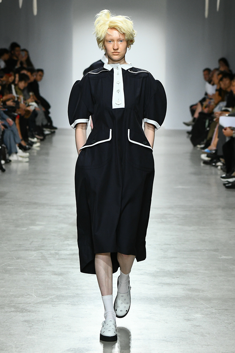 Le défilé se démarque par sa chorégraphie particulière. Les mannequins défilent trois par trois, reproduisant à chaque passage un angle visuel différent comme si l’on pouvait voir le show d’en haut, d’en bas ou de côté. Kunihiko s’amuse avec nos perceptions, aussi bien dans la mise en scène que dans les vêtements ; pièces asymétriques, tricots en losange, coupes oversize et autres ourlets raccourcis soulignent la notion de perspective visuelle.