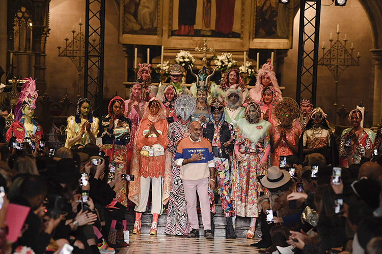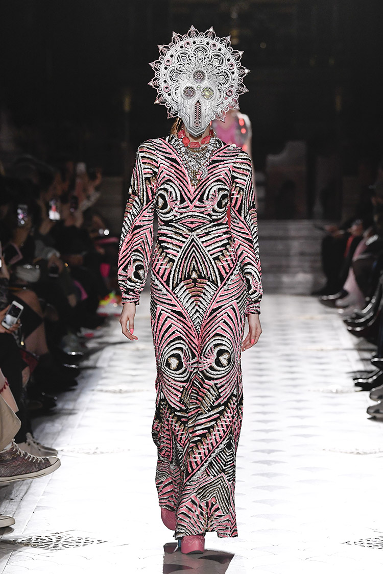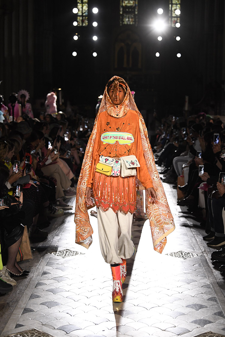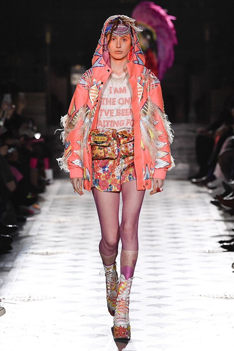 Protégées par des visières réfléchissantes incrustées de pierres précieuses, des androïdes apocalyptiques traversent des paysages désertiques poussiéreux. La vision de Manish Arora d’Armageddon restera toujours une expérience optimiste saupoudrée de rose, d’orange ou d’imprimés fluo percutants. Des messages forts s’immiscent sur des pulls molletonnés pensés pour la génération Instagram : ‘Finally Normal People’, ‘I am the one I have been waiting for’, ‘What if this is all real’, et bien d’autres. Un peu de couleur dans ce monde en déperdition n’a jamais fait de mal.
