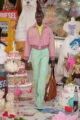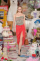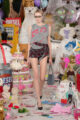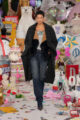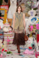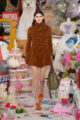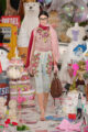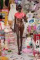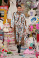 La collection s’embrase littéralement avec des manteaux en fourrure zébrés de flammes orange et électriques, des coutures lumineuses irradiant le rose et le turquoise, et des cuirs pastel laminés. Les silhouettes oscillent entre exubérance pop et désirabilité commerciale. Patchworks explosifs, jupes nouées façon chemise en flanelle, denim floqué et organza lustré composent un vestiaire hybride, aussi spectaculaire que portable.
