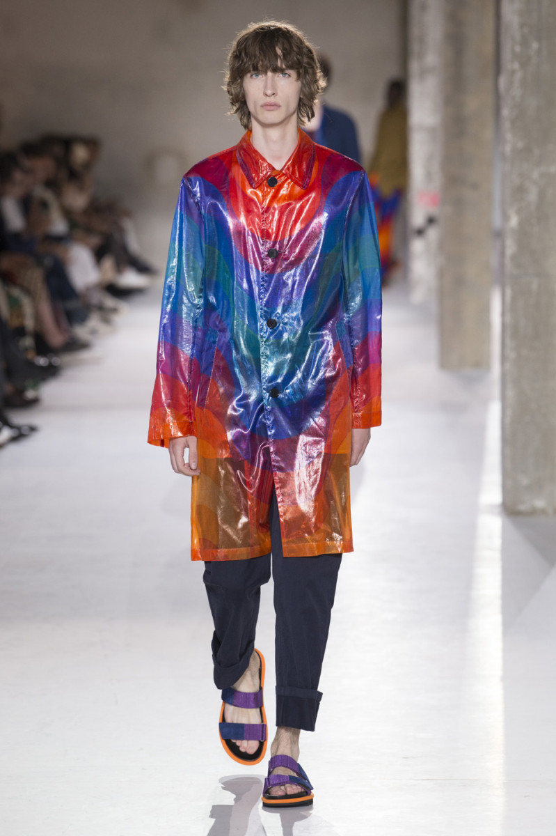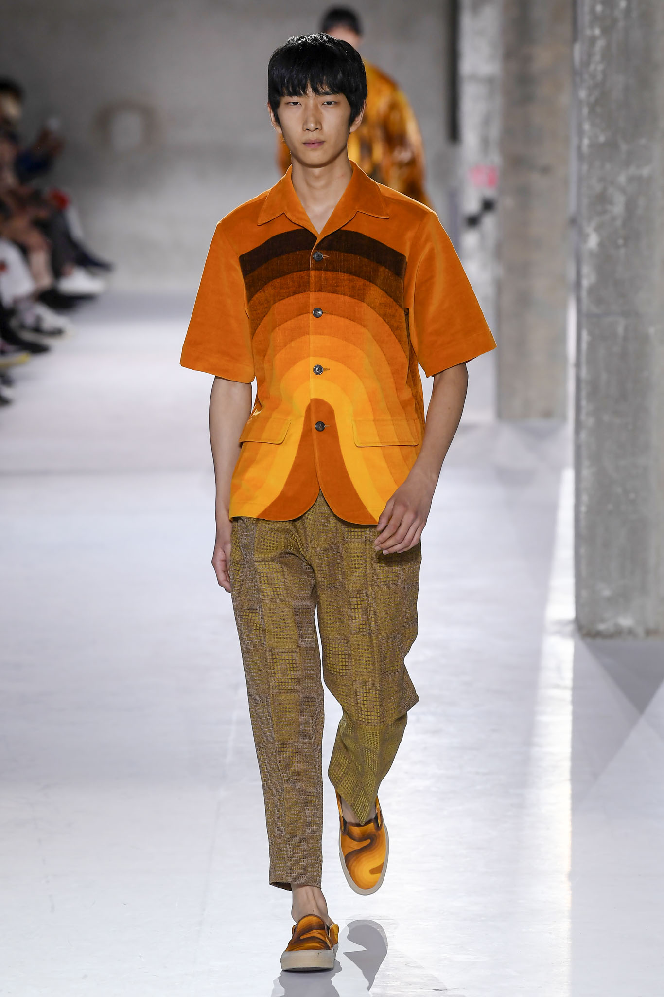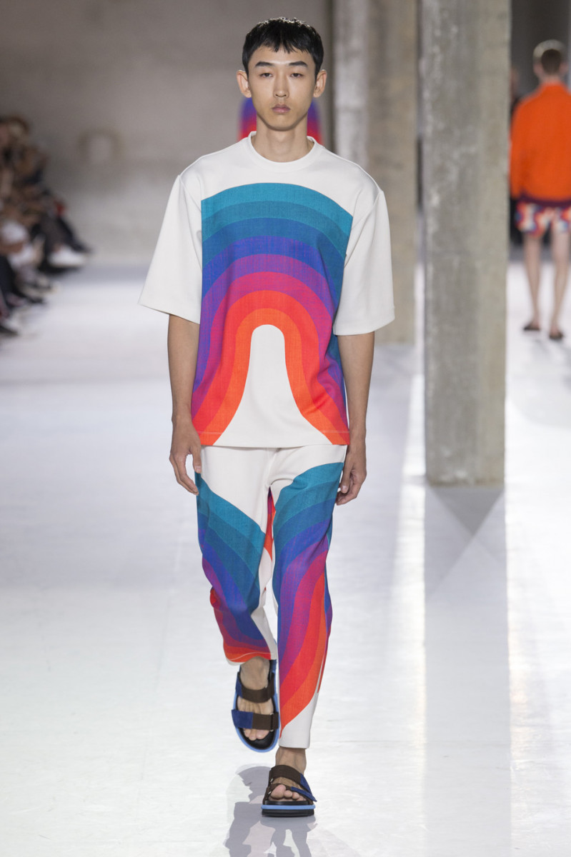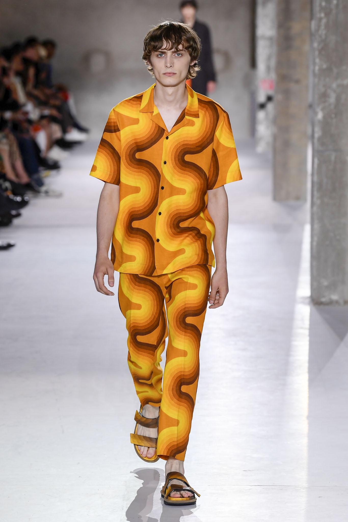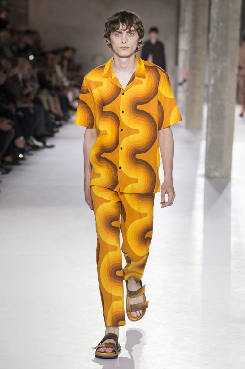 On retrouve des imprimés psychédéliques sur les t-shirts, les shorts ou encore les blazers, accompagnés de sandales et de slip-on. Le défilé apparaît comme un kaléidoscope de pièces colorés allant des teintes orange vermillon au bleu marine, le tout adouci par un marron chocolat. On y découvre aussi quelques looks monochromes qui viennent rythmer la danse des couleurs sur une bande son au style skiffle. Une fois de plus le créateur belge a su asseoir sa réputation avec un défilé parfaitement maîtrisé dans sa simplicité.