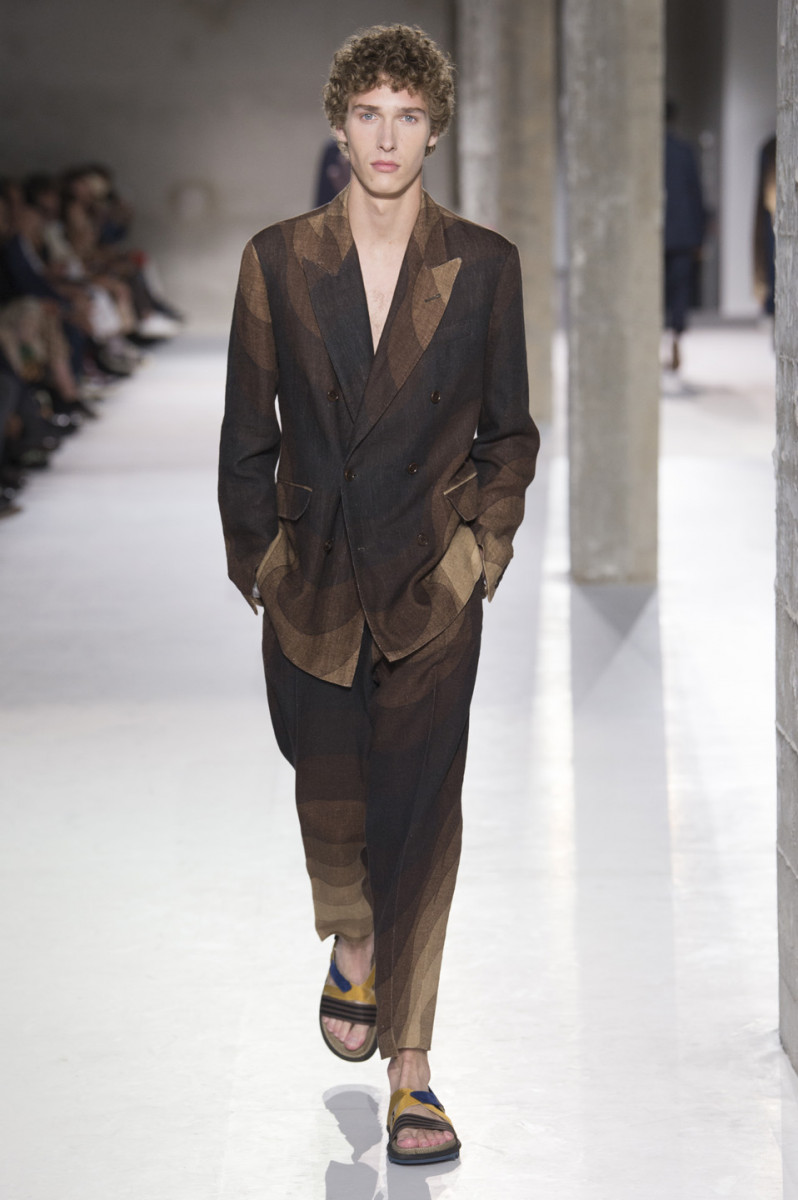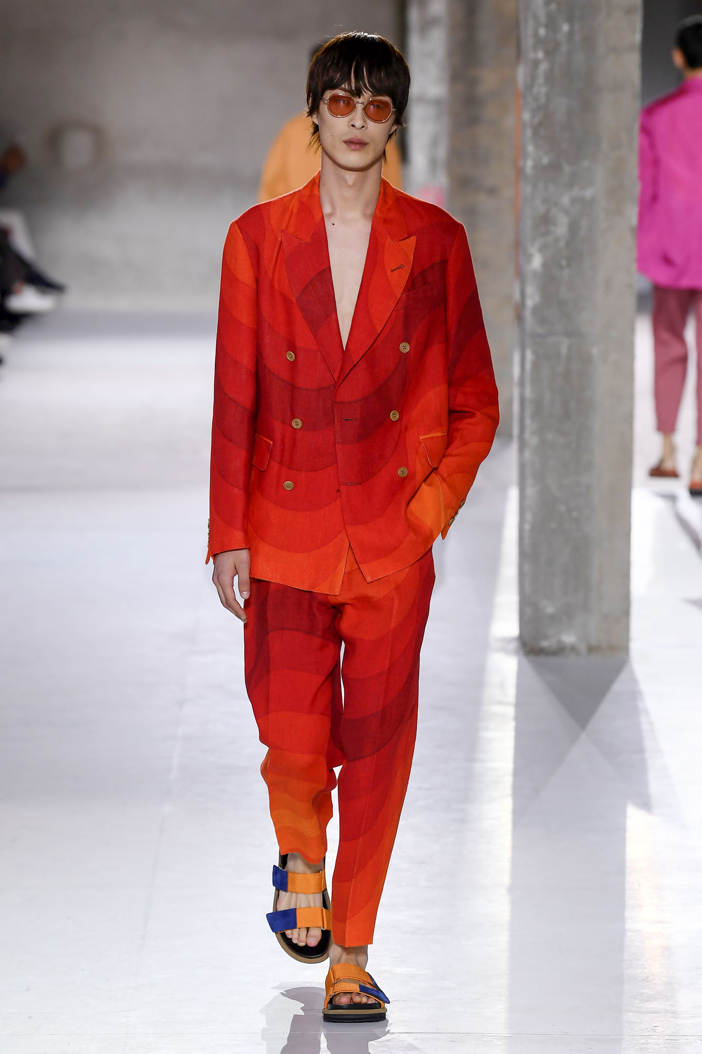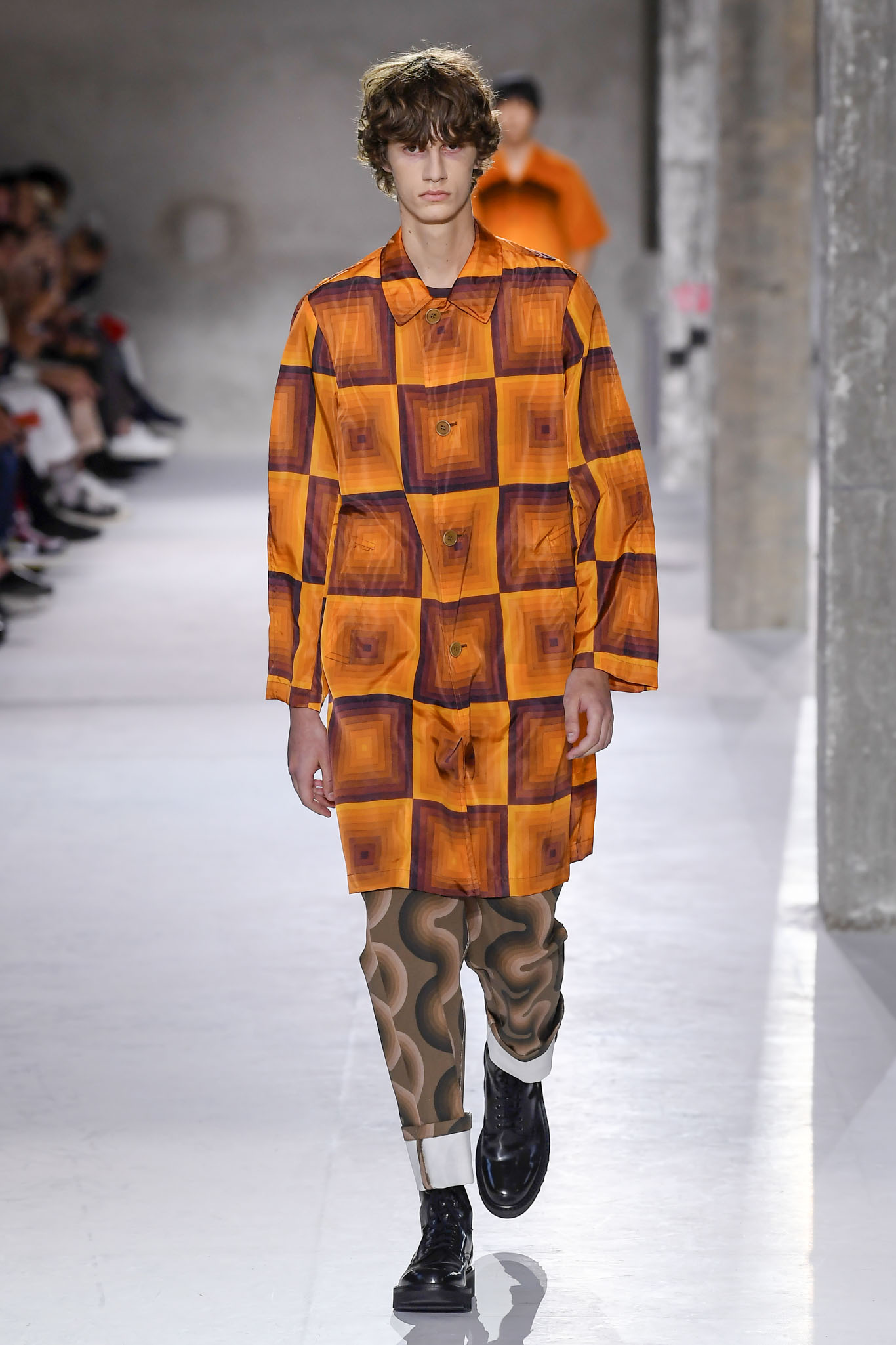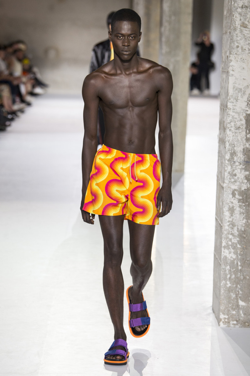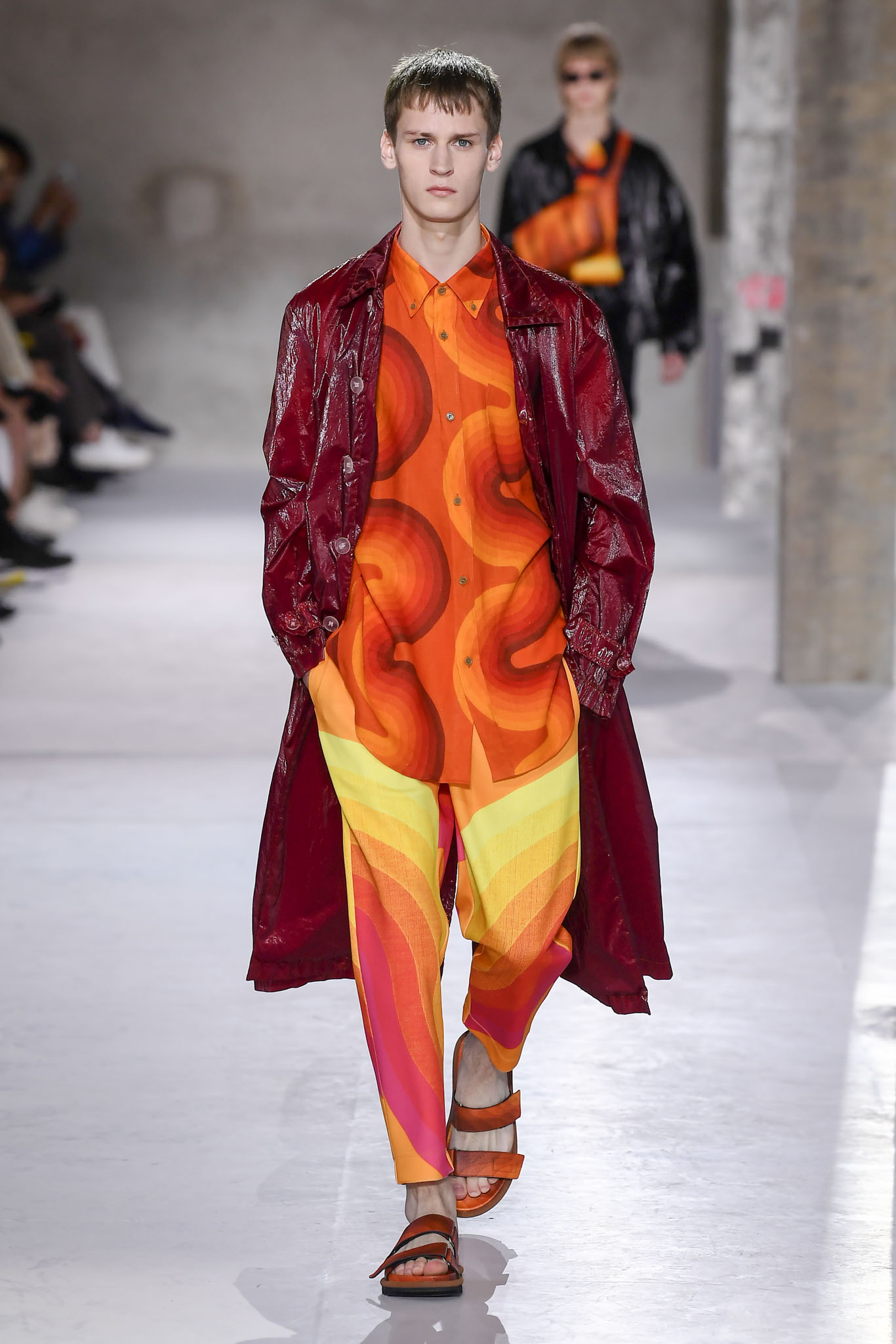 On retrouve des imprimés psychédéliques sur les t-shirts, les shorts ou encore les blazers, accompagnés de sandales et de slip-on. Le défilé apparaît comme un kaléidoscope de pièces colorés allant des teintes orange vermillon au bleu marine, le tout adouci par un marron chocolat. On y découvre aussi quelques looks monochromes qui viennent rythmer la danse des couleurs sur une bande son au style skiffle. Une fois de plus le créateur belge a su asseoir sa réputation avec un défilé parfaitement maîtrisé dans sa simplicité.
