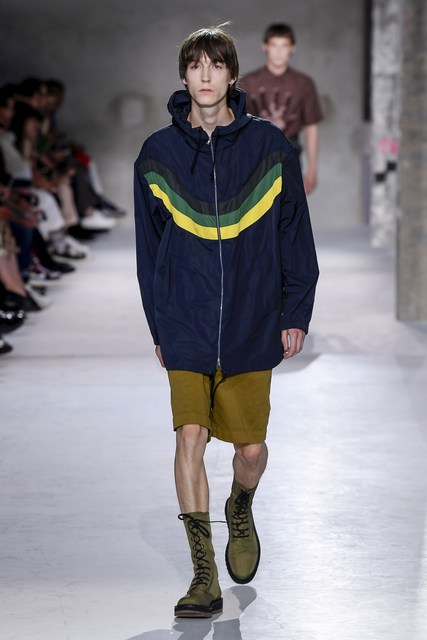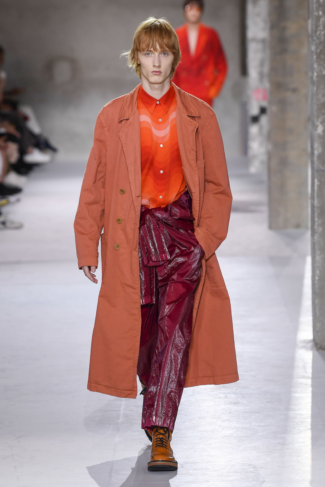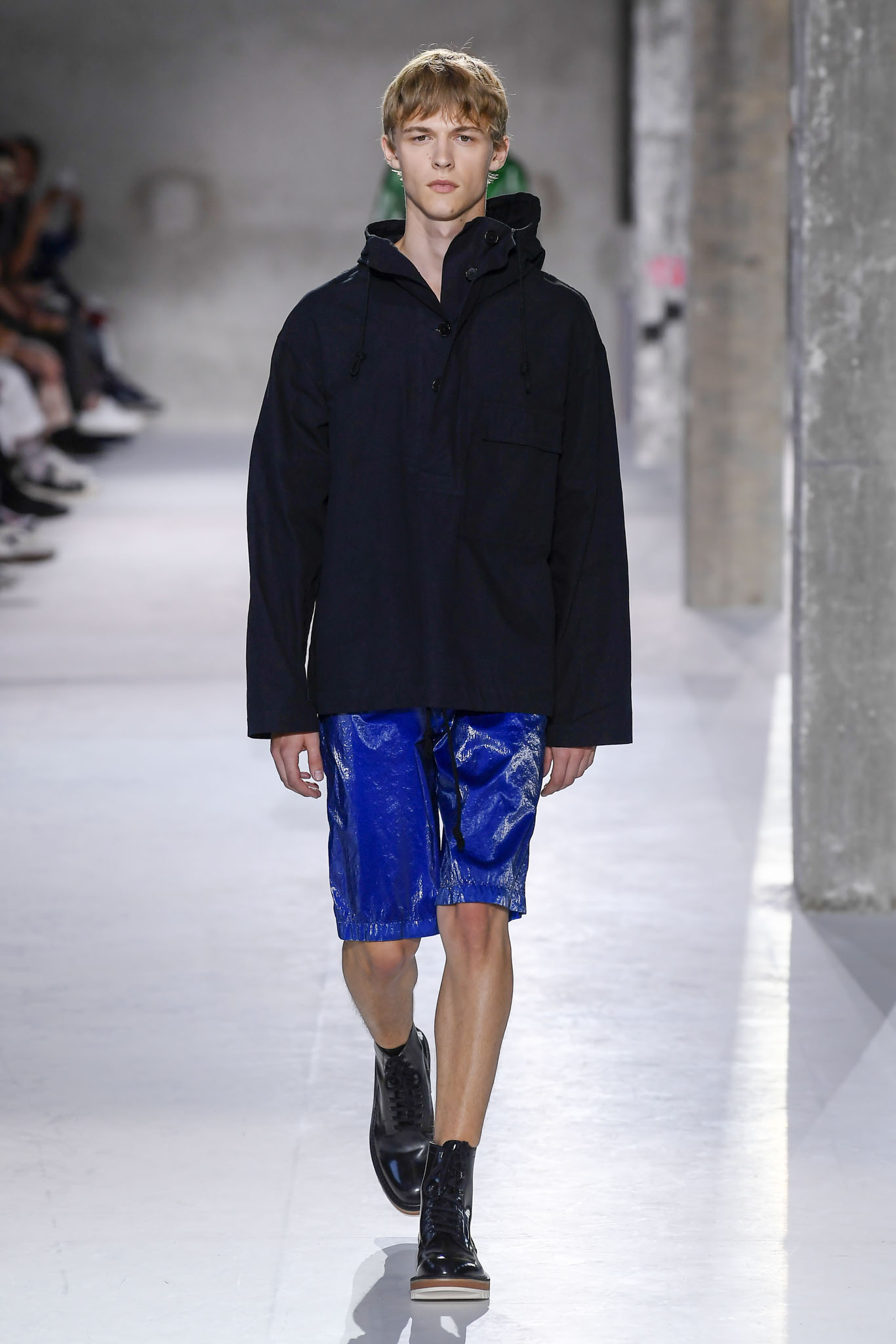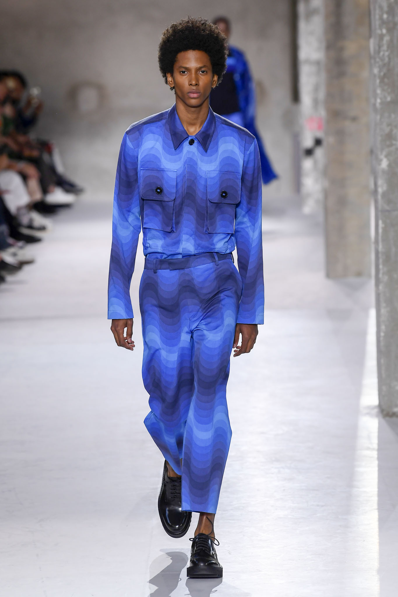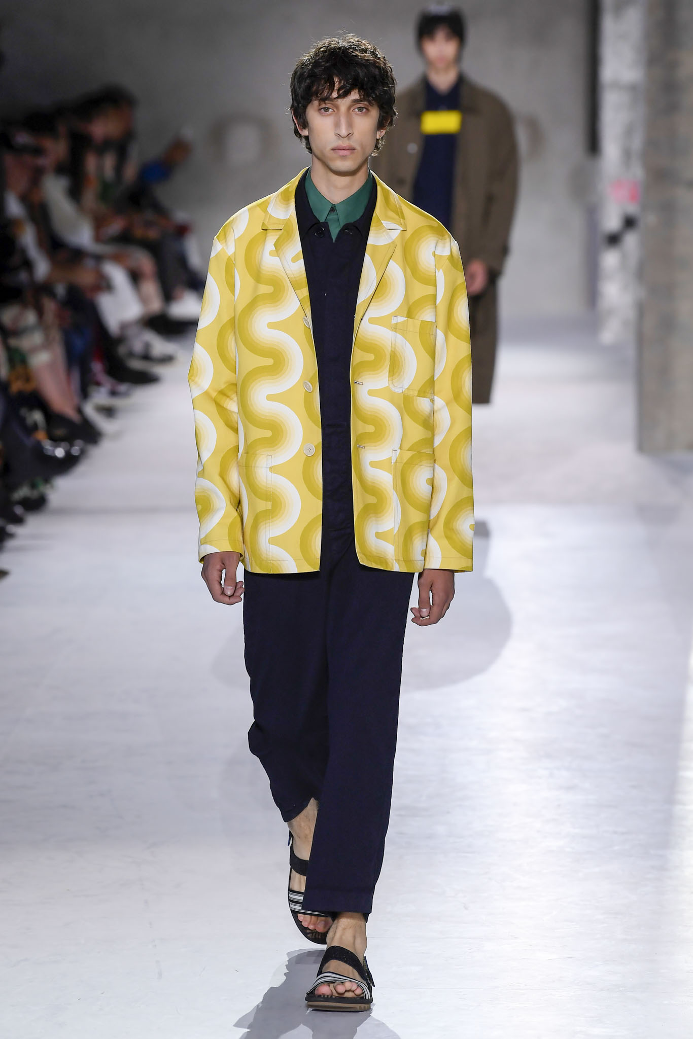 On retrouve des imprimés psychédéliques sur les t-shirts, les shorts ou encore les blazers, accompagnés de sandales et de slip-on. Le défilé apparaît comme un kaléidoscope de pièces colorés allant des teintes orange vermillon au bleu marine, le tout adouci par un marron chocolat. On y découvre aussi quelques looks monochromes qui viennent rythmer la danse des couleurs sur une bande son au style skiffle. Une fois de plus le créateur belge a su asseoir sa réputation avec un défilé parfaitement maîtrisé dans sa simplicité.