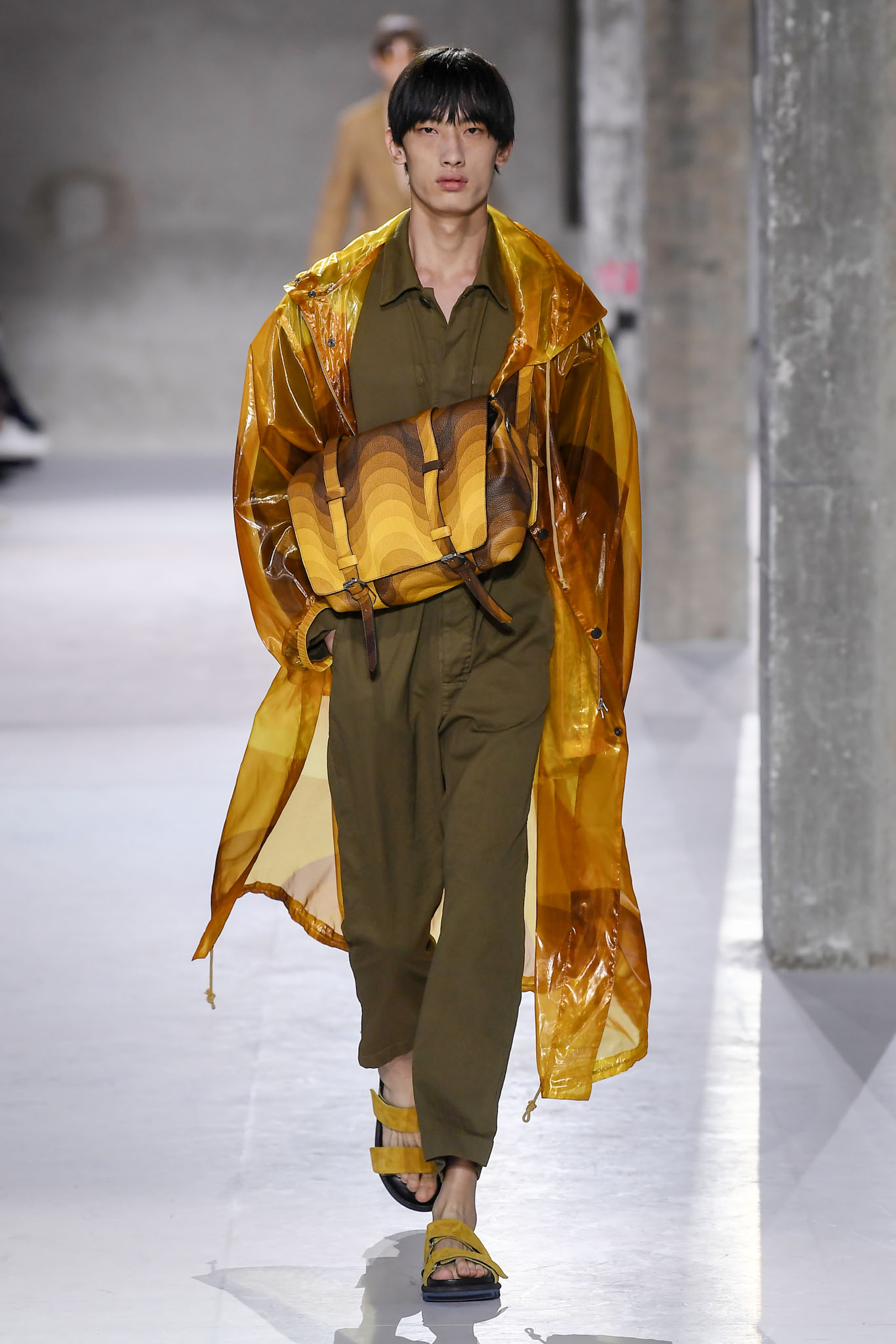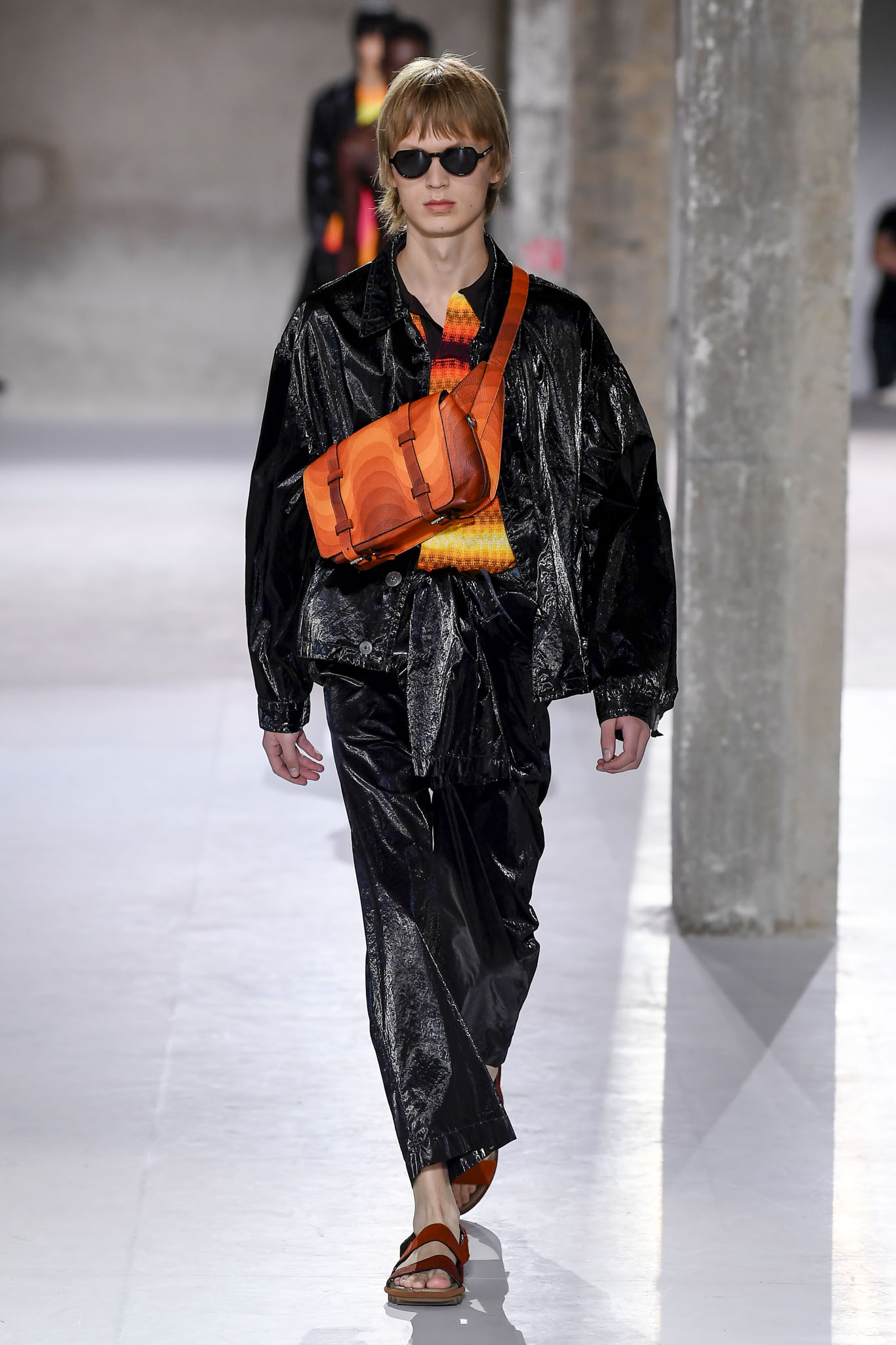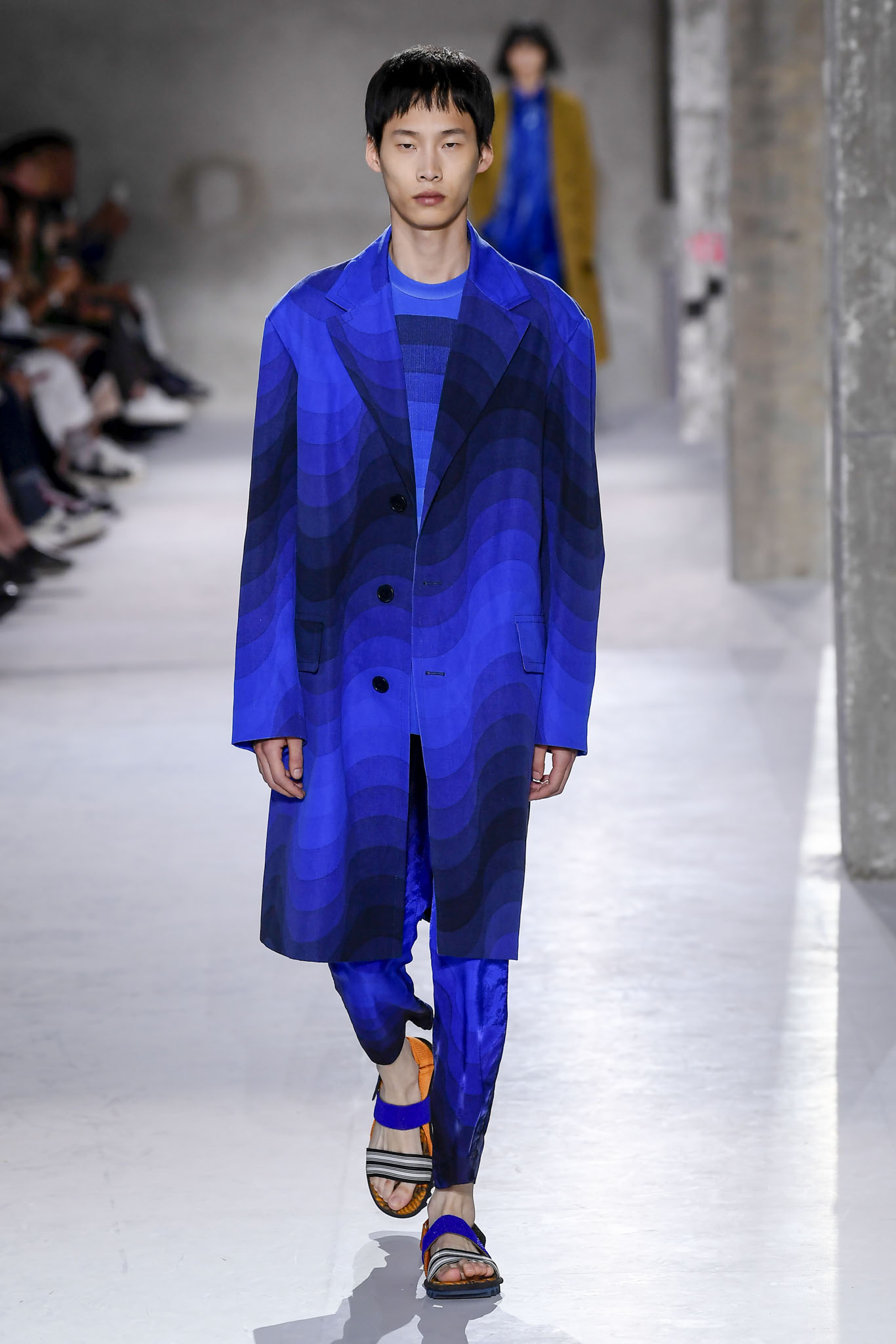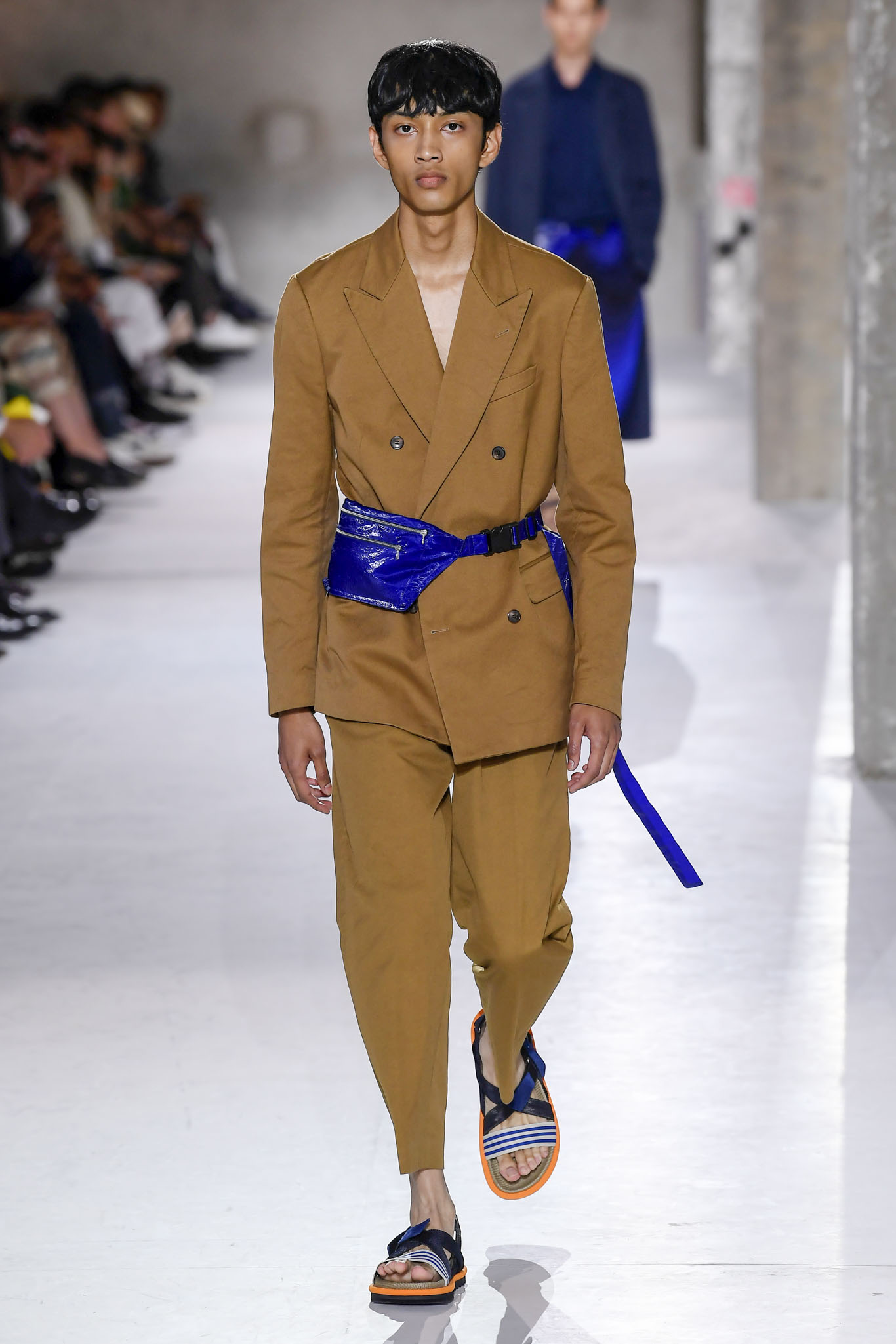 On retrouve des imprimés psychédéliques sur les t-shirts, les shorts ou encore les blazers, accompagnés de sandales et de slip-on. Le défilé apparaît comme un kaléidoscope de pièces colorés allant des teintes orange vermillon au bleu marine, le tout adouci par un marron chocolat. On y découvre aussi quelques looks monochromes qui viennent rythmer la danse des couleurs sur une bande son au style skiffle. Une fois de plus le créateur belge a su asseoir sa réputation avec un défilé parfaitement maîtrisé dans sa simplicité.