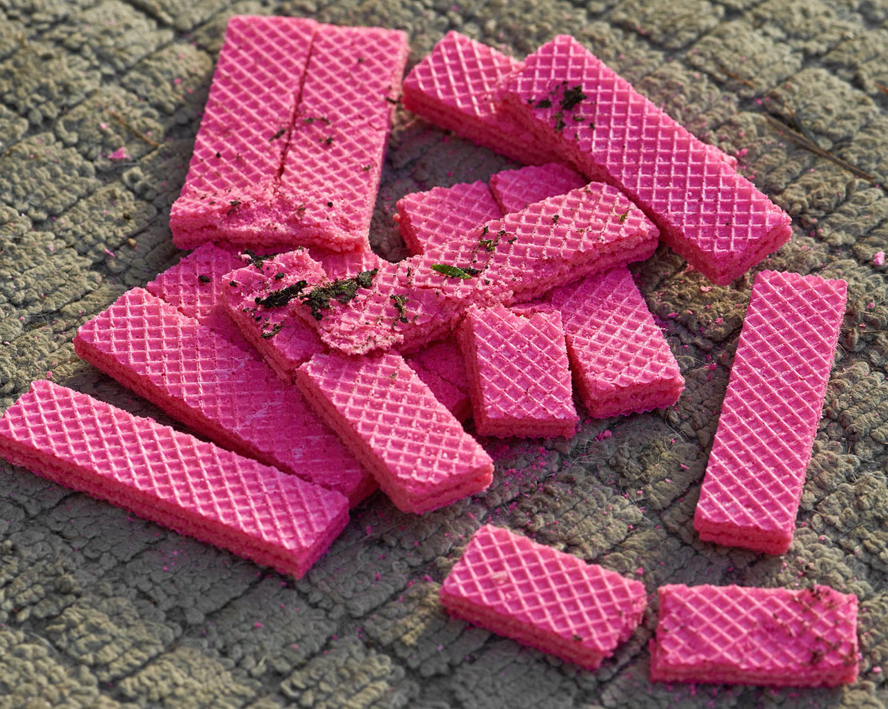 À travers ces juxtapositions subtiles, Corey Olsen aborde les thèmes du consumérisme, du travail manuel et de la déviation sexuelle. Il cite ‘la photographie, la Nouvelle-Angleterre et les banlieues étranges‘ comme ses influences, comme en témoignent ses natures mortes, ses paysages et ses éditoriaux de mode. Un filet de sang qui coule sur un trottoir ordinaire en béton, un livre de nouvelles enveloppé de cuir, un tas de biscuits Pink Panther jetés sur le sol au milieu de la poussière et de la saleté, … Corey Olsen manipule les attentes du spectateur et les préjugés sur la vie de banlieue.