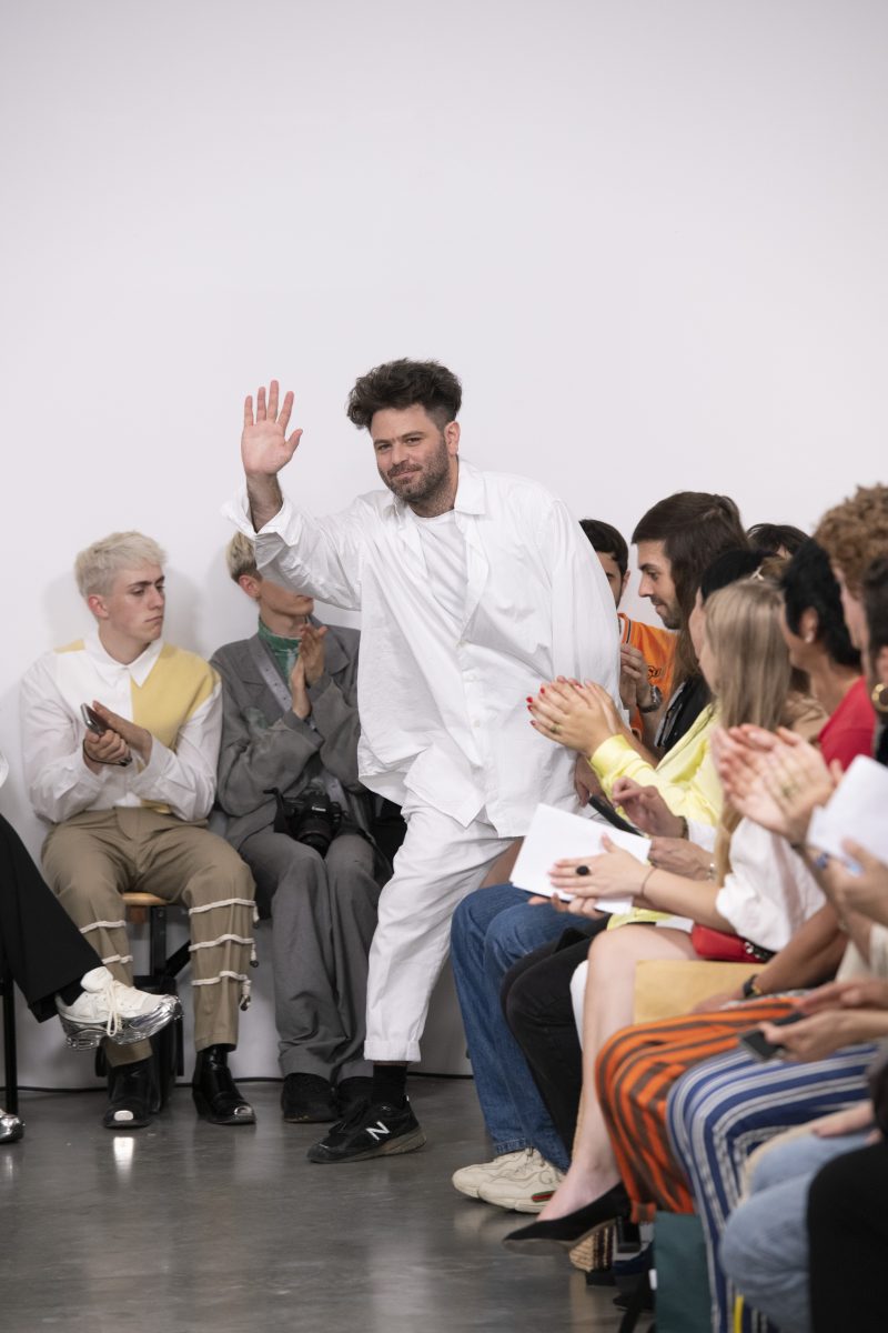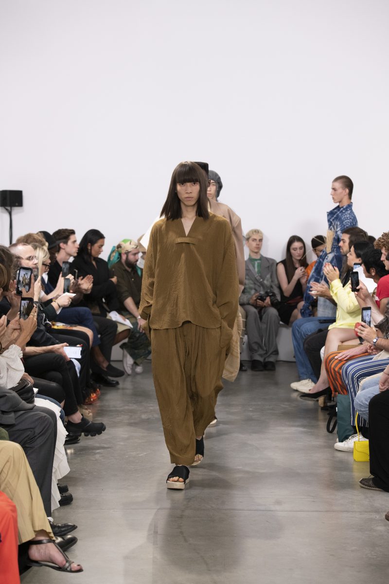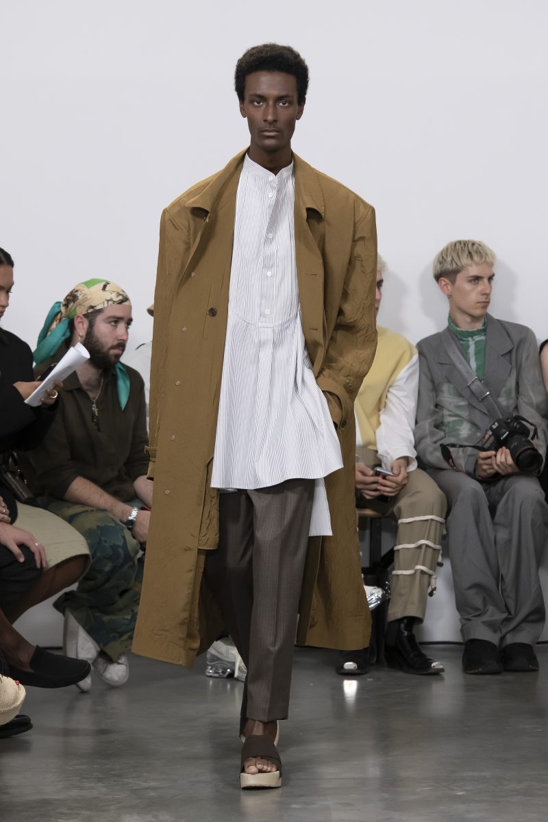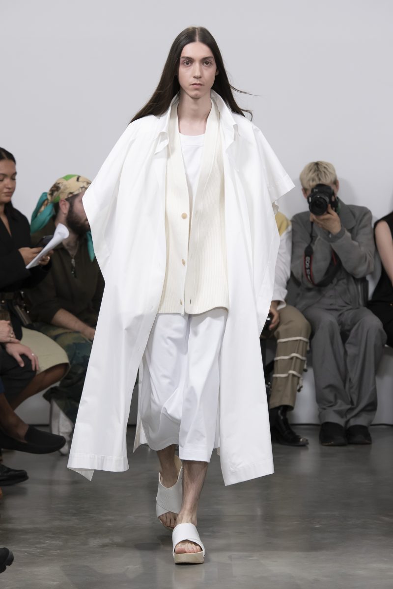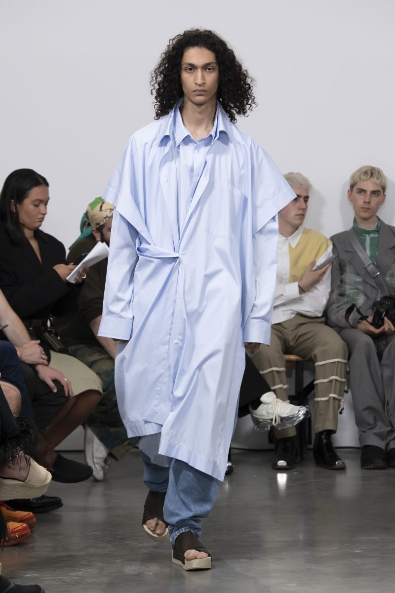 Les vestes et les chemises se transforment pour flotter librement autour des corps. Des pantalons superposés et des sarouals fluides sont associés à des vestes longues. Avec ses proportions non conventionnelles, Hed Mayner propose une nouvelle identité, entre philosophie non conformiste et dualité des genres. Un moment de grâce et de poésie.