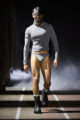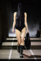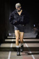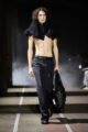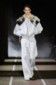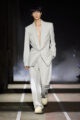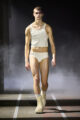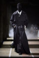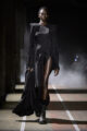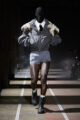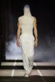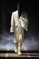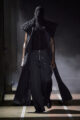 Les coiffes évoquent le facehugger sans tomber dans le costume, brouillant identité et désir. Les zones érotiques se déplacent, la peau devient graphique et stratégique. Tailoring affûté, manteaux aux épaules puissantes, matières hybrides mêlant flanelle, latex et jersey de soie composent une palette faussement neutre, organique et troublante.