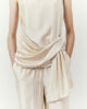 Les textures évoquent les reliefs de Gunther Uecker, tandis que neutres effacés par le soleil, soie et lin diffusent la lumière. Les accessoires, sandales en veau et sacs polyvalents, complètent une garde-robe à la fois raffinée et affirmée.
