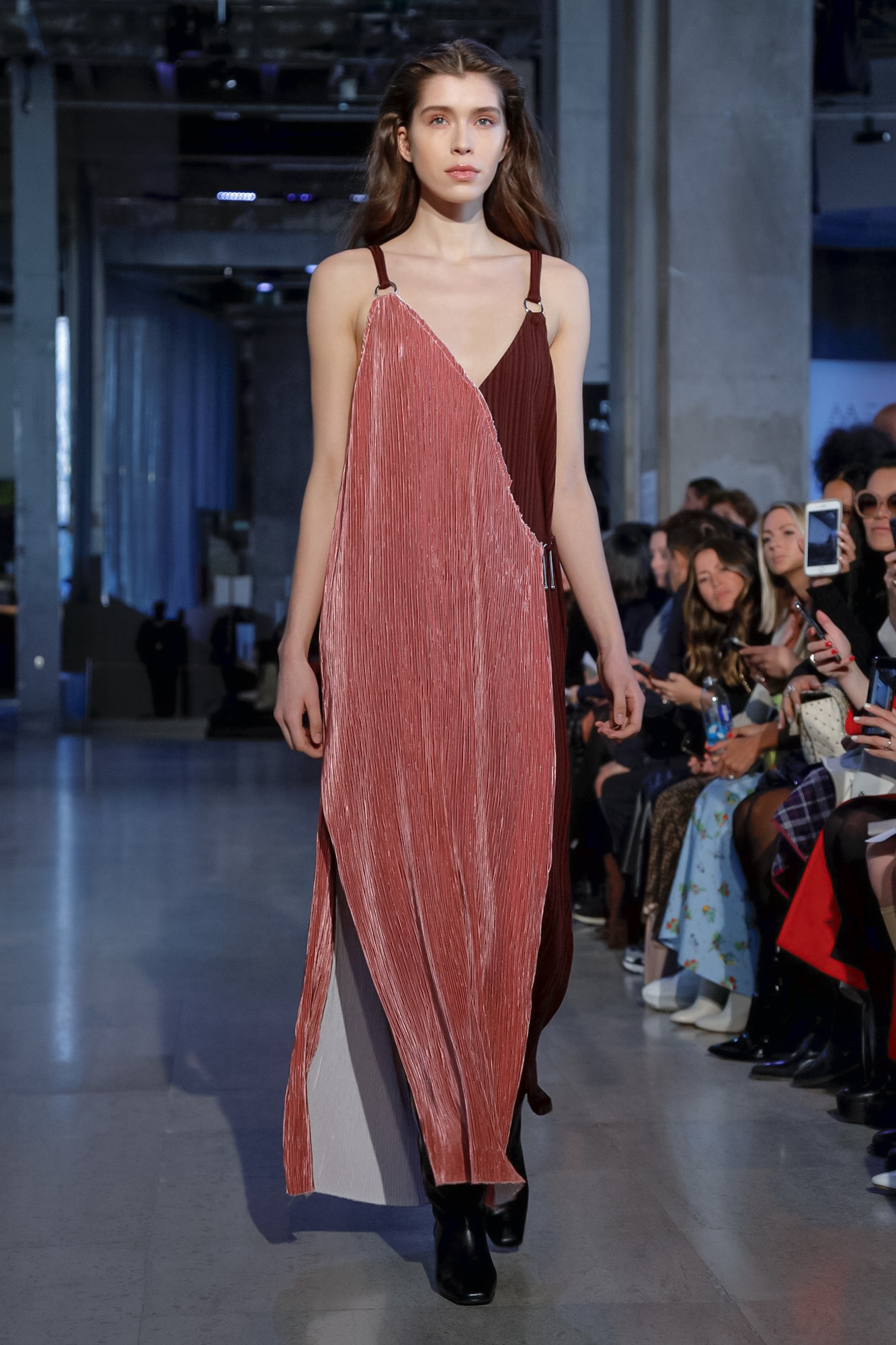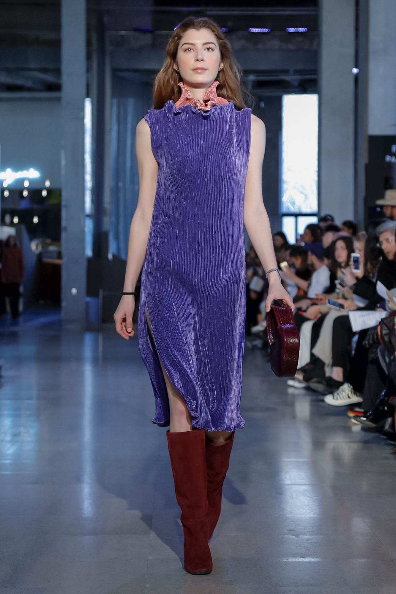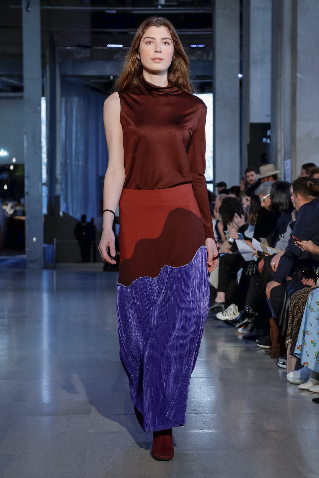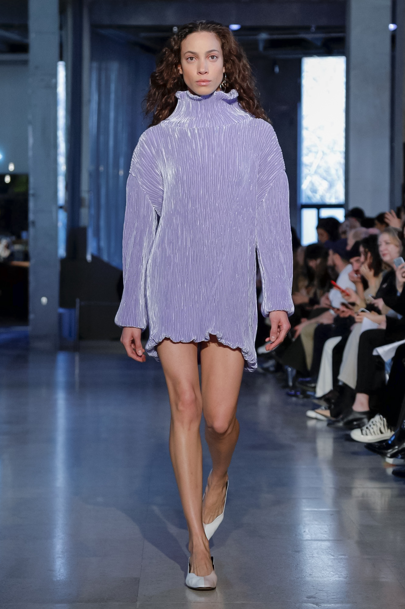 On retrouve l’idée de mouvement et notamment de la danse avec des motifs en forme de vague et des découpes ondulées sur les vêtements. Mais aussi du plissé délicat décliné sur des camaïeux de mauve, en référence aux divines robes de Mariano Fortuny adulées par Isadora Duncan au début des années 1900. Les imprimés botaniques mélangés aux écritures disproportionnées, les soies ombrées, enveloppent des silhouettes longilignes.