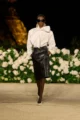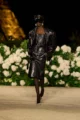 Le show s’ouvre avec des silhouettes noires, serrées, puissantes : tailleurs en cuir, jupes crayons, blousons de motard et chemisiers blancs à lavallière XXL. Le tout porté sur talons aiguille. Vaccarello cite Robert Mapplethorpe, ses portraits crus et ses mises en scène de cuir, comme fil rouge. Ici, pas de fragilité. Les femmes avancent comme des amazones BDSM, aristocrates un peu louches, dominatrices assumées. Saint Laurent, version underground.