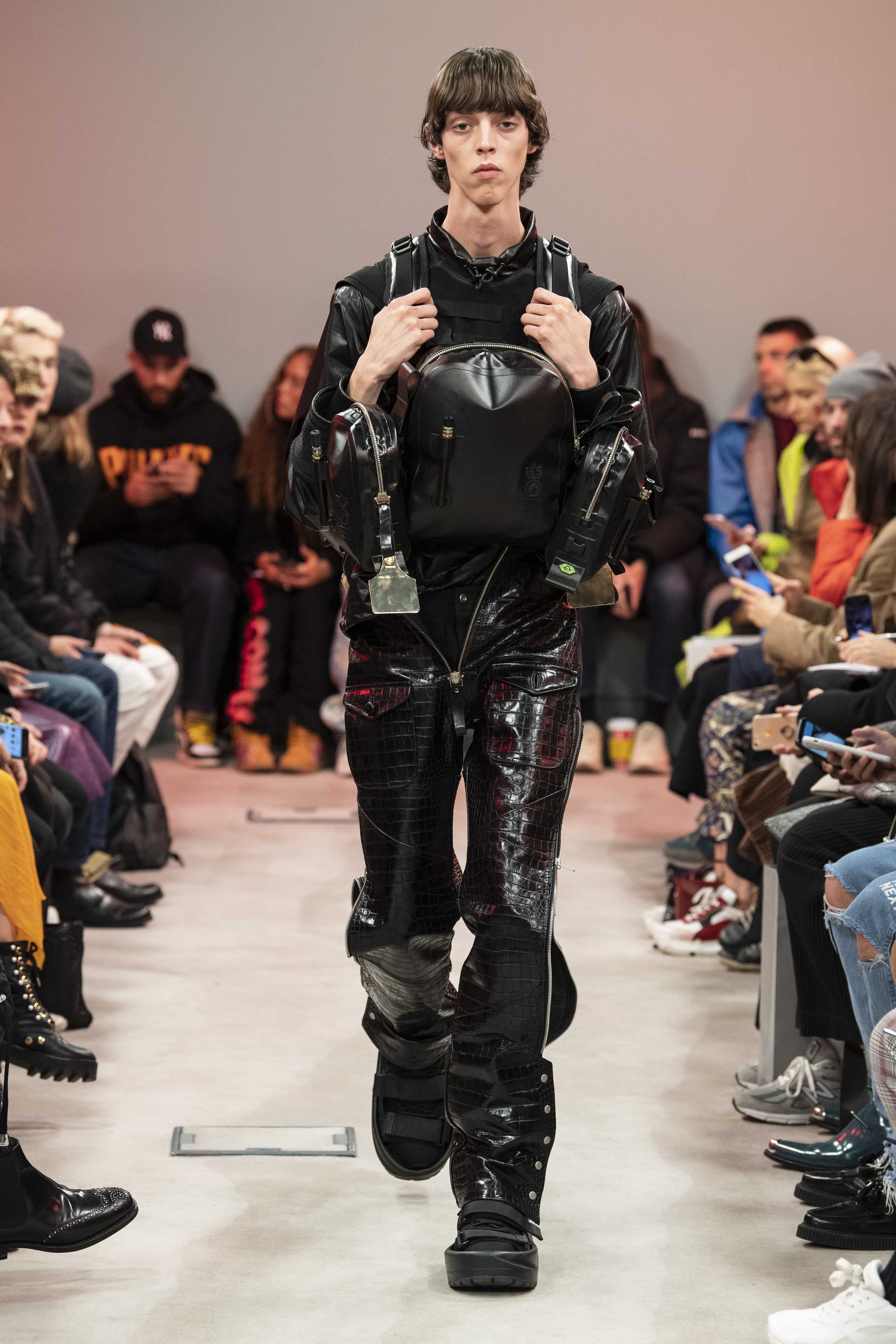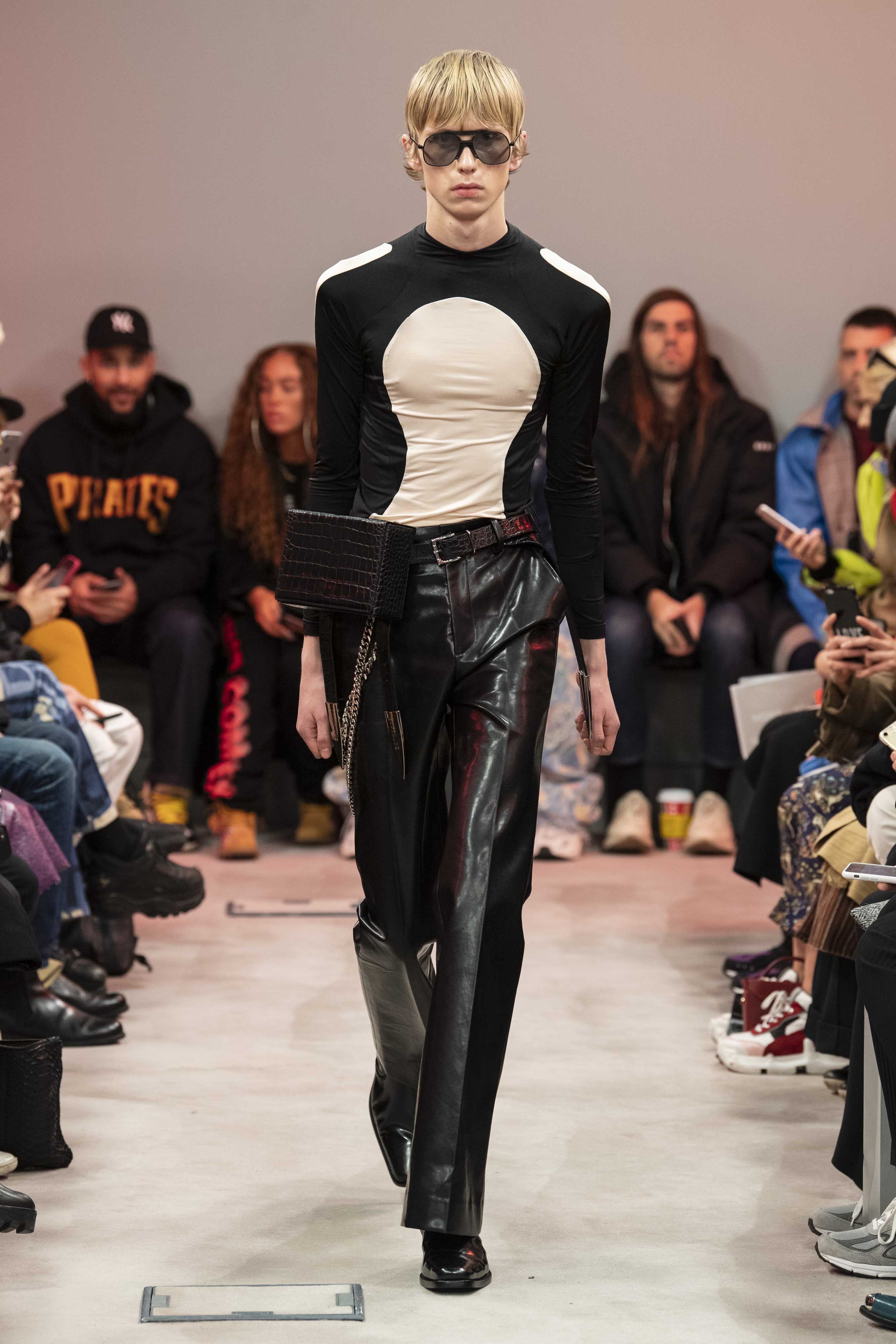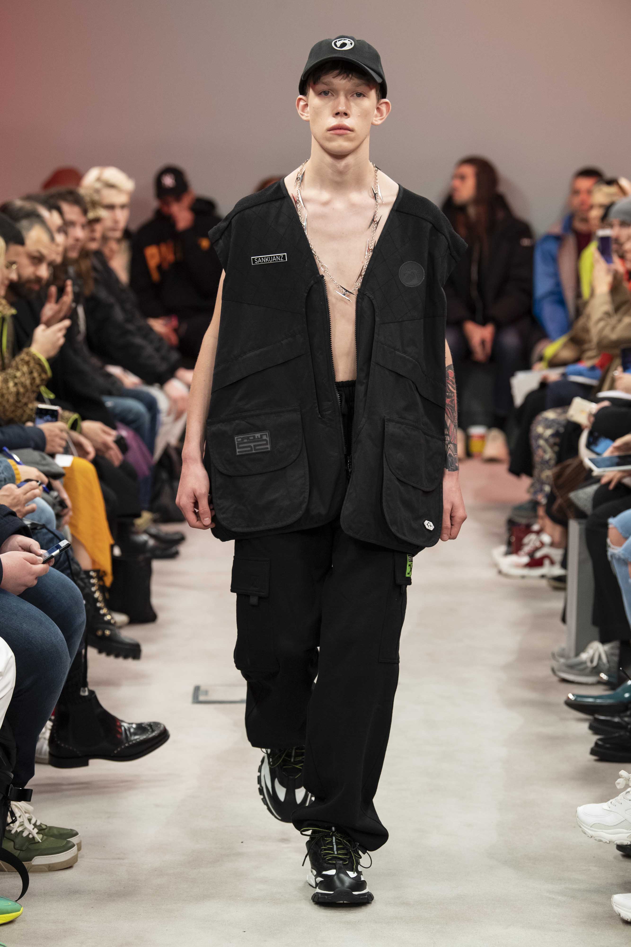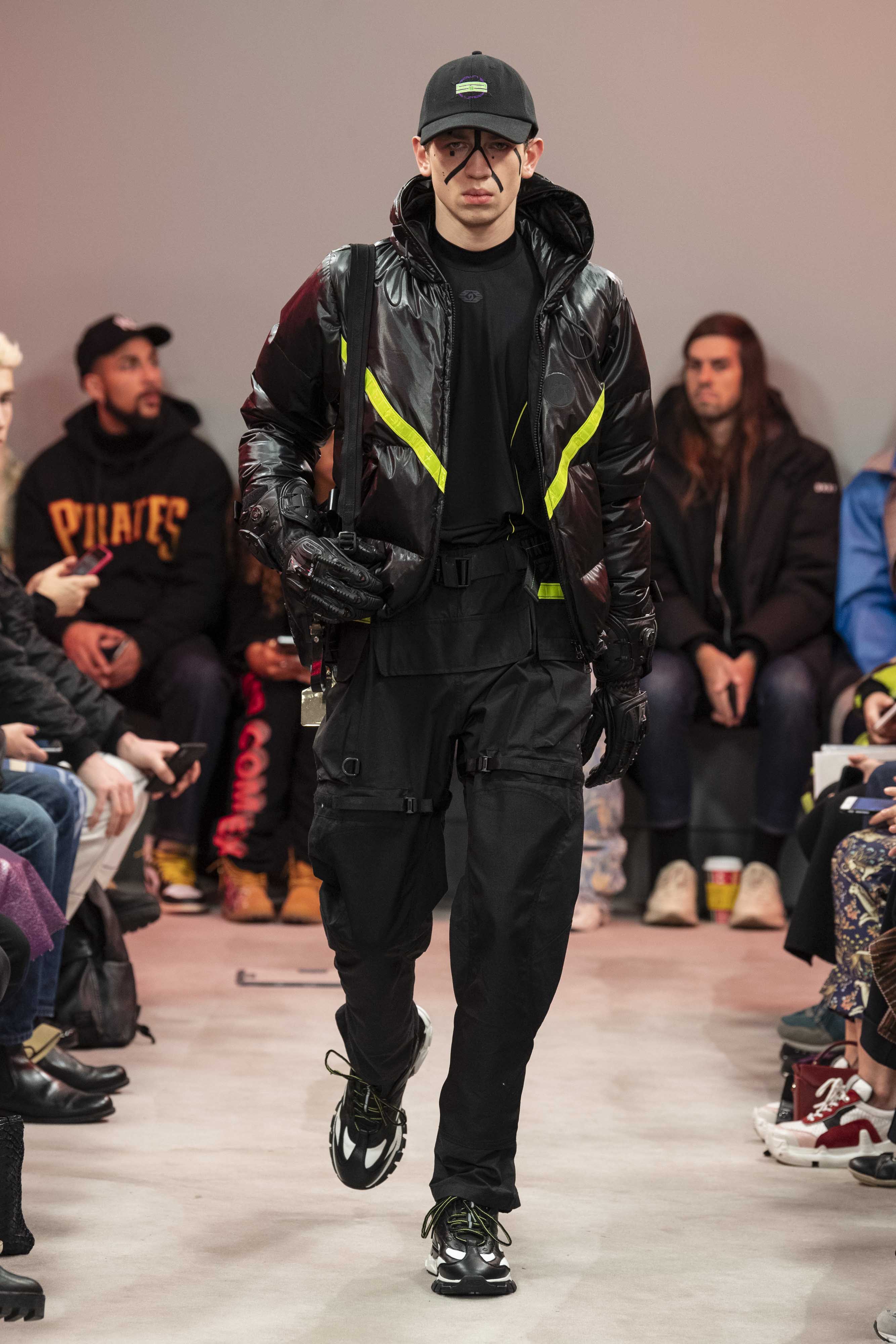 Avec cette collection, le créateur poursuit ses réflexions sur notre monde moderne. Il développe les notions de destruction et de protection, d’attaque et de défense, tout en déconstruisant et reconstruisant. Le cuir noir et le latex sont ici à l’honneur, avec de nombreuses références au monde marin tels que des combinaisons de plongées, des baleines tueuses et des uniformes de navigateurs.