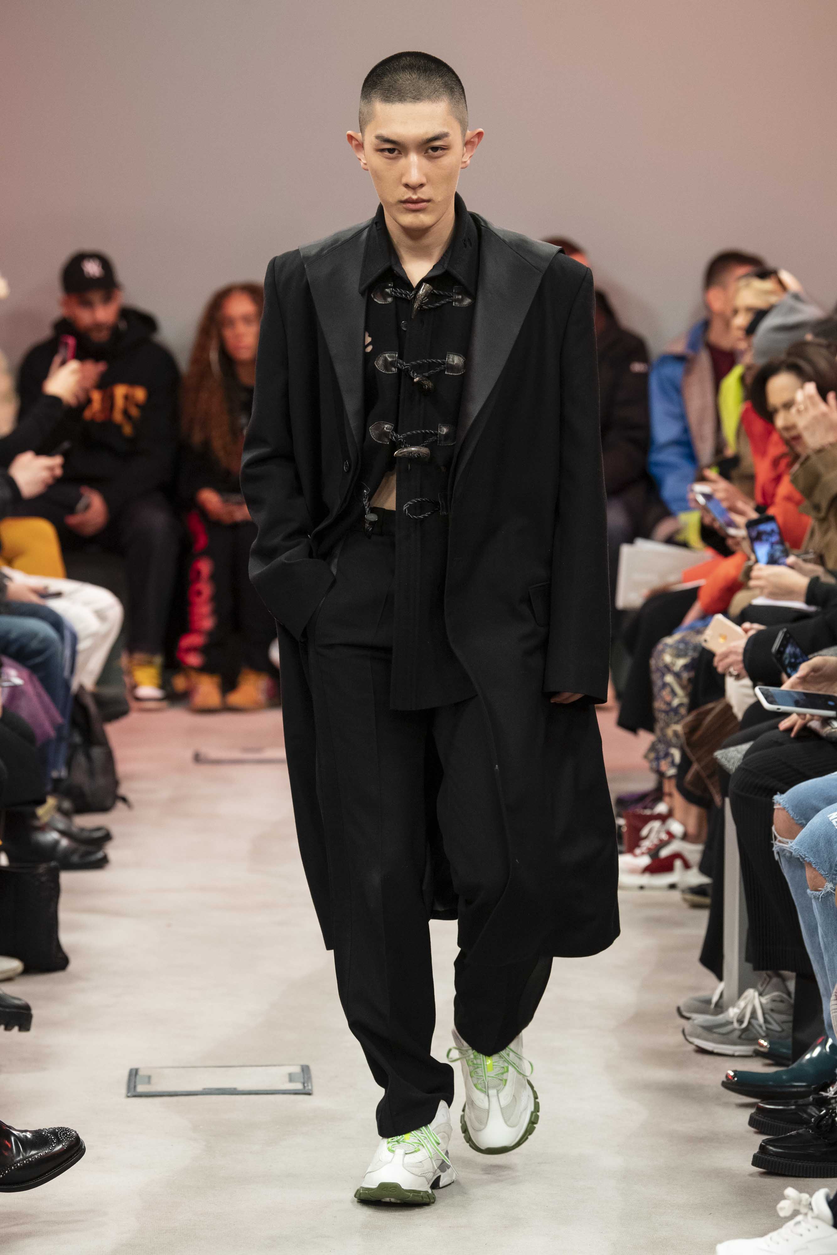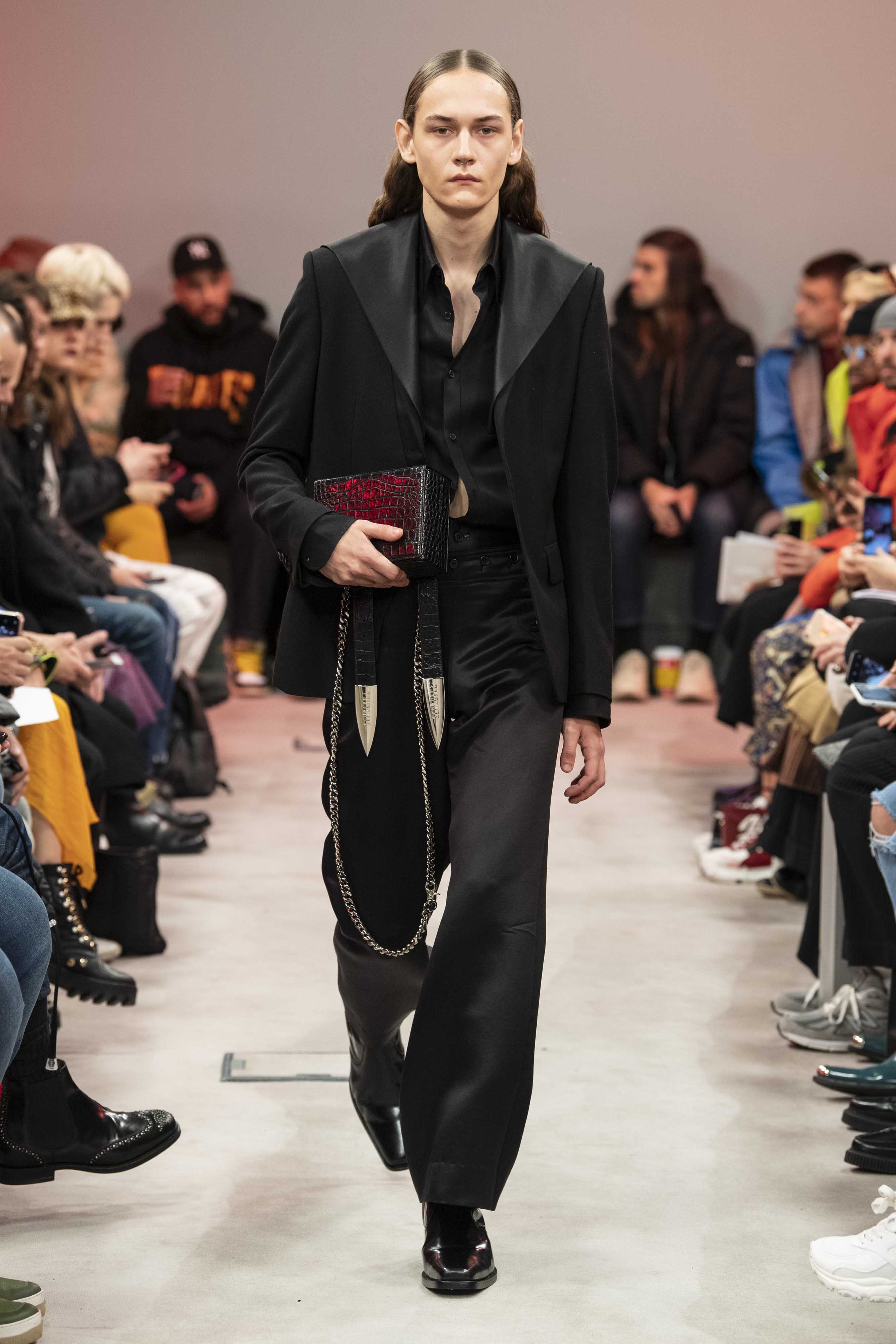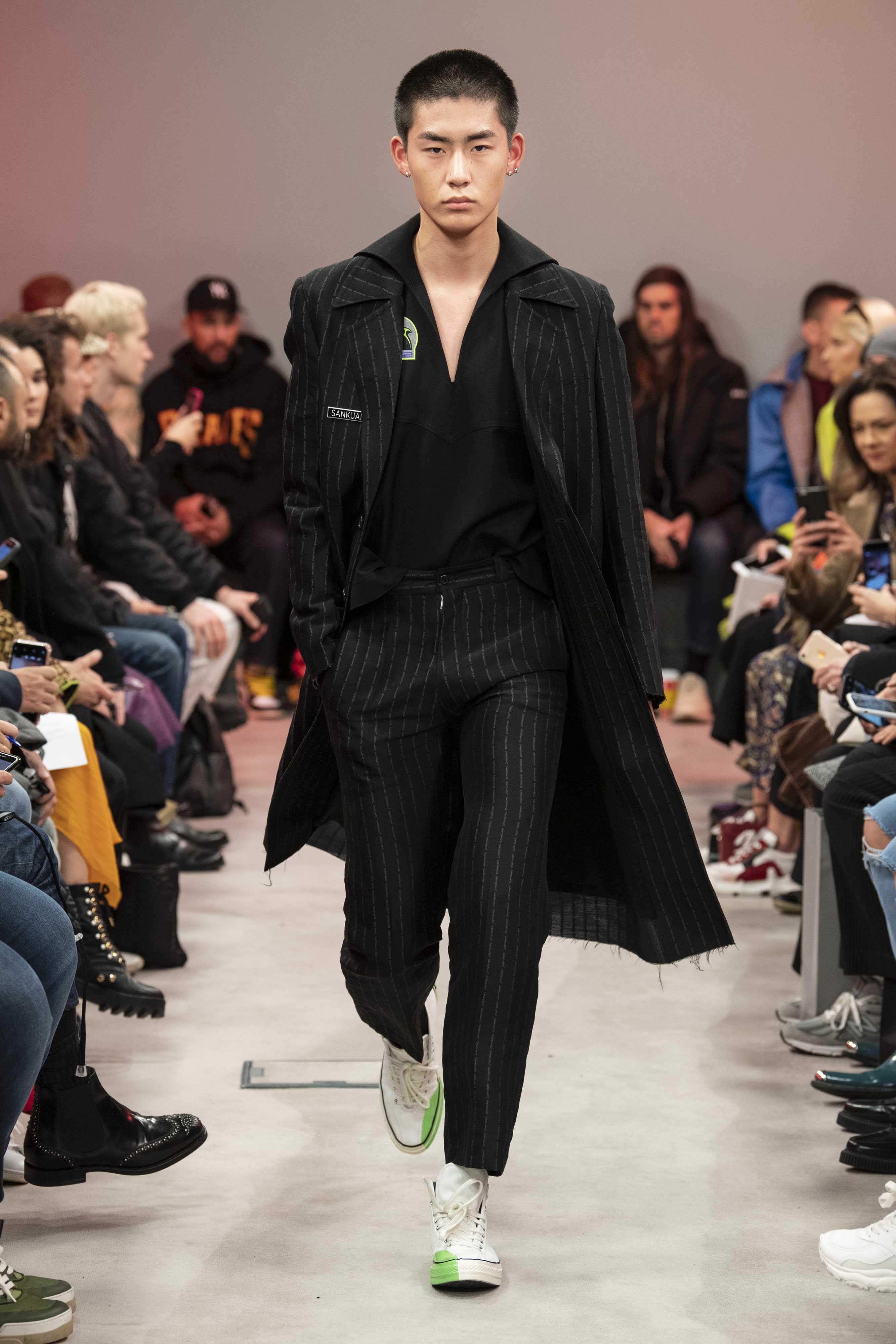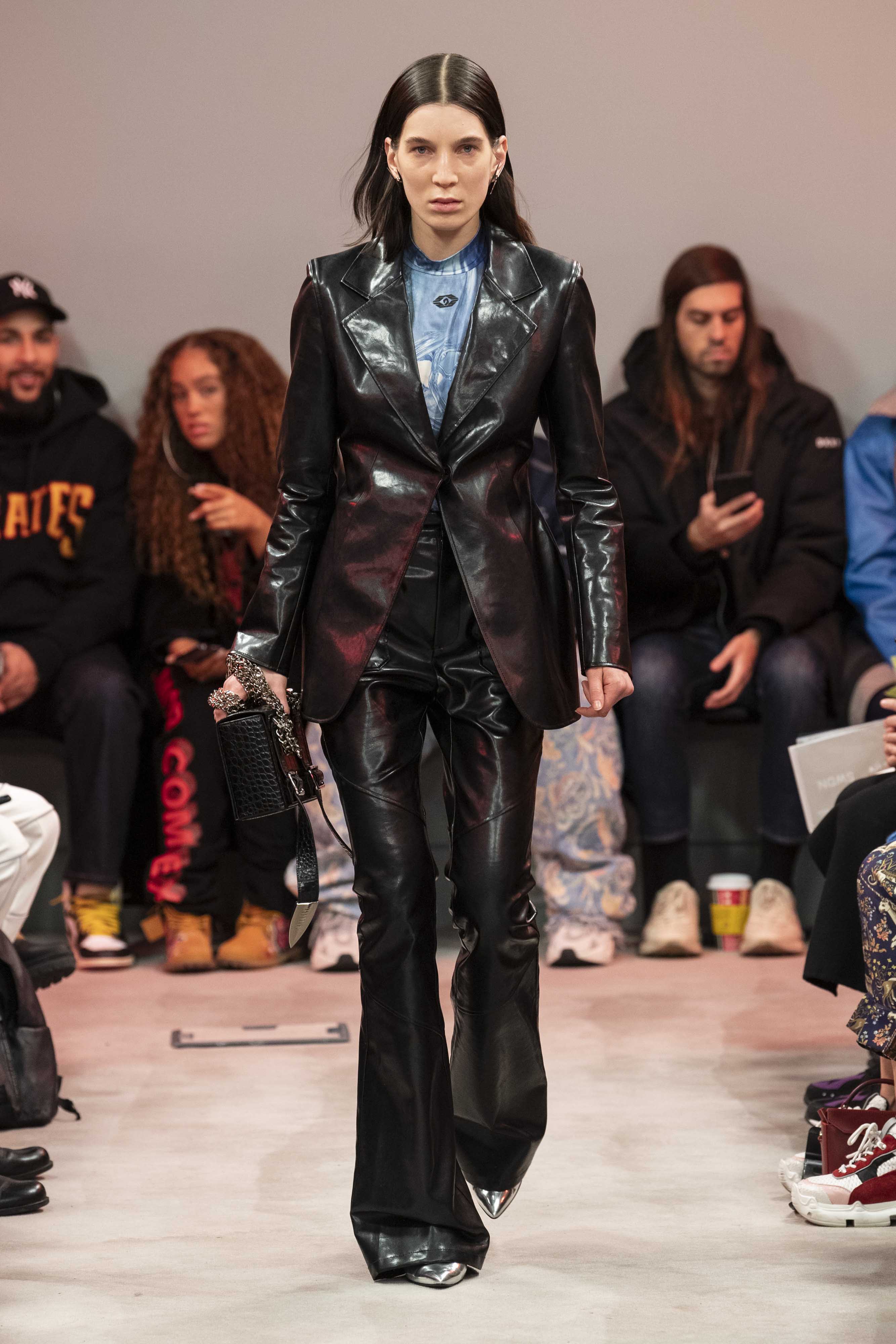 Grande première, Shangguan Zhe introduit quelques looks femme dans sa présentation. Des silhouettes habillées de costumes noir, de bombers et de tenues en cuir zippé qui affirment la même allure féroce que chez l’homme.
