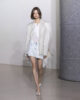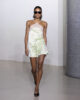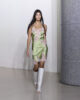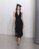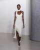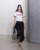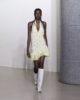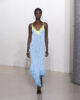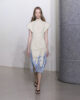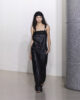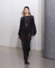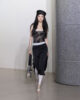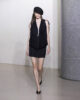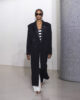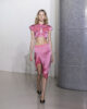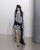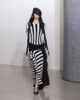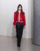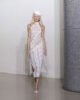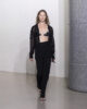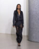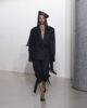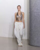 Le tailleur épouse le corps, drapé d’un voile asymétrique, pantalon cargo noué à la cheville. Les imprimés acidulés, la dentelle calais et le jacquard noir et blanc rendent hommage à l’esprit parisien et à l’art du mime. Les accessoires – gavroches, chapeaux inclinés et lunettes Peter & May – complètent ce dialogue entre tradition et modernité.