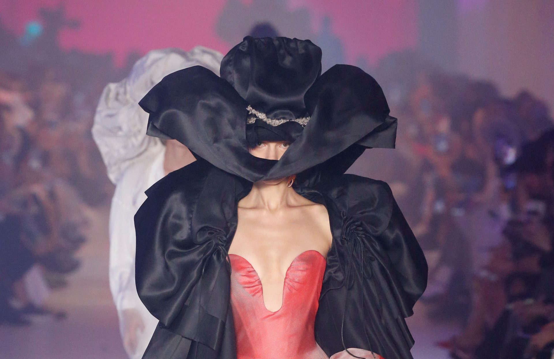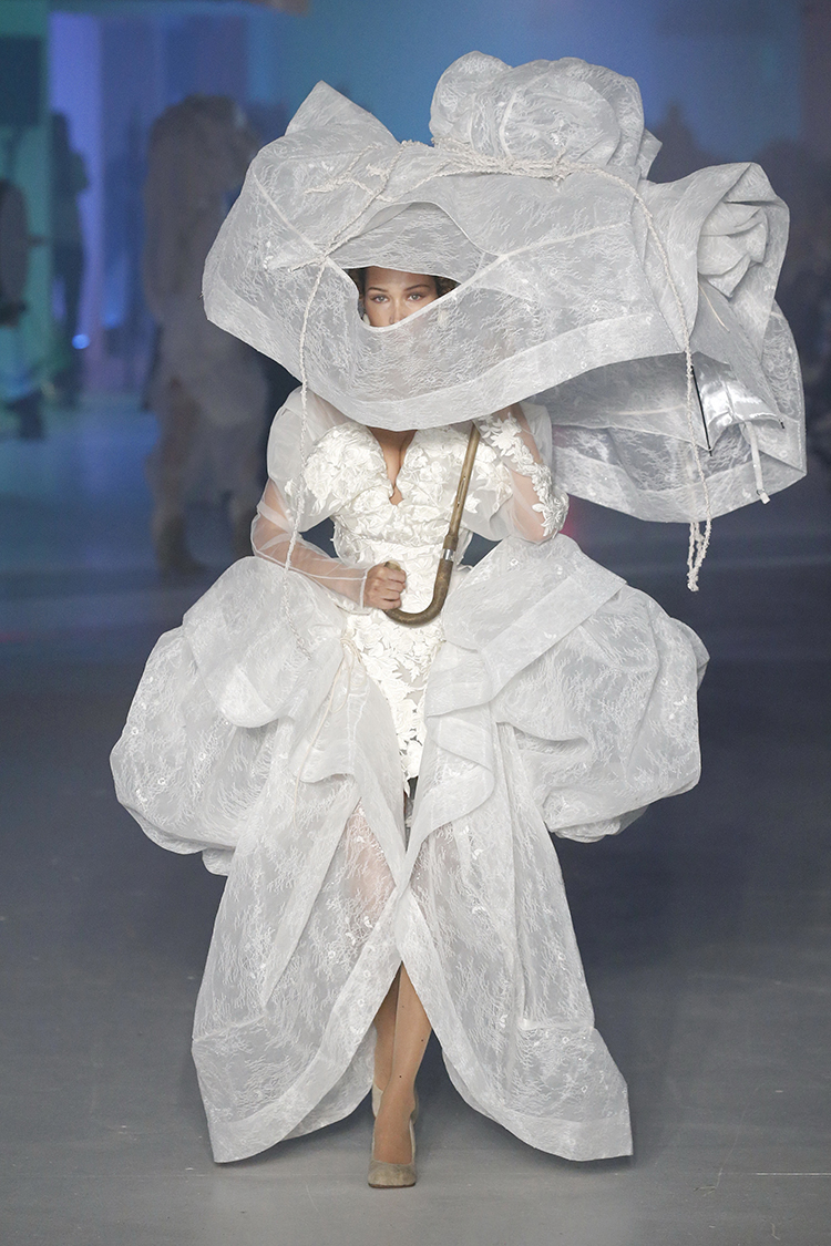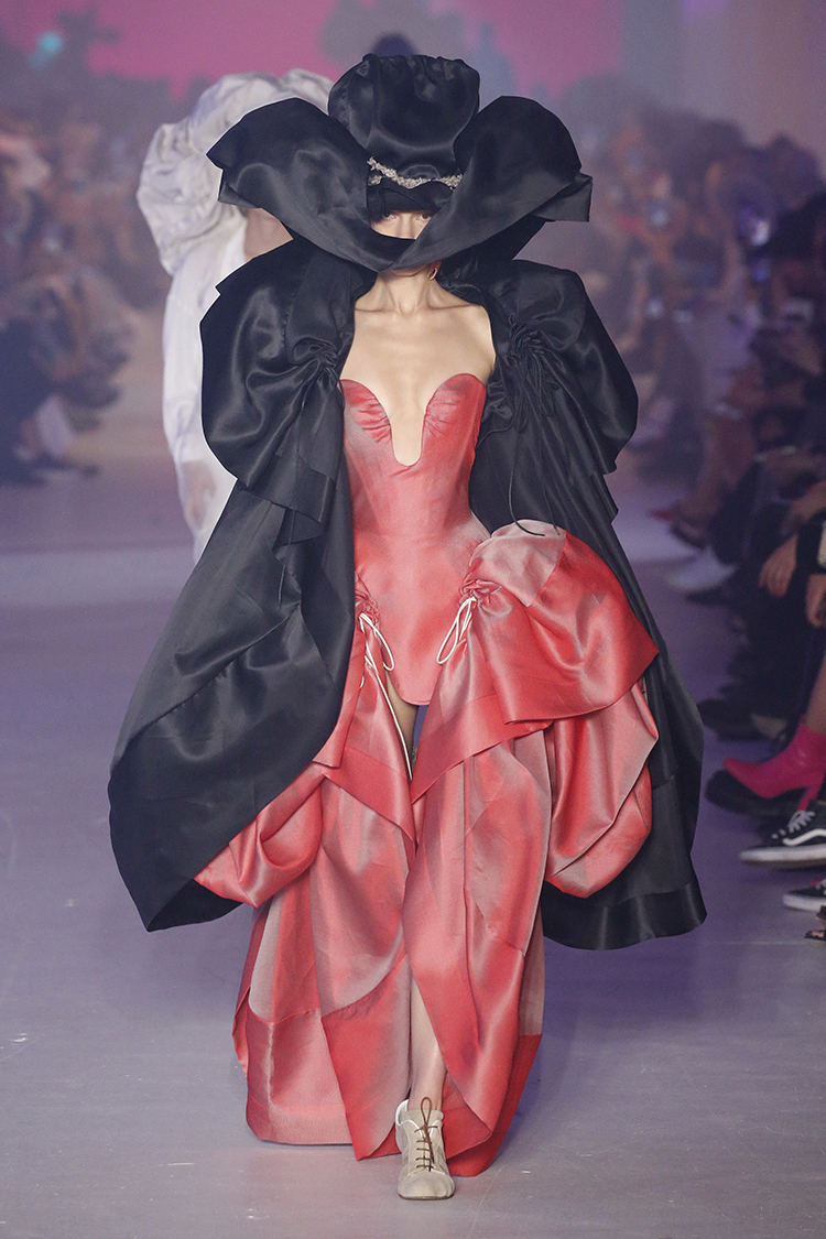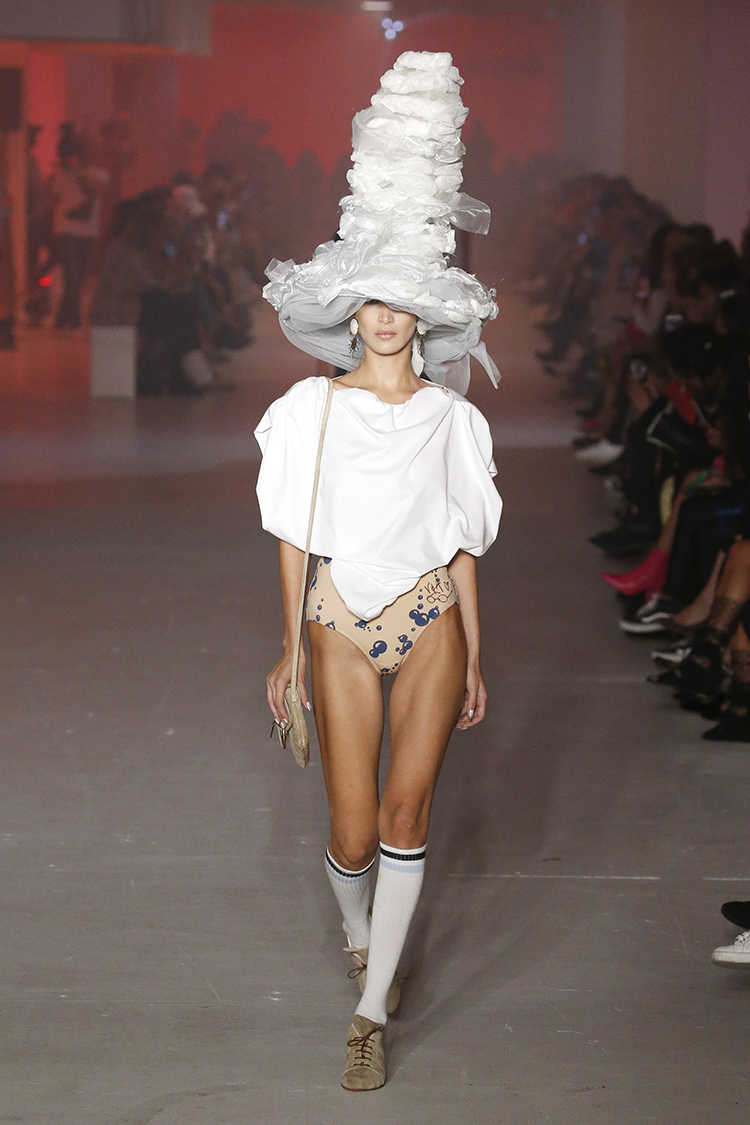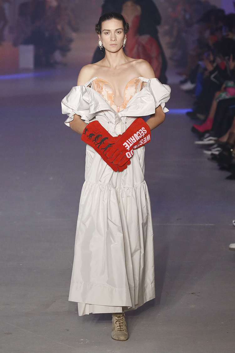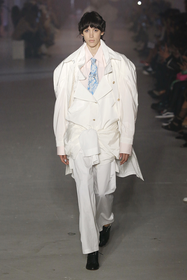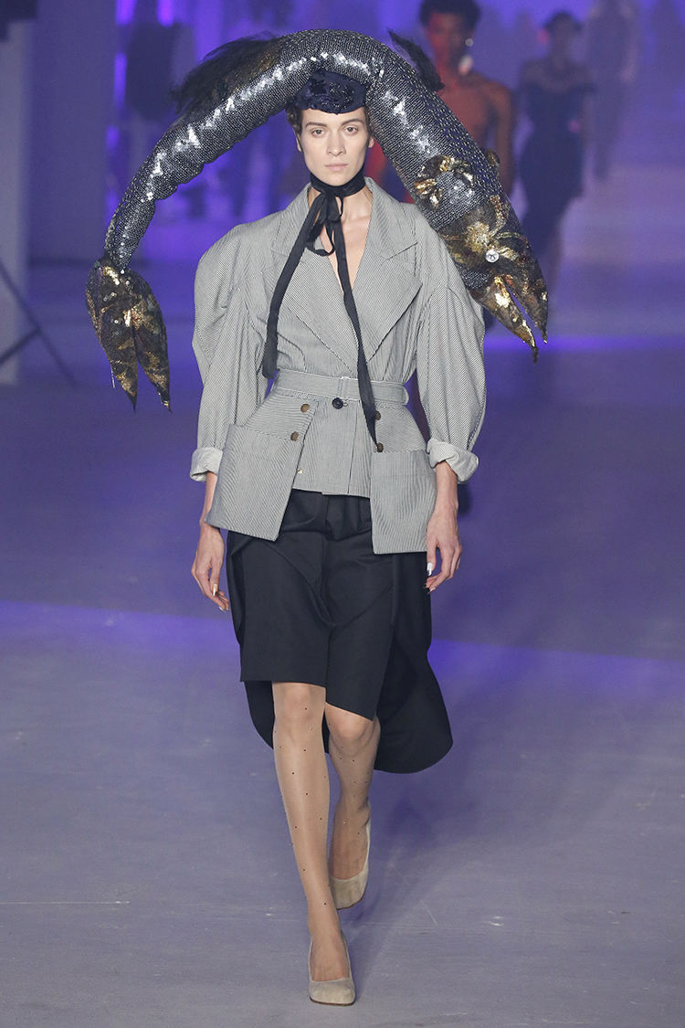 C’est dans un hangar gigantesque de la rue des Poissonniers, à Paris, que Vivienne Westwood a présenté sa collection printemps-été 2020. Un cadre en parfaite adéquation avec le style de la maison. Andreas Kronthaler dévoile ici une collection aussi inspirante qu’inspirée baptisée ‘Rock me Amadeus‘. Il nous invite à la rencontre des pin-ups des années 50 dans un spectacle ambulant où les vêtements se font et se défont, où les formes, aussi fluides que des nuages, affinent des silhouettes souvent fantasques. Les Hommes se mélangent aux animaux et aux machines pour créer un monde à la frontière du réel. Au programme : des chapeaux démesurés, du volume, des drapés, de la superposition …