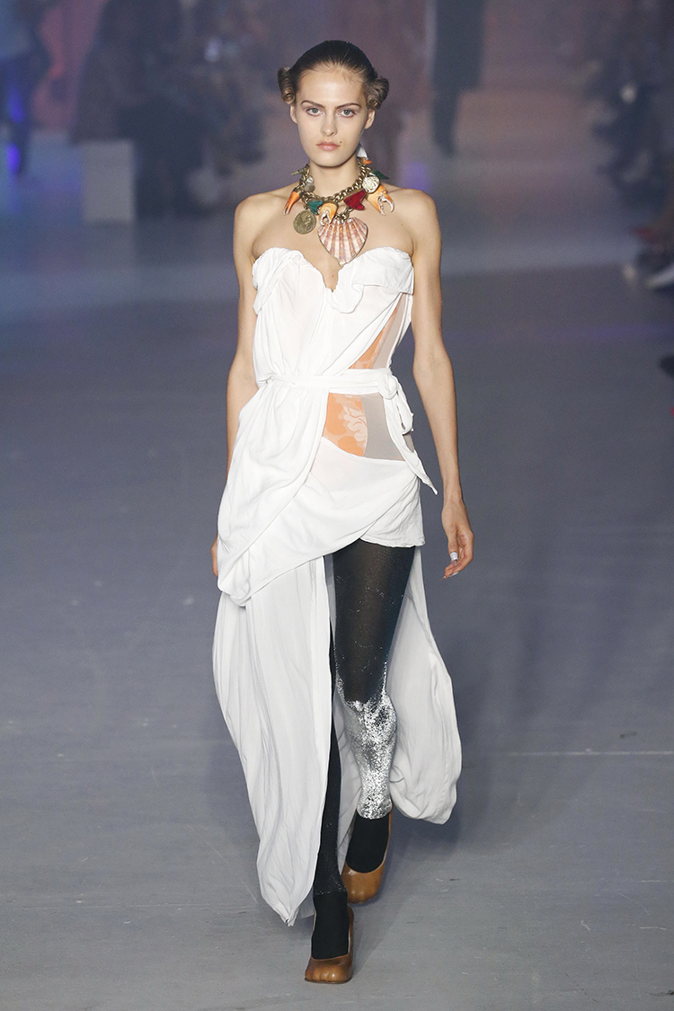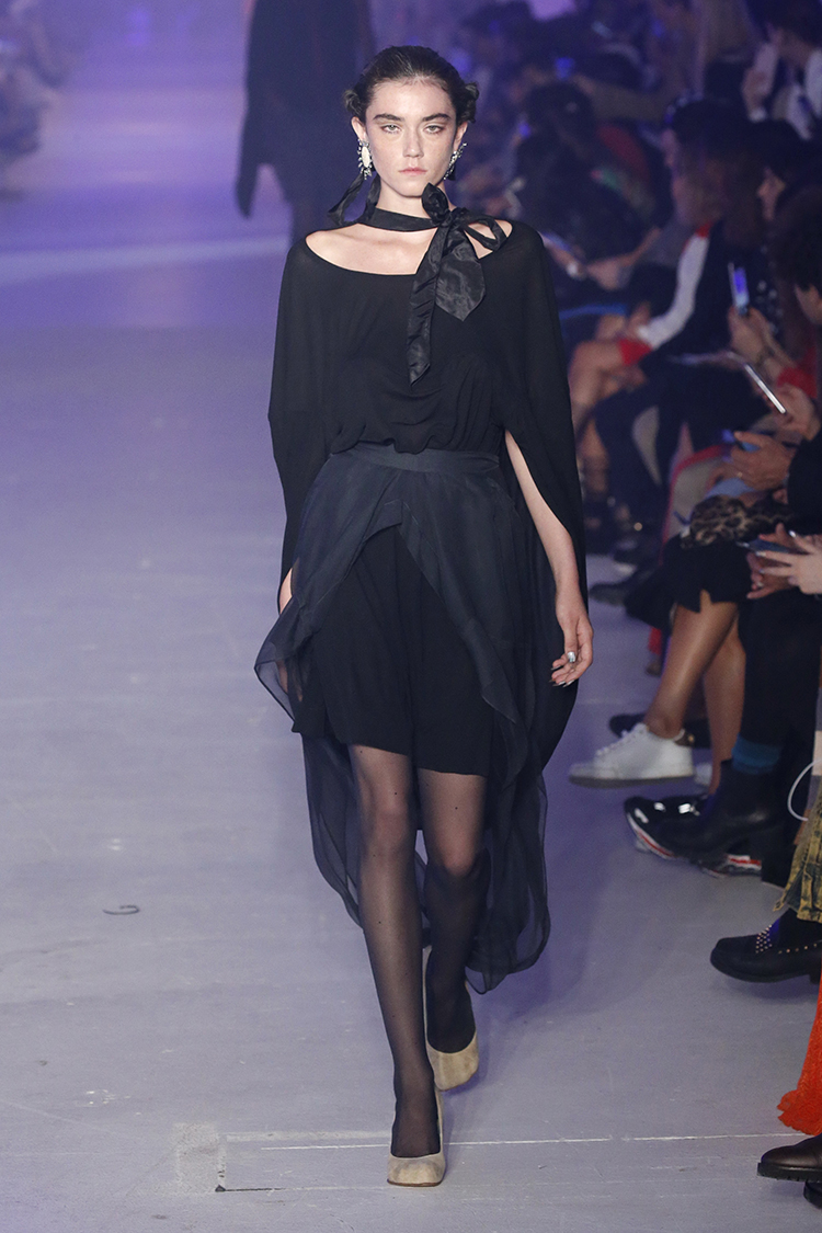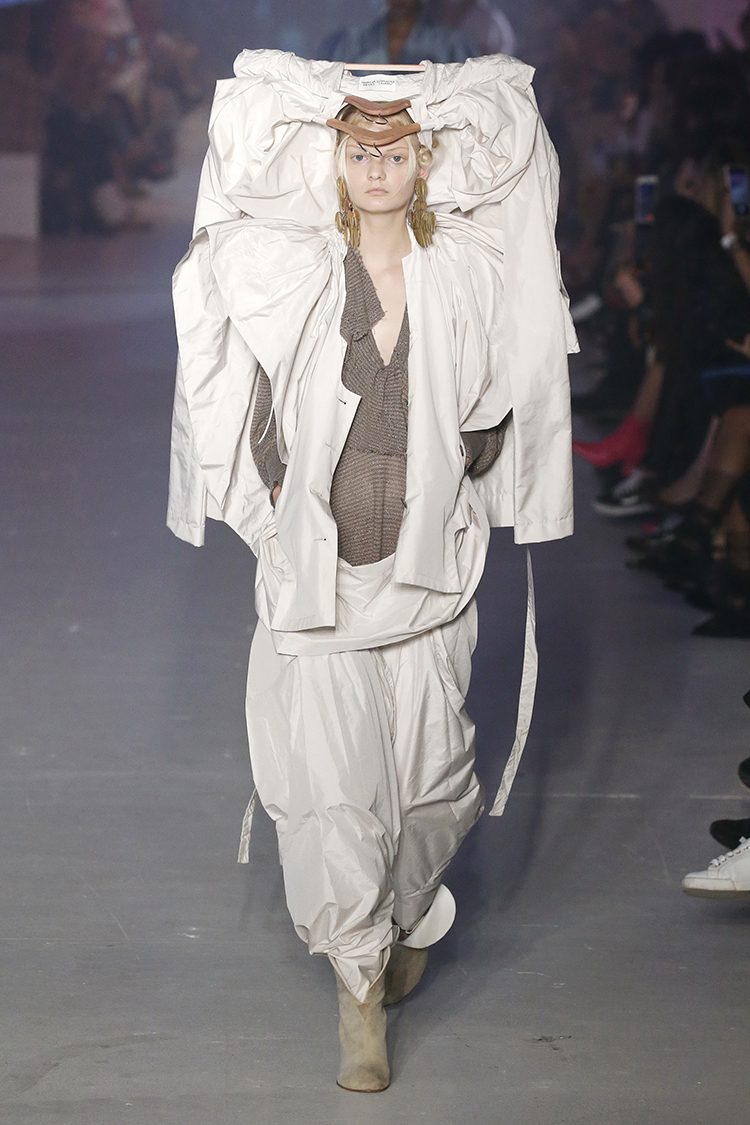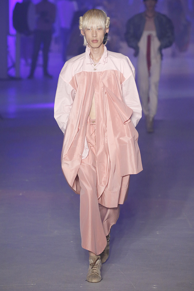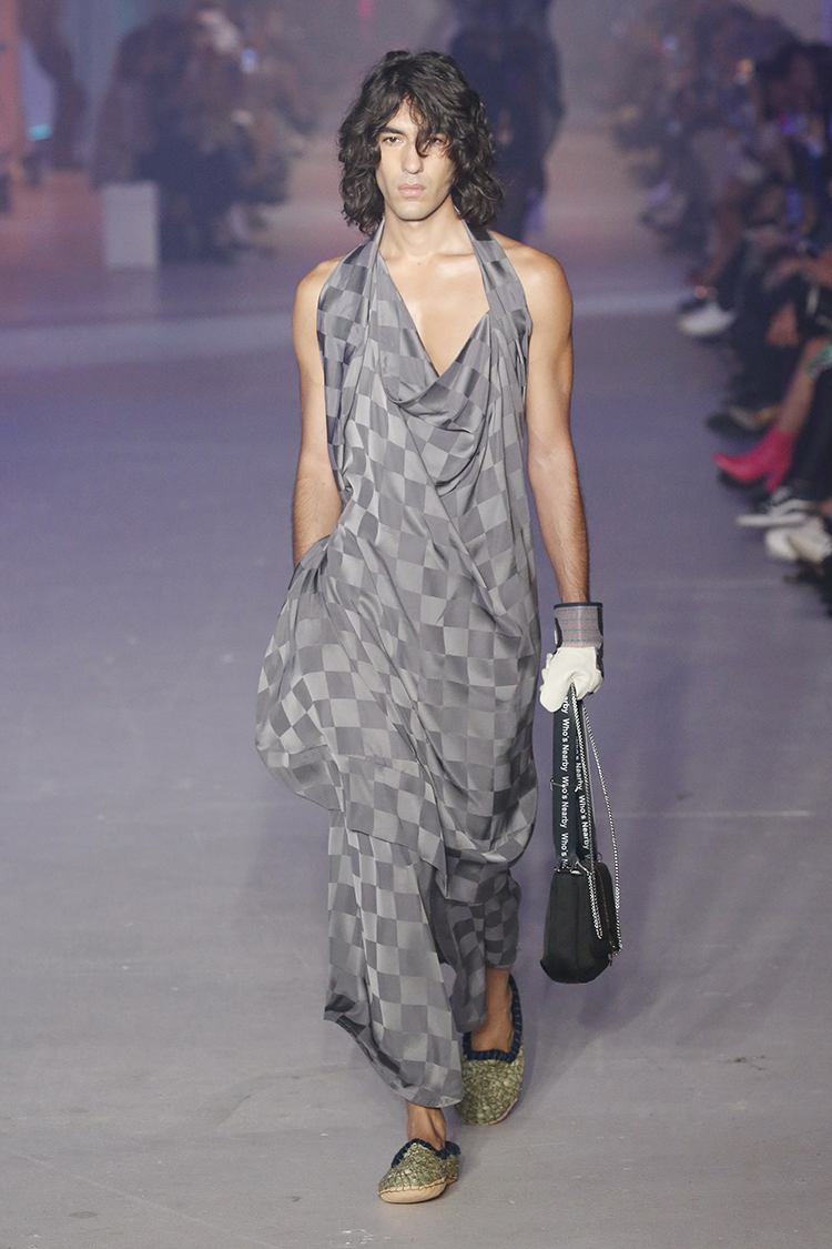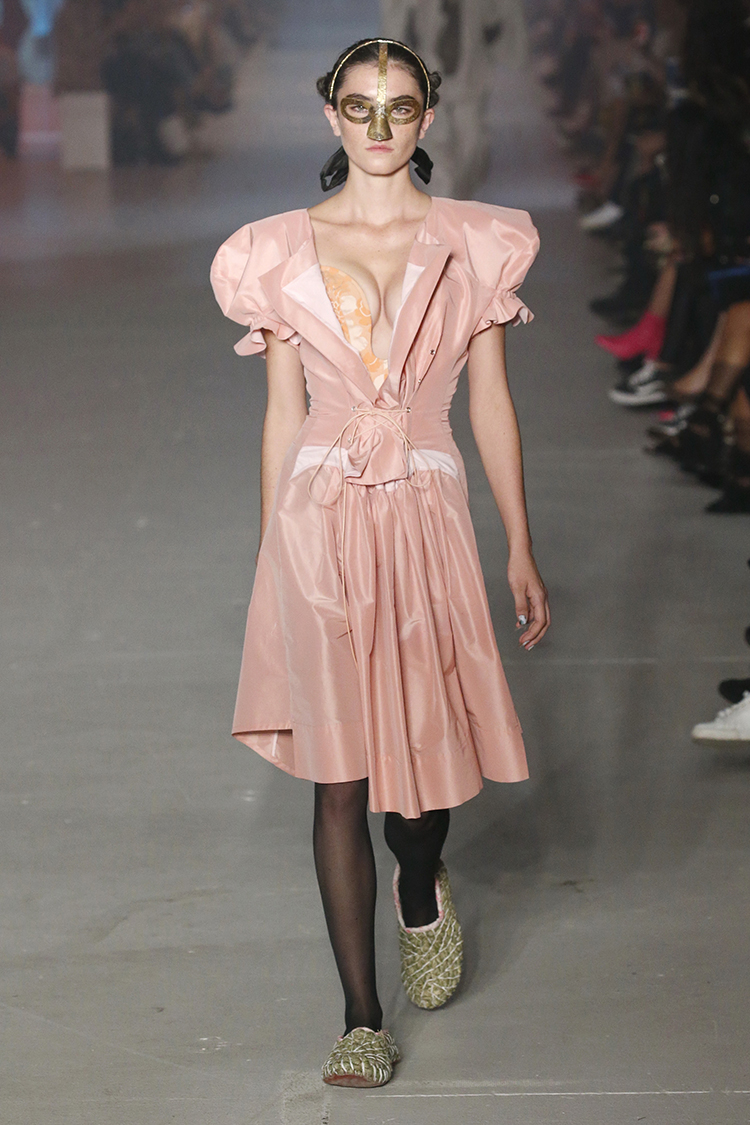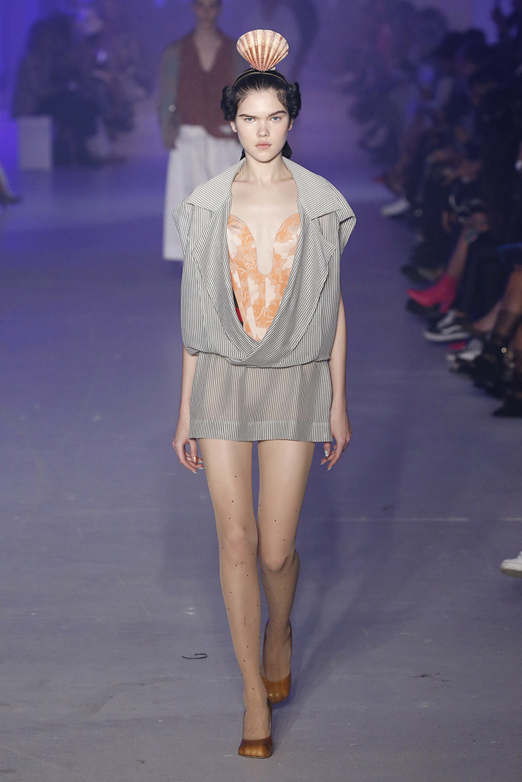 C’est dans un hangar gigantesque de la rue des Poissonniers, à Paris, que Vivienne Westwood a présenté sa collection printemps-été 2020. Un cadre en parfaite adéquation avec le style de la maison. Andreas Kronthaler dévoile ici une collection aussi inspirante qu’inspirée baptisée ‘Rock me Amadeus‘. Il nous invite à la rencontre des pin-ups des années 50 dans un spectacle ambulant où les vêtements se font et se défont, où les formes, aussi fluides que des nuages, affinent des silhouettes souvent fantasques. Les Hommes se mélangent aux animaux et aux machines pour créer un monde à la frontière du réel. Au programme : des chapeaux démesurés, du volume, des drapés, de la superposition …